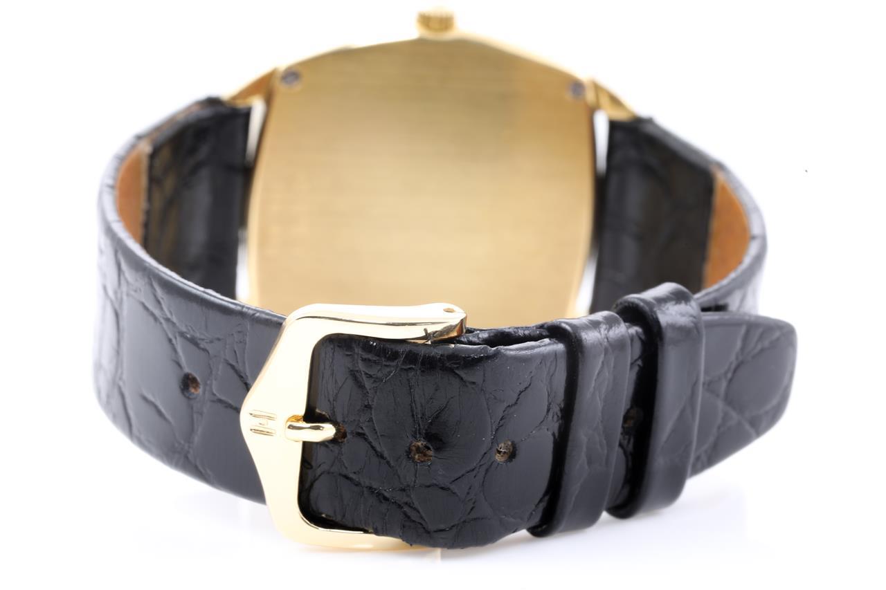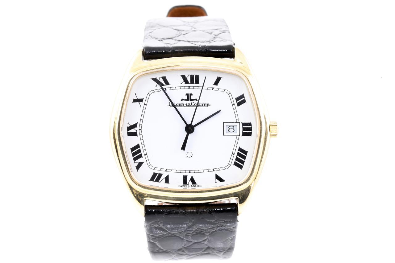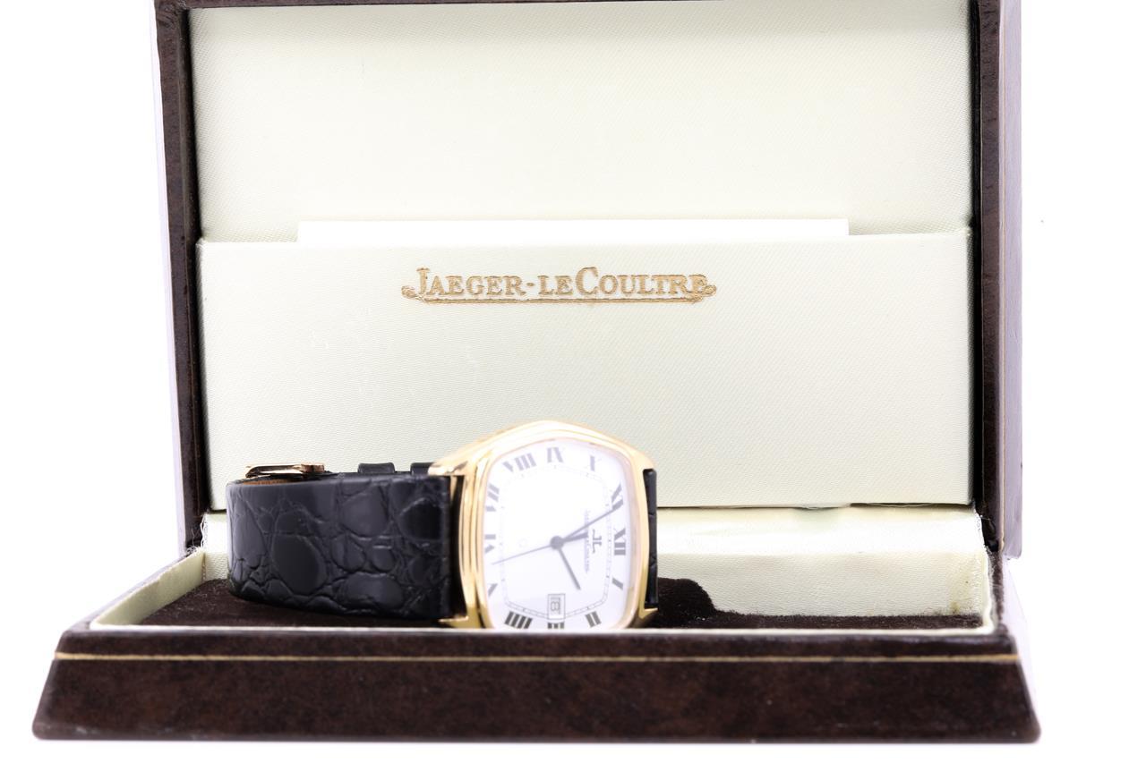 Jaeger LeCoultre 18ct yellow gold quartz watch. White dial, date, case diameter: 35mm x 32mm , length: 19.5cm, Swiss made. Ref# 1400701. With unbranded black leather strap and clasp. With certificate of authenticity, Jaeger LeCoultre international guarantee booklet dated 21/7/1992 and Jaeger LeCoultre box. 3 month FSA warranty. (Pre-owned)