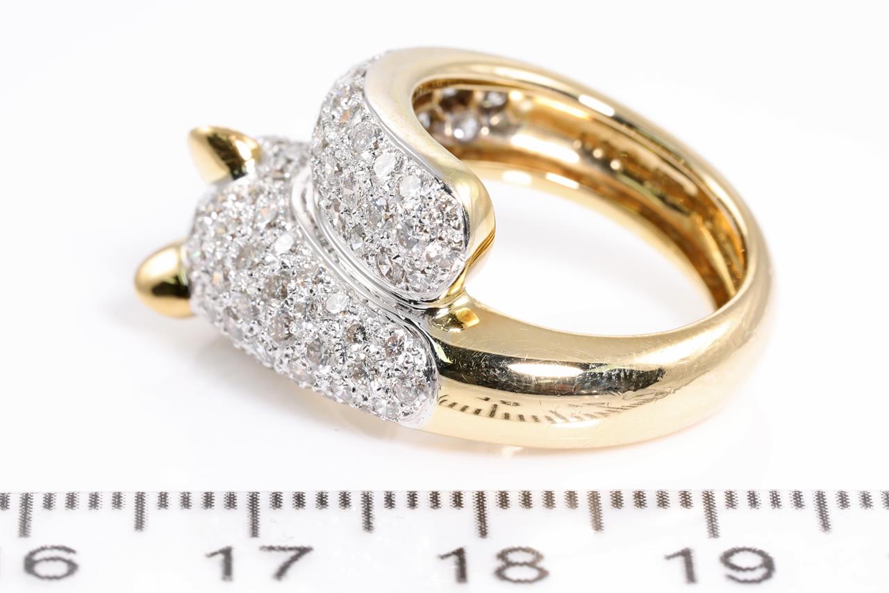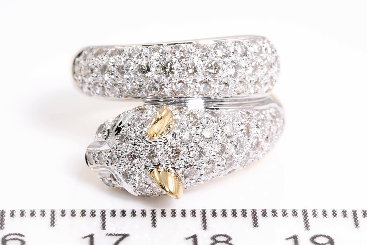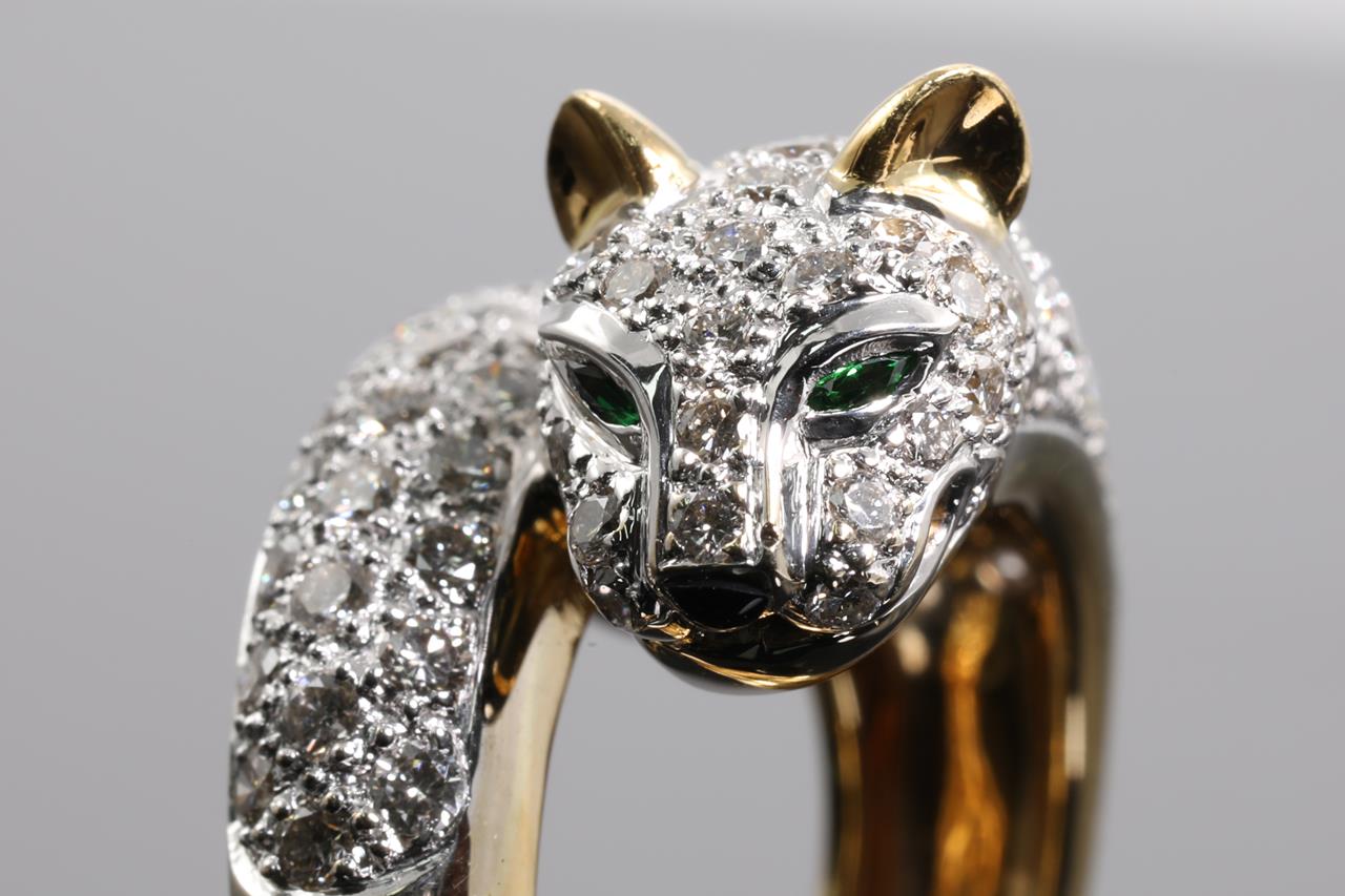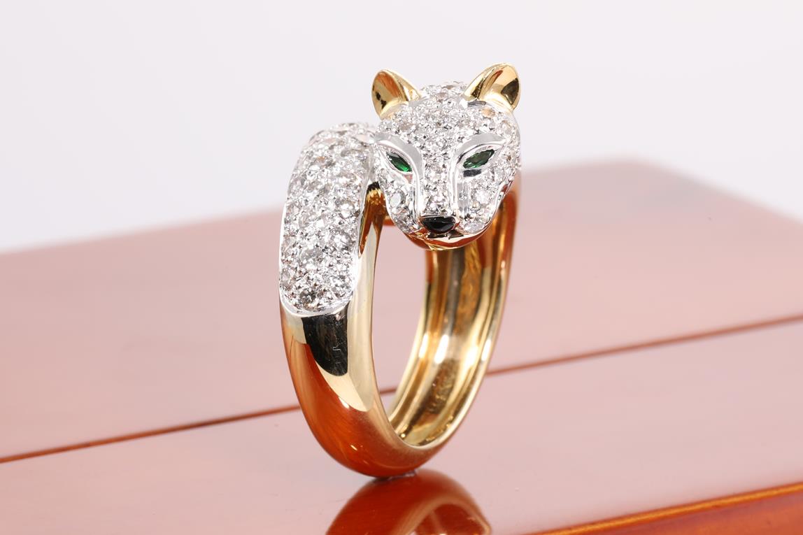 Jaguar design ring with Diamonds totalling 1.90cts (Estimated grading: H VS-SI) and 2 Tsavorite Garnets. 18ct white & yellow gold. Ring size L - ring resizing is not recommended. Weight: 12.9g (Pre-owned)