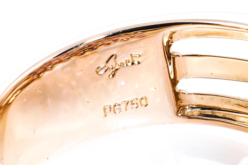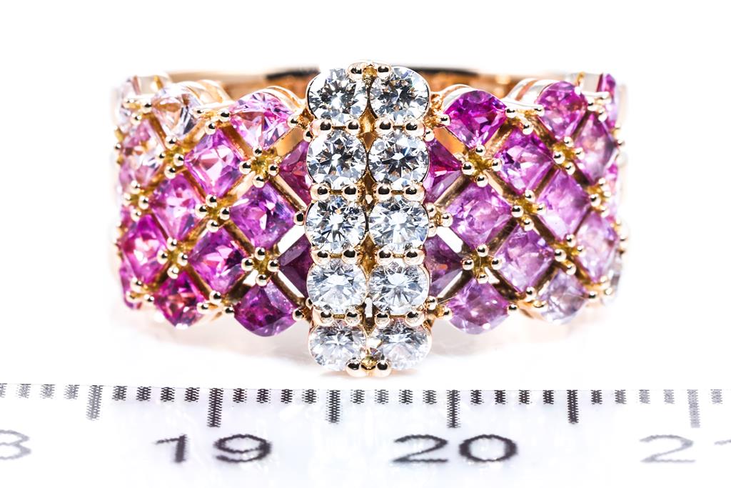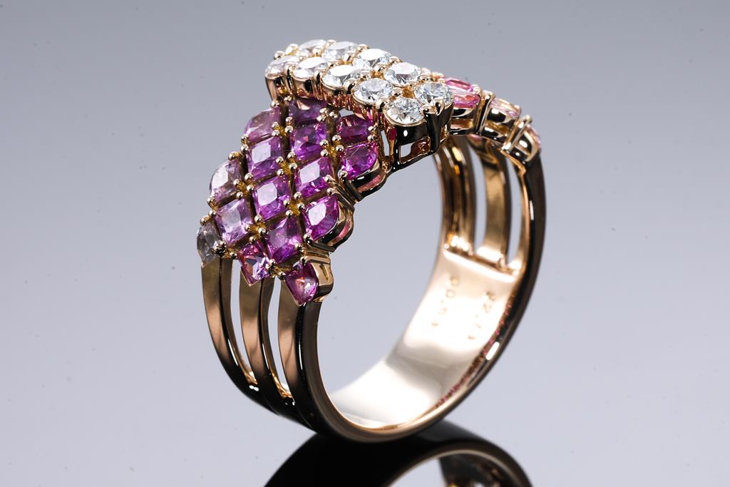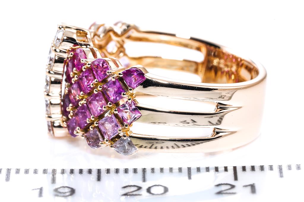 Jeunet ring with princess and fancy cut pink Sapphires totalling 2.73cts (graduating in colour) and 10 round Diamonds totalling 0.53cts (Estimated grading: G SI). 18ct rose gold. Ring size S - ring resizing is not recommended. Weight: 9.2g. (Pre-owned)