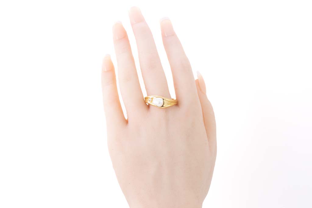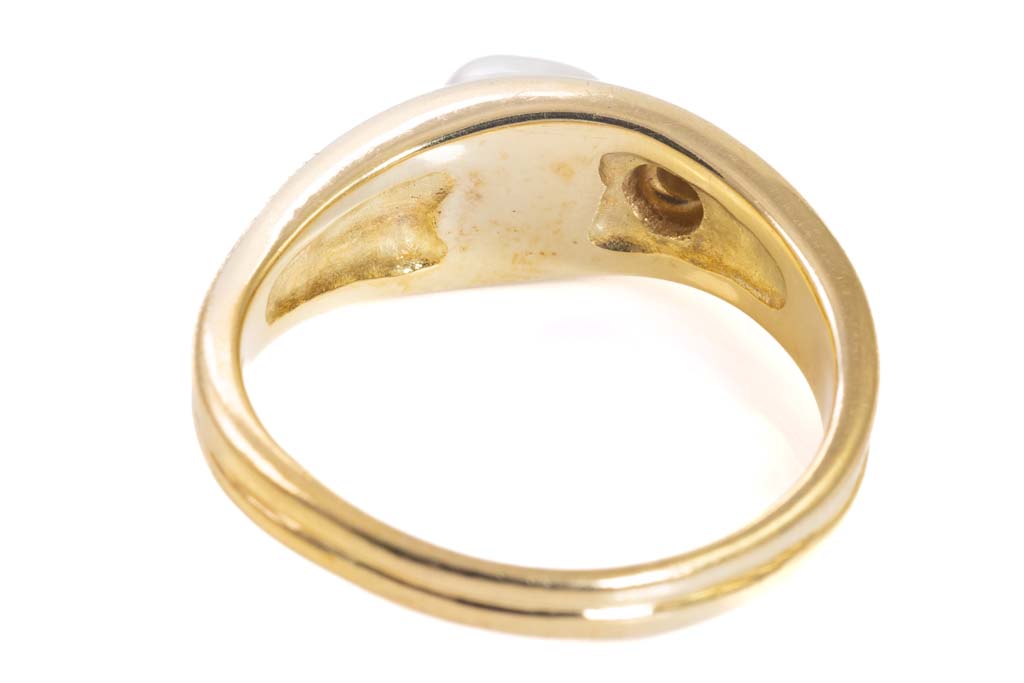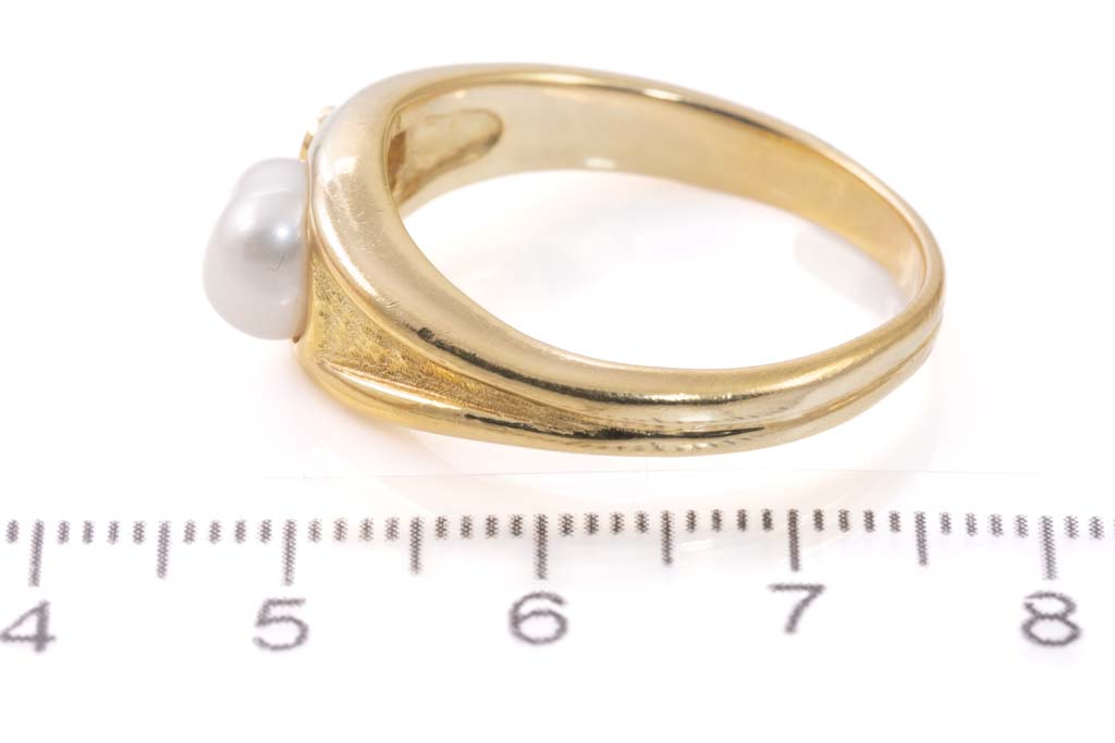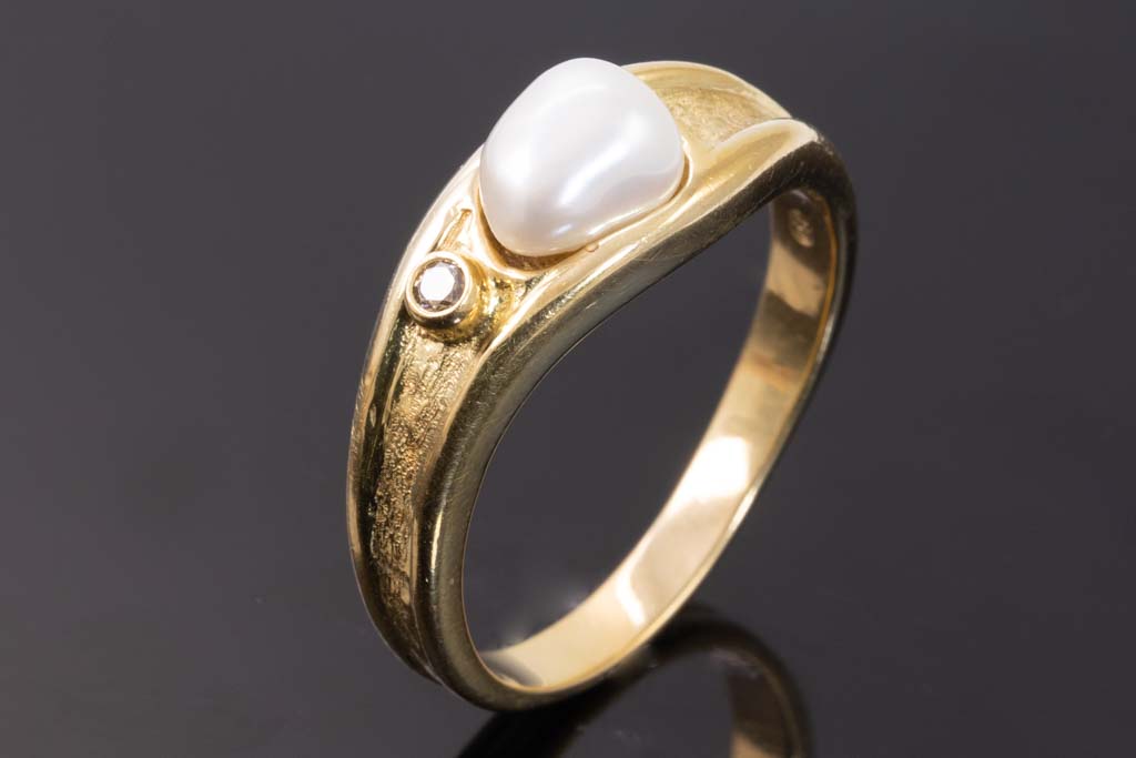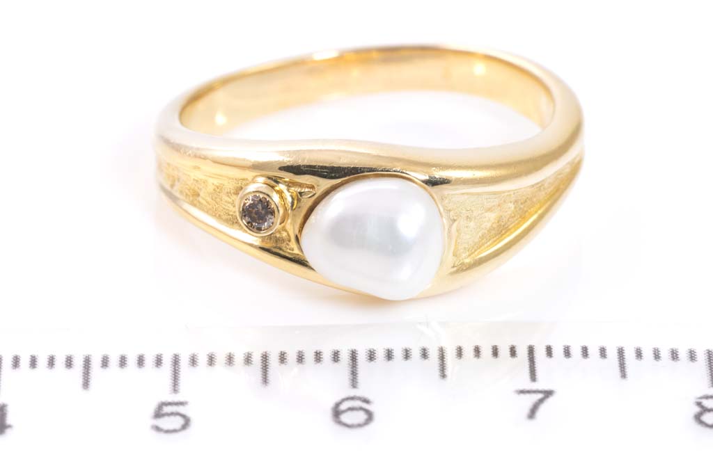 Pearl and Diamond ring with a Keshi Pearl of 8.1mm x 7.0mm and a round Cognac Diamond of approximately 0.04ct. 18ct yellow gold. Ring size: Y1/2. Weight: 10.9g (Pre-owned)
