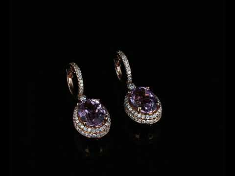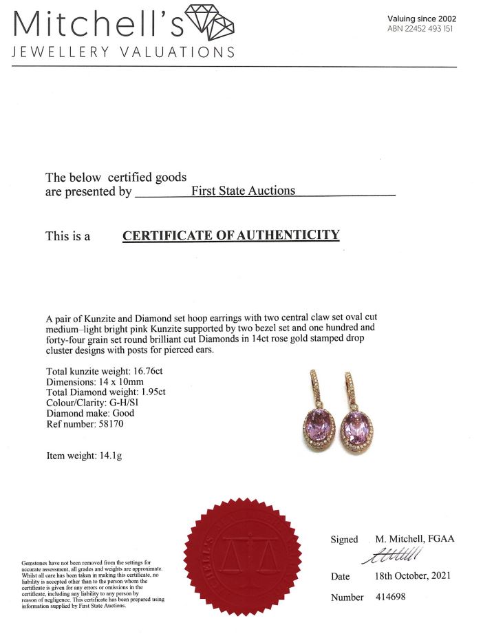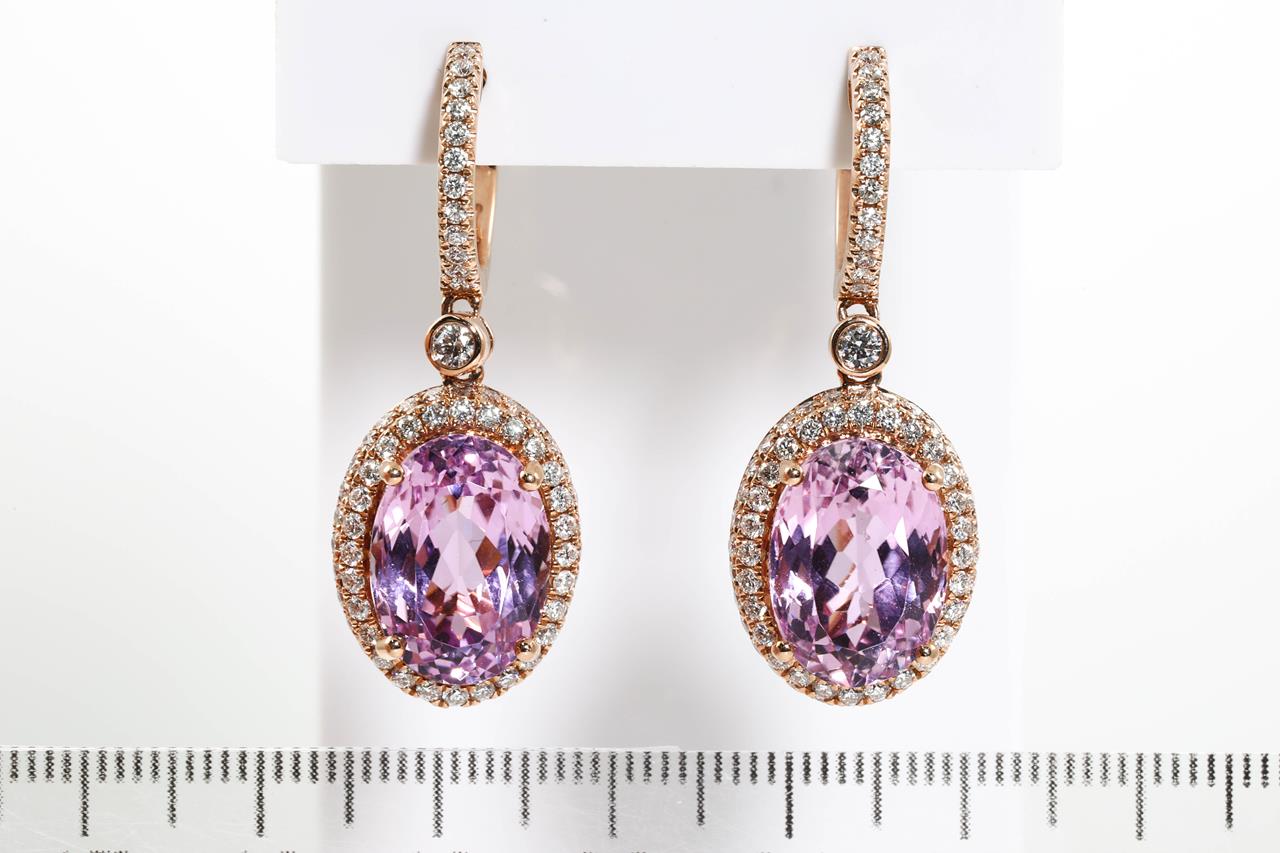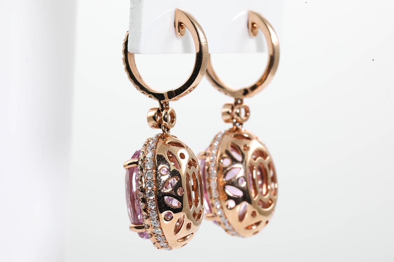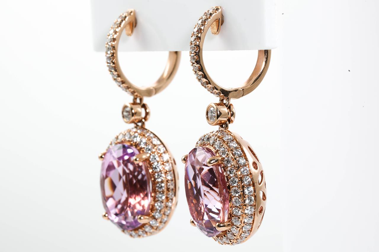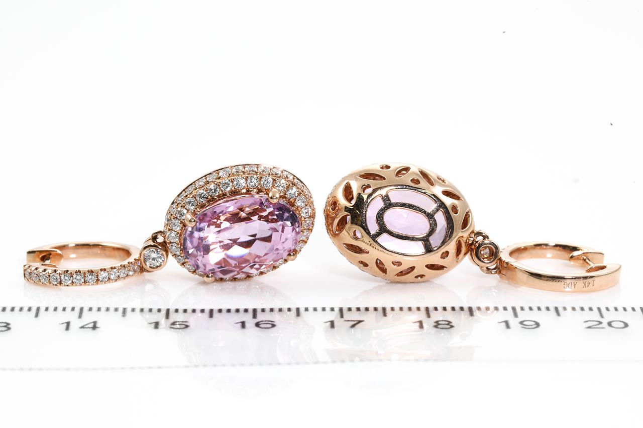 Kunzite and Diamond Earrings with oval Kunzite totalling 16.76cts and Diamonds totalling 1.95cts (Estimated grading: G-H SI). 14ct rose gold. Weight: 14.1g. With certificate #414698. (As new)
