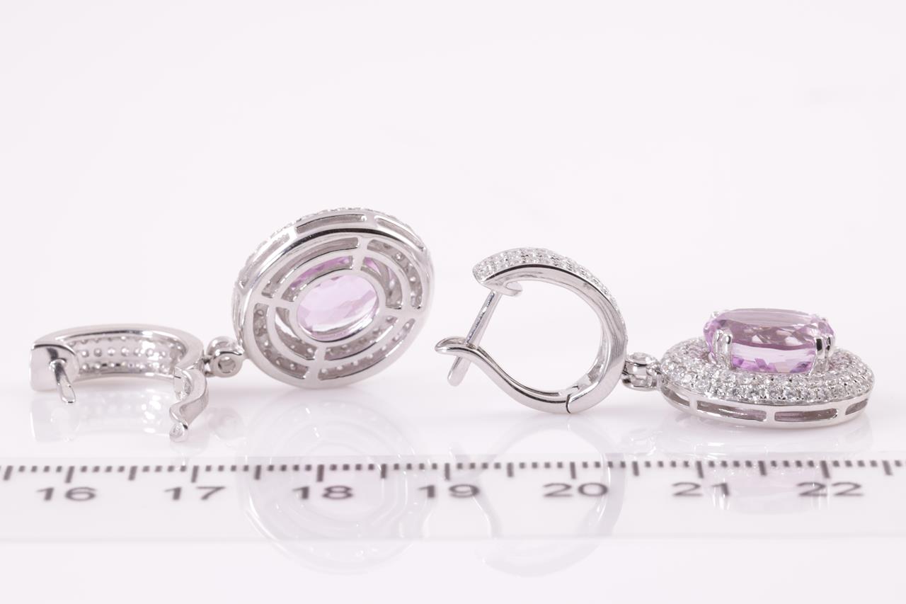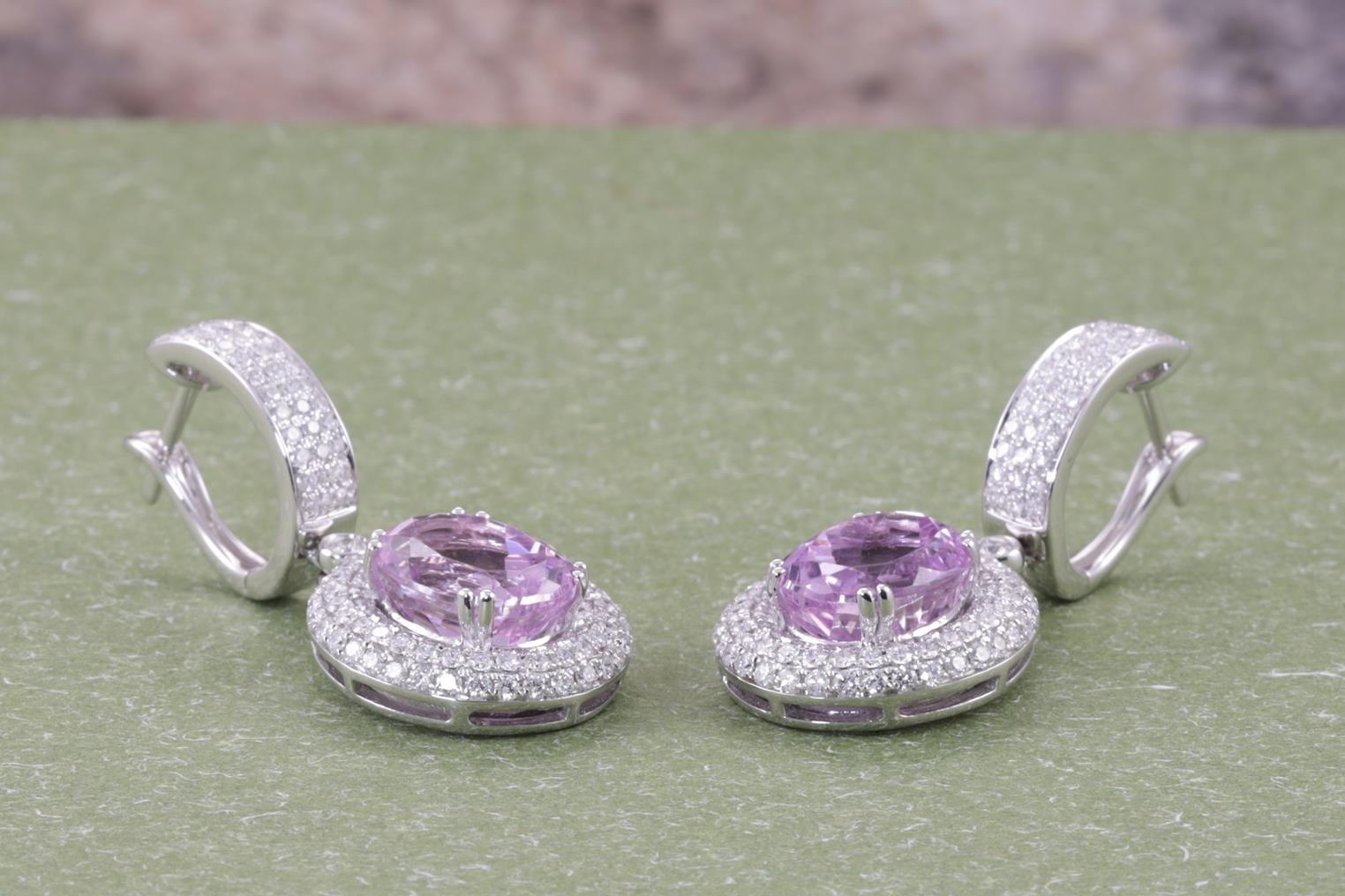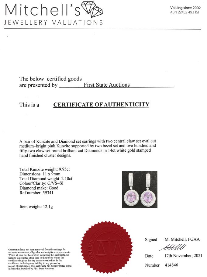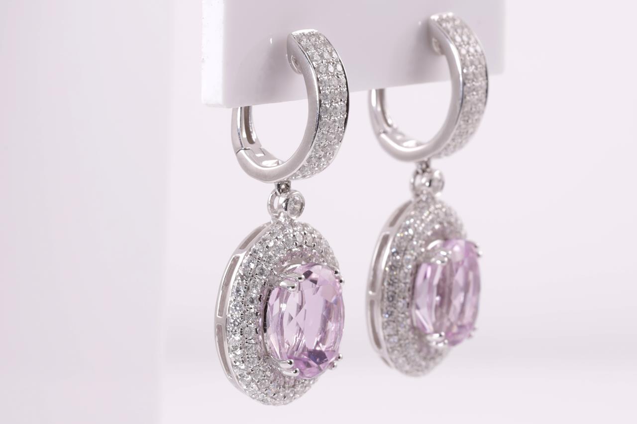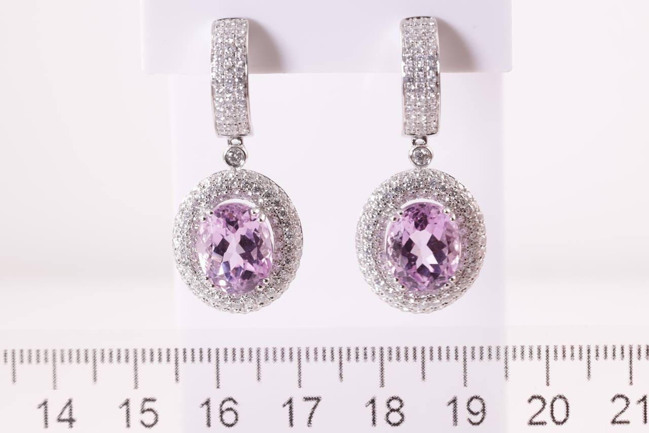 Kunzite and Diamond Earrings with oval shape Kunzites totalling 9.95cts and Diamonds totalling 2.10cts (Estimated grading: G VS-SI) 14ct white gold. Weight: 12.1g. With certificate #414846. (As new)