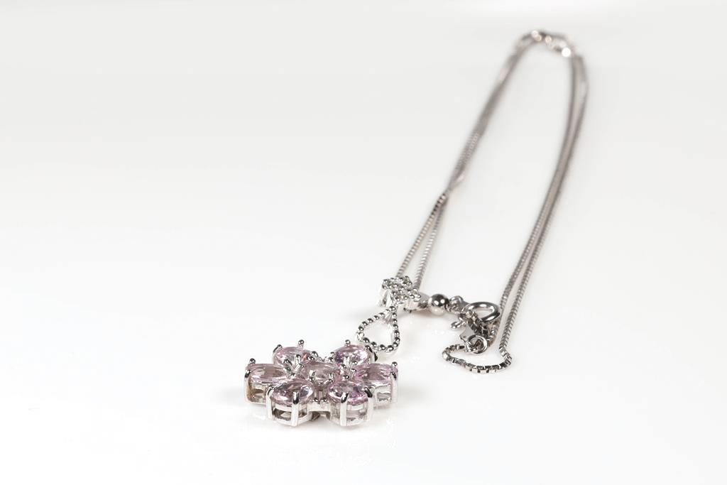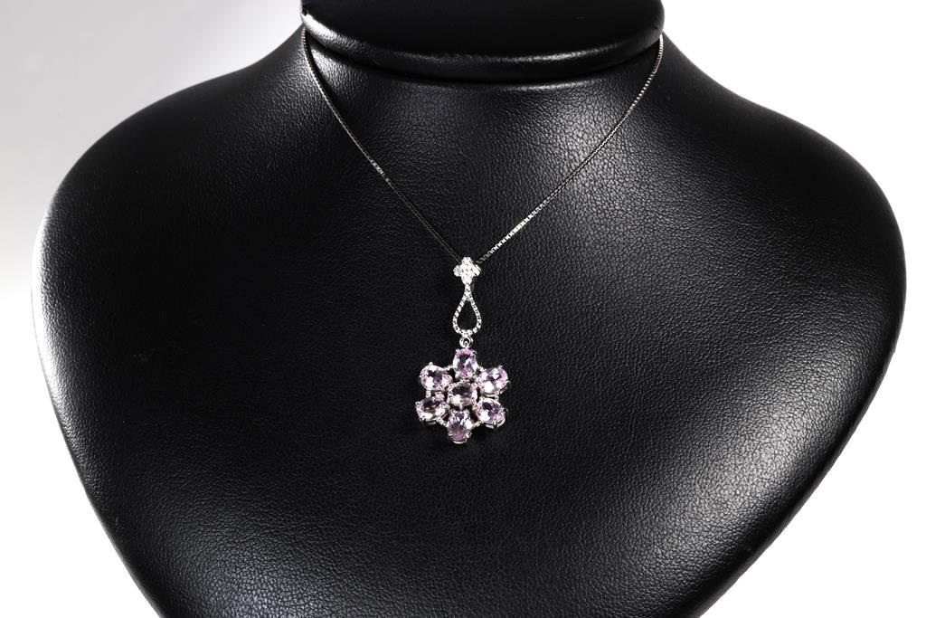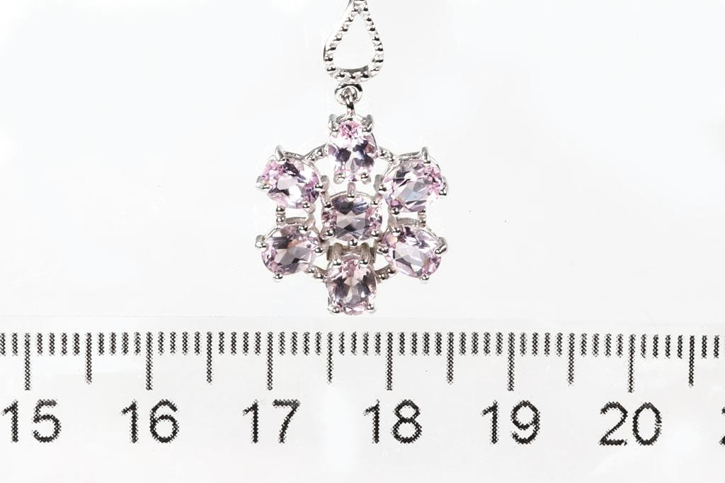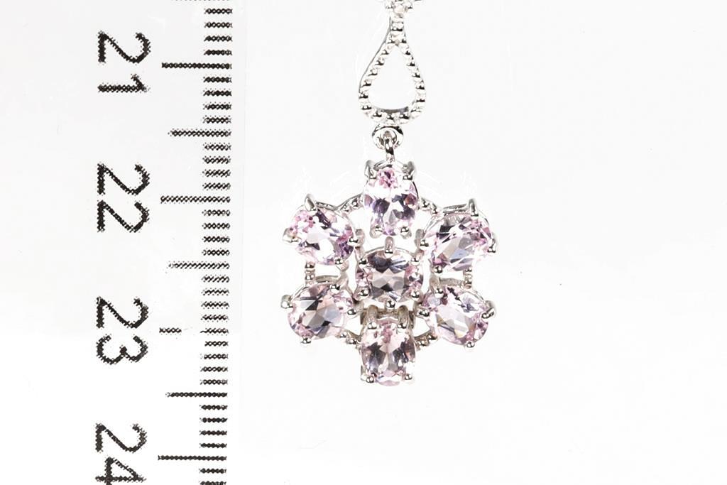 Kunzite and Diamond pendant with oval Kunzite totalling approximately 2.10cts and 4 round Diamonds totalling approximately 0.02cts. 14ct white gold with 44cm adjustable 18ct gold chain. Weight: 5.1g. (As new)