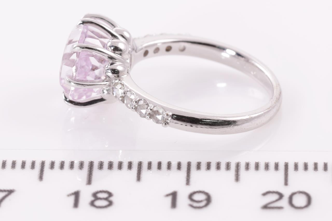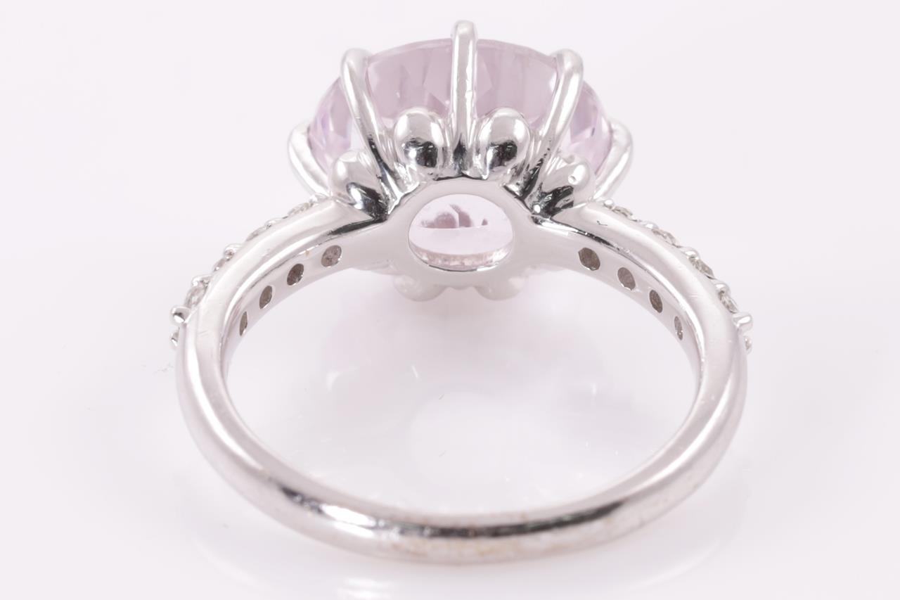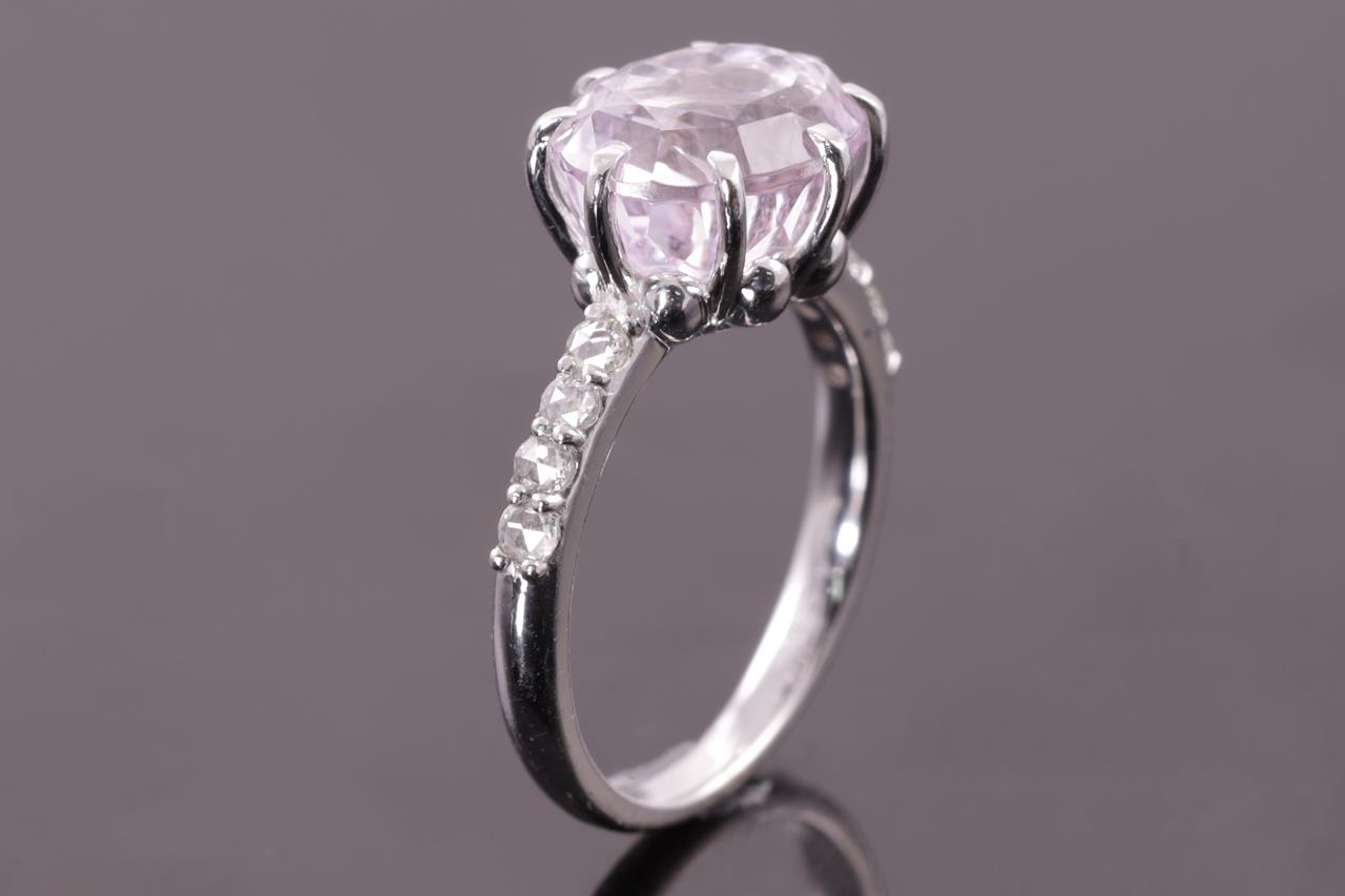 Kunzite and Diamond Ring with an oval Kunzite of approximately 3.40ct and rose cut Diamonds totalling 0.17cts. 18ct white gold. Ring size I - ring resizing is not recommended. Weight: 3.9g (Pre-owned)
