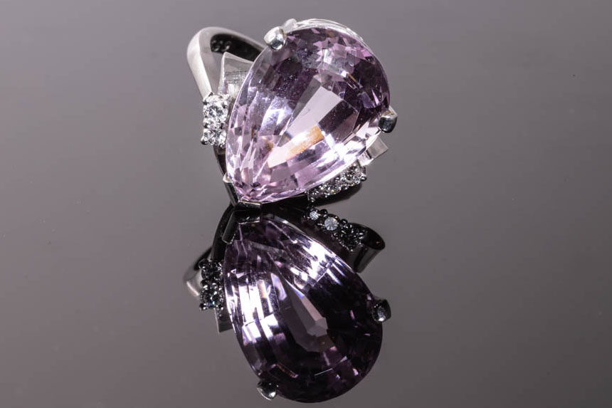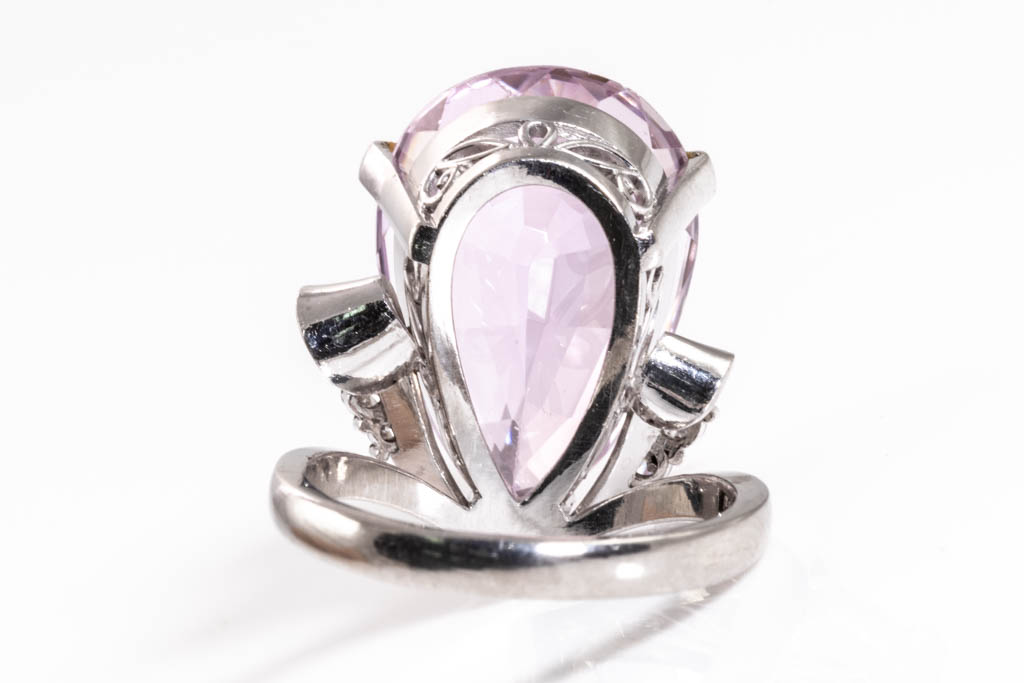 Kunzite and Diamond ring with pear shape Kunzite of 16.89ct and Diamonds totalling 0.14cts. Platinum. Ring size K1/2. Weight: 11.9g. (Pre-owned)