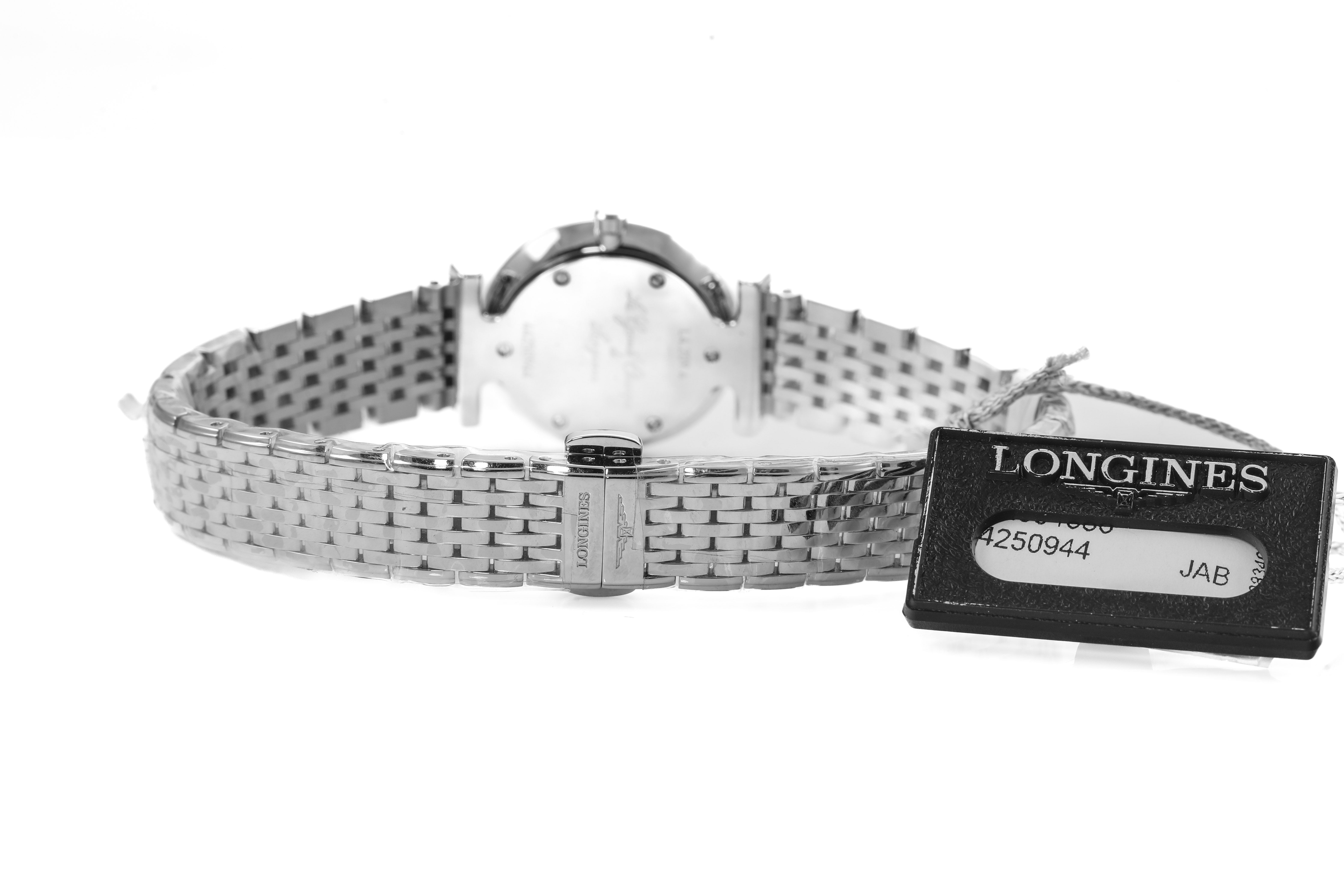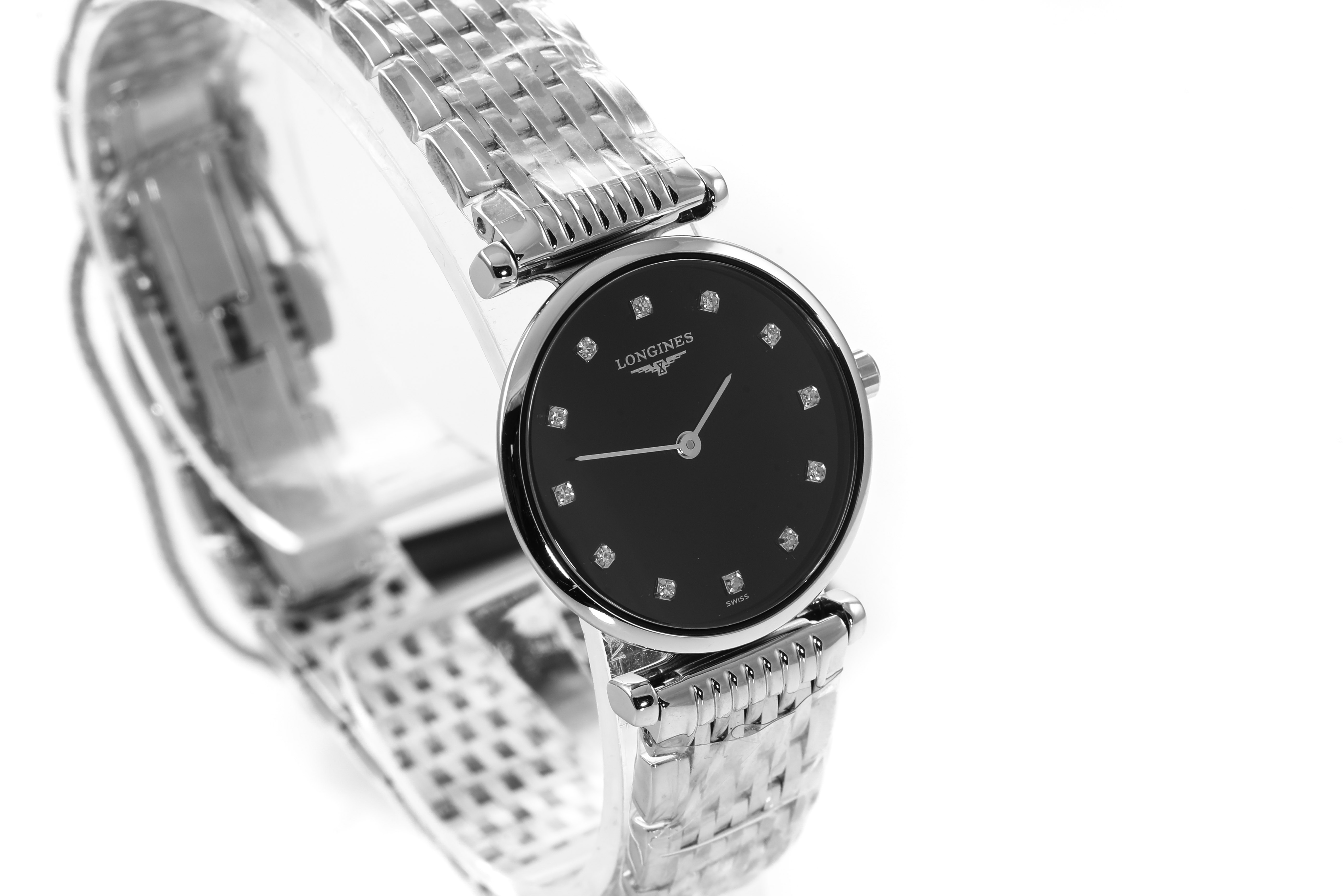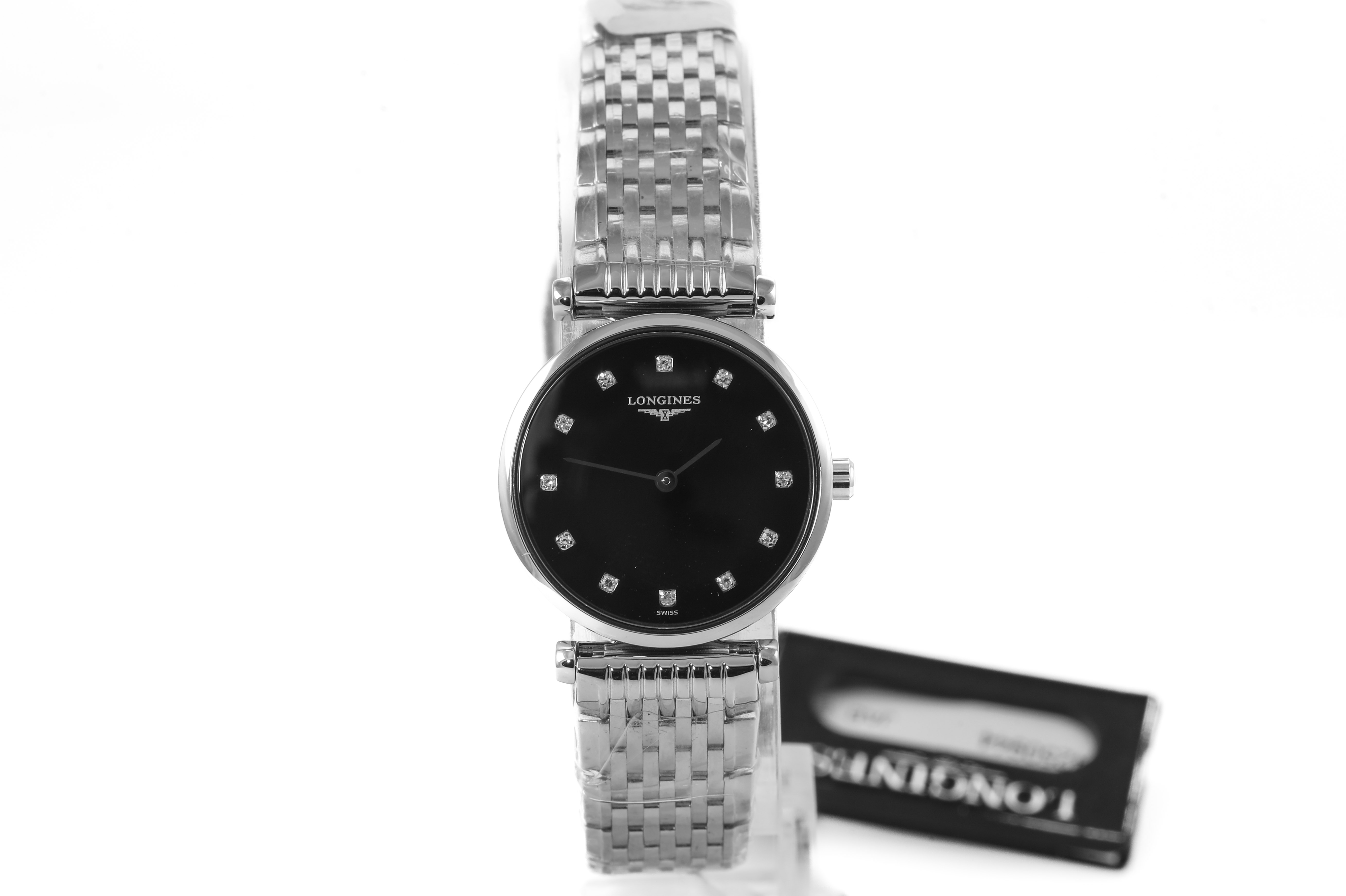 Longines La Grande Classique stainless steel quartz ladies watch. Black dial, Diamond indicators, case diameter: 24mm, wrist size: 18cm, Swiss made. Ref# L42094586. With Longines stainless steel bracelet and clasp. With Longines International Warranty Card - to be registered online and instructions will be provided. With Longines Diamond Certificate card and Longines box. (As New, Note: minor scratches on case due to display stock and bracelet in original wrapping)