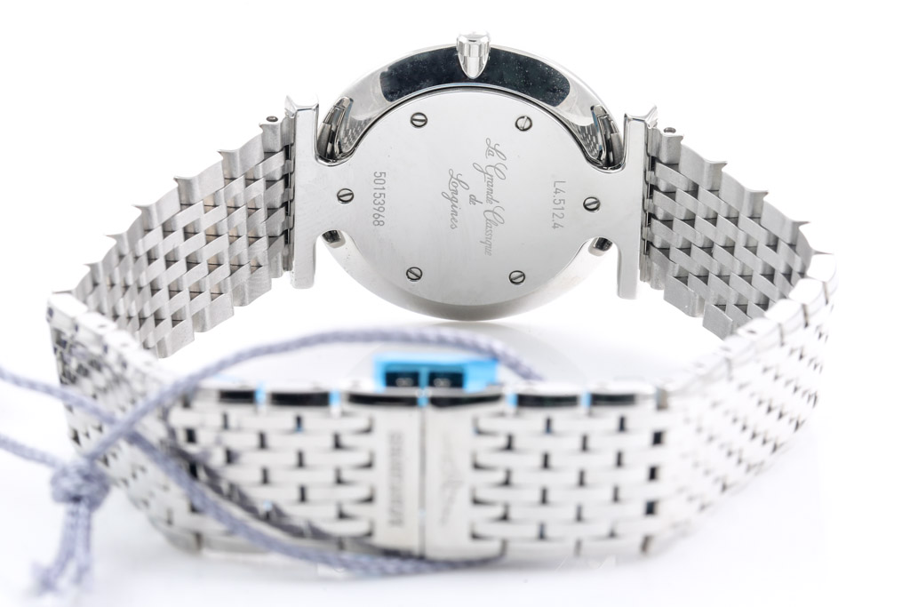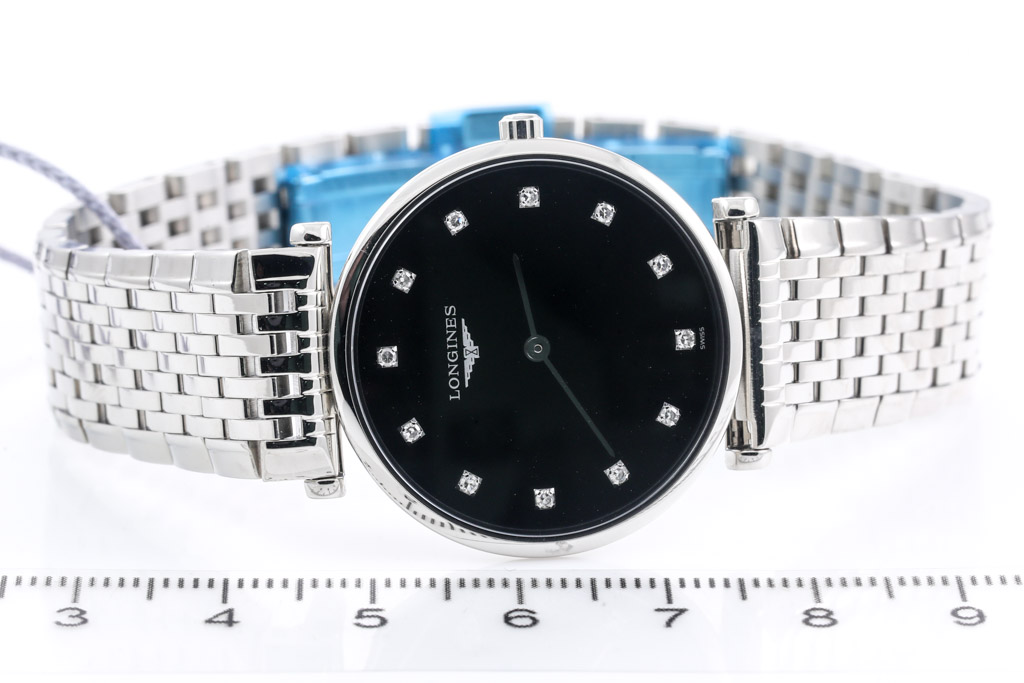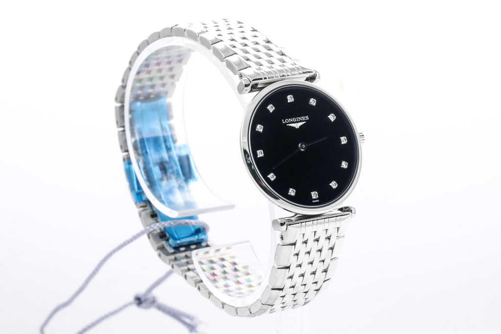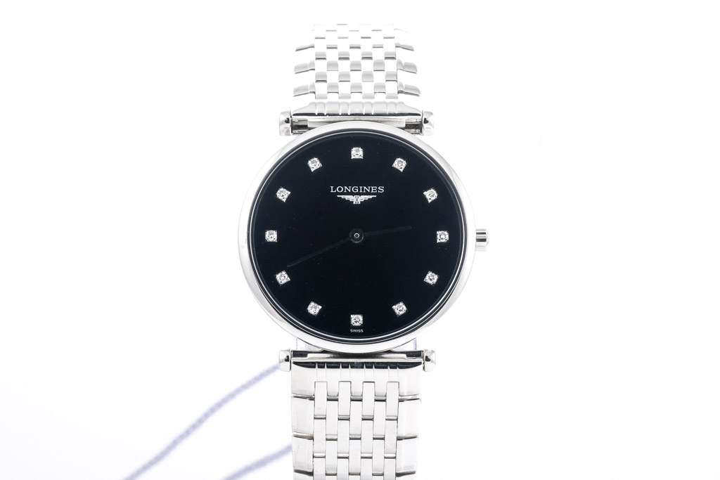 La Grande Classique De Longines stainless steel quartz ladies watch. Black dial, Diamond indicators, case diameter: 29mm, wrist size: 18cm, Swiss made. Ref# L45124586. With Longines stainless steel bracelet and clasp. With Longines International Warranty card, Longines Diamond Certificate card and Longines box. Longines 2 year warranty applies. (As New, Note: minor scratches on case and bracelet due to being display stock)