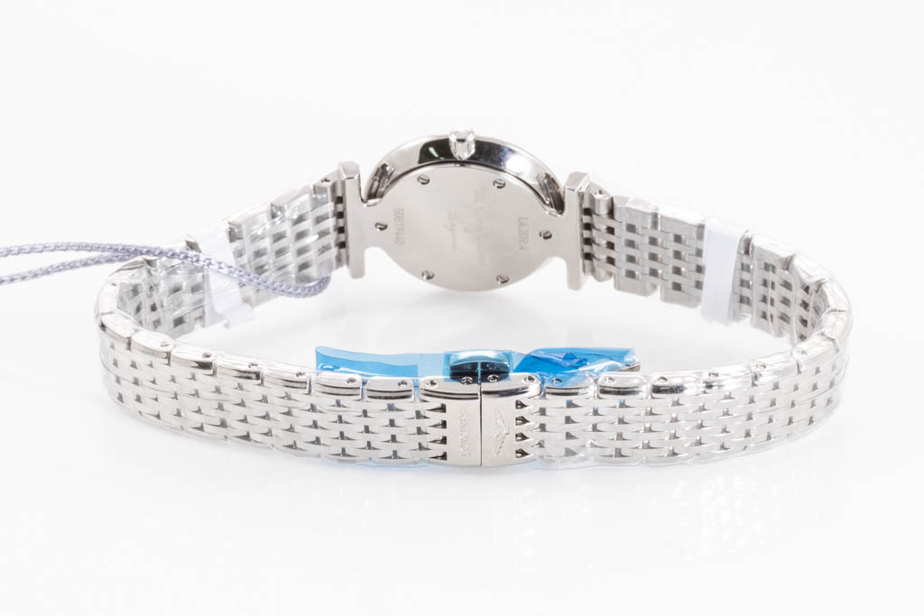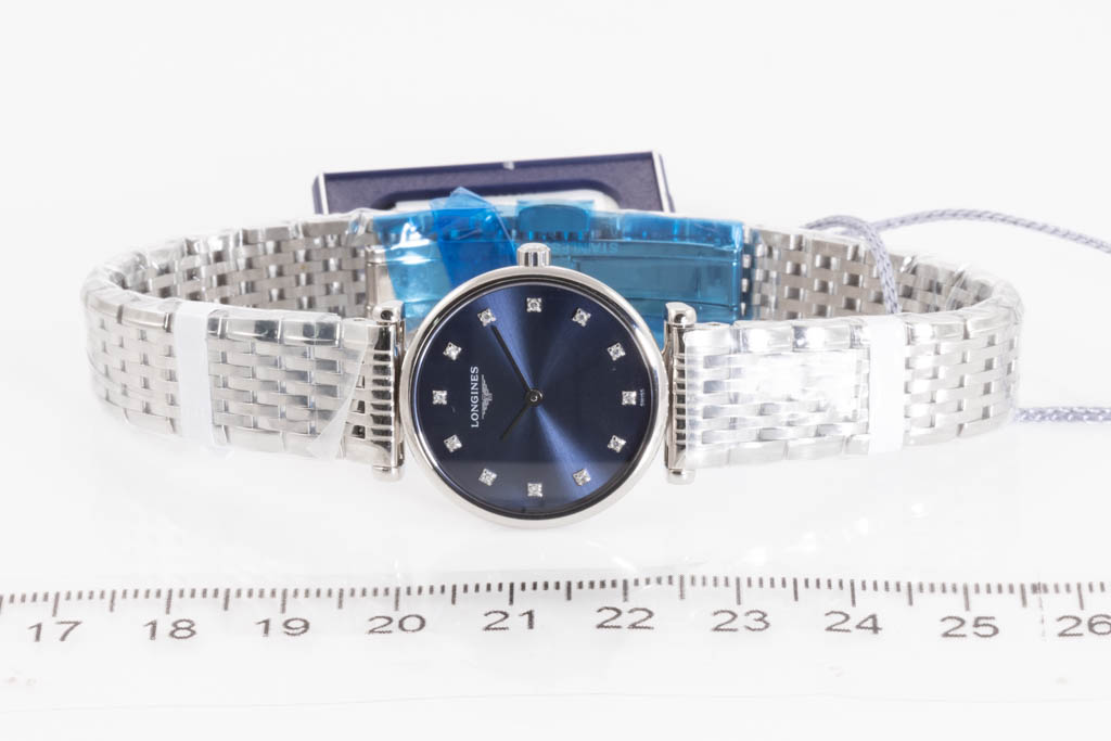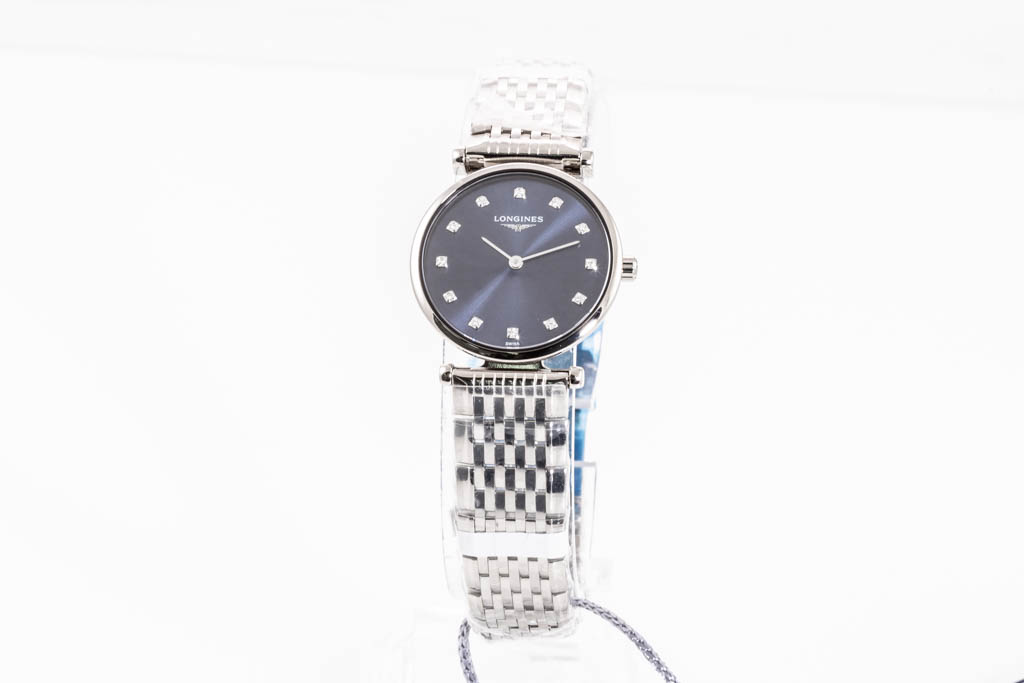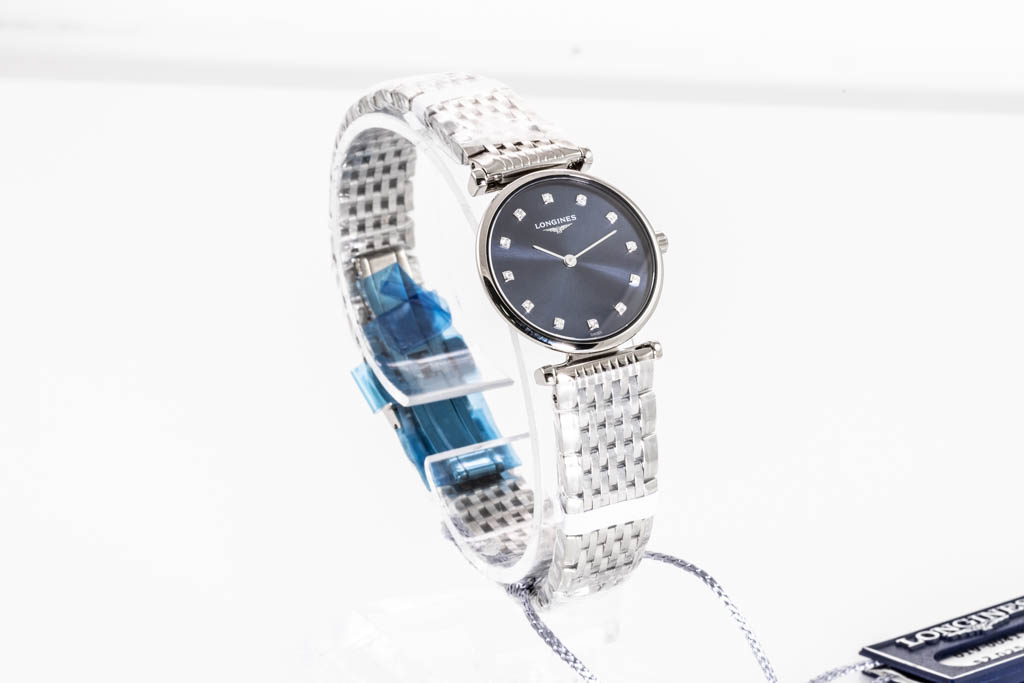 Longines La Grande Classique stainless steel quartz ladies watch. Blue dial, diamond indicators, case diameter: 24mm, wrist size: 18cm, Swiss made. Ref# L42094976. With Longines stainless steel bracelet and clasp. With Longines International Warranty card - to be registered online, details will be provided. With Longines Diamond Certificate card and Longines box. (As New, Note: minor scratches on case due to being display stock and bracelet in original wrapping)
