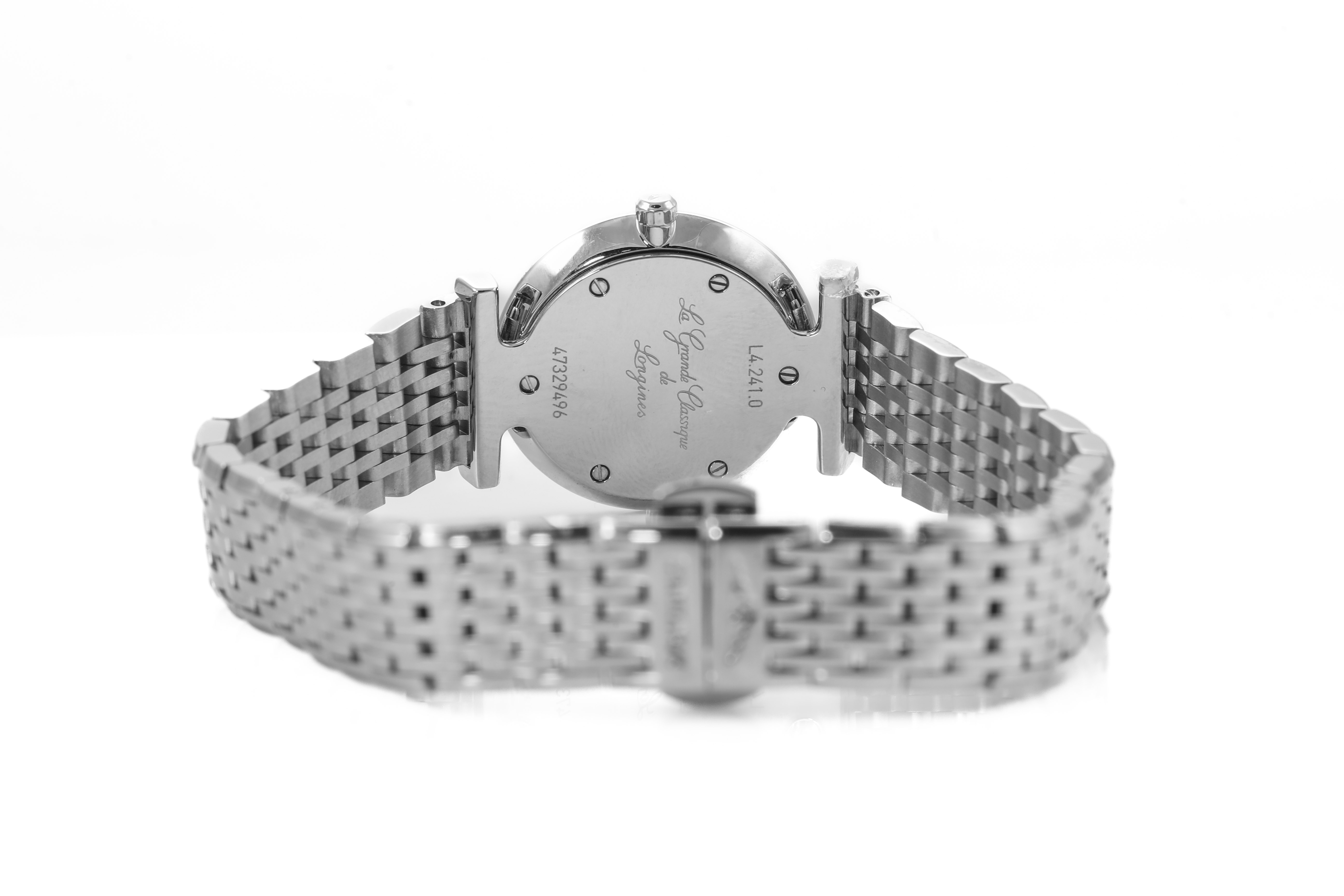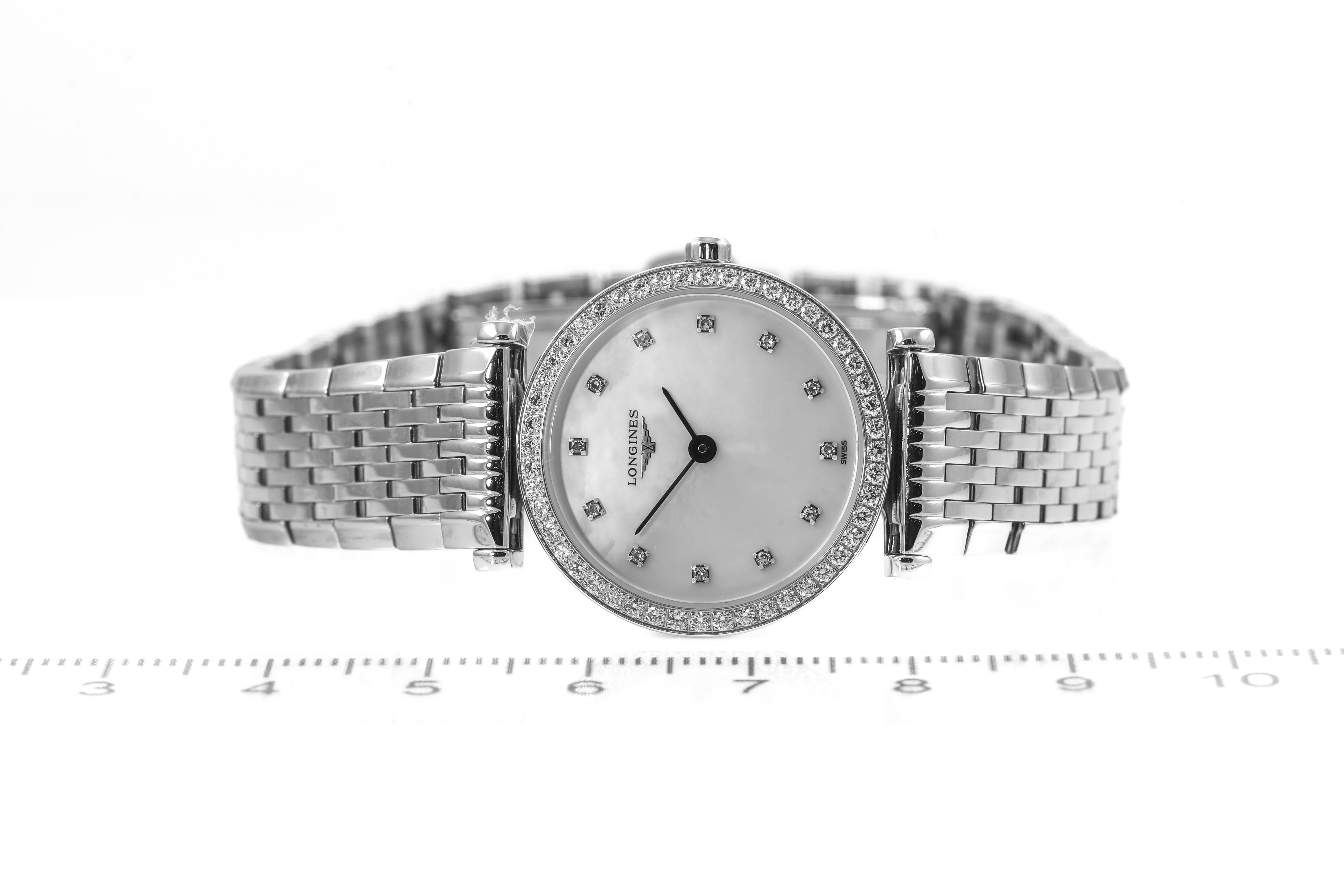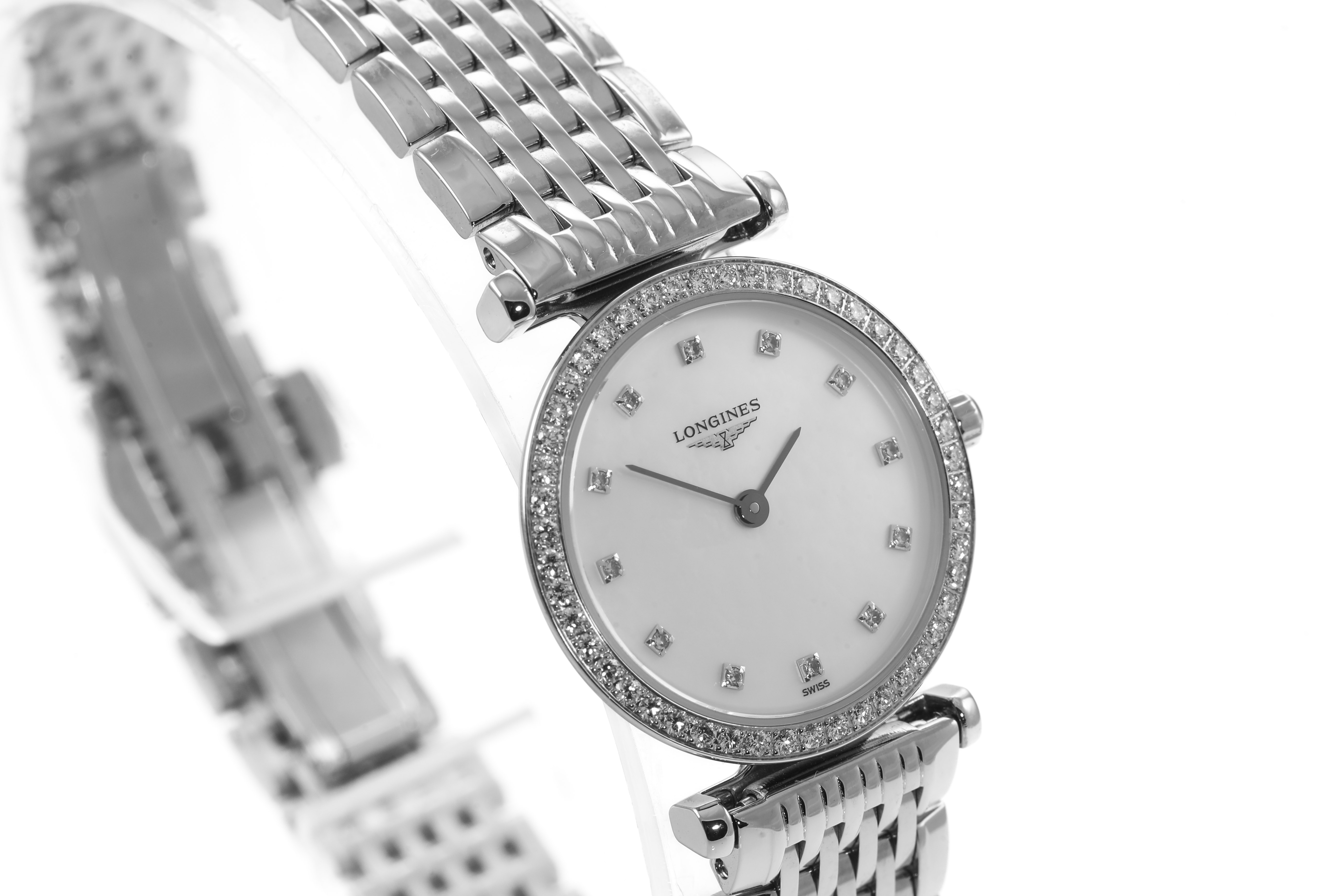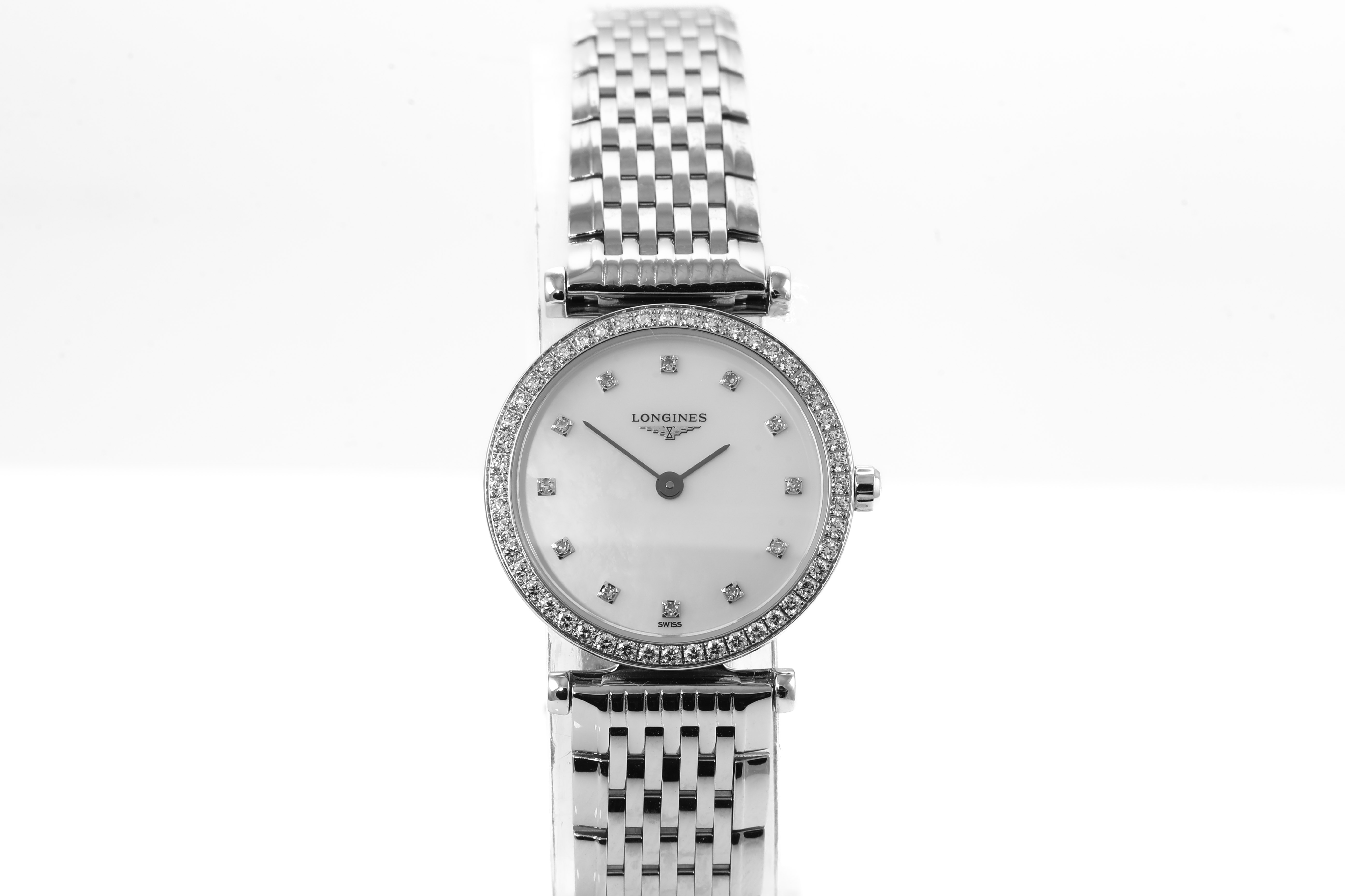 Longines La Grande Classique stainless steel quartz ladies watch. Mother of Pear dial, Diamond indicators, Diamond set bezel, case diameter: 24mm, wrist size: 18cm, Swiss made. Ref # L42410806. With Longines stainless steel bracelet and clasp. With Longines International Warranty card - to be registered online and details will be provided. With Longines box. (As new, Note: minor scratches on case and bracelet due to being display stock)