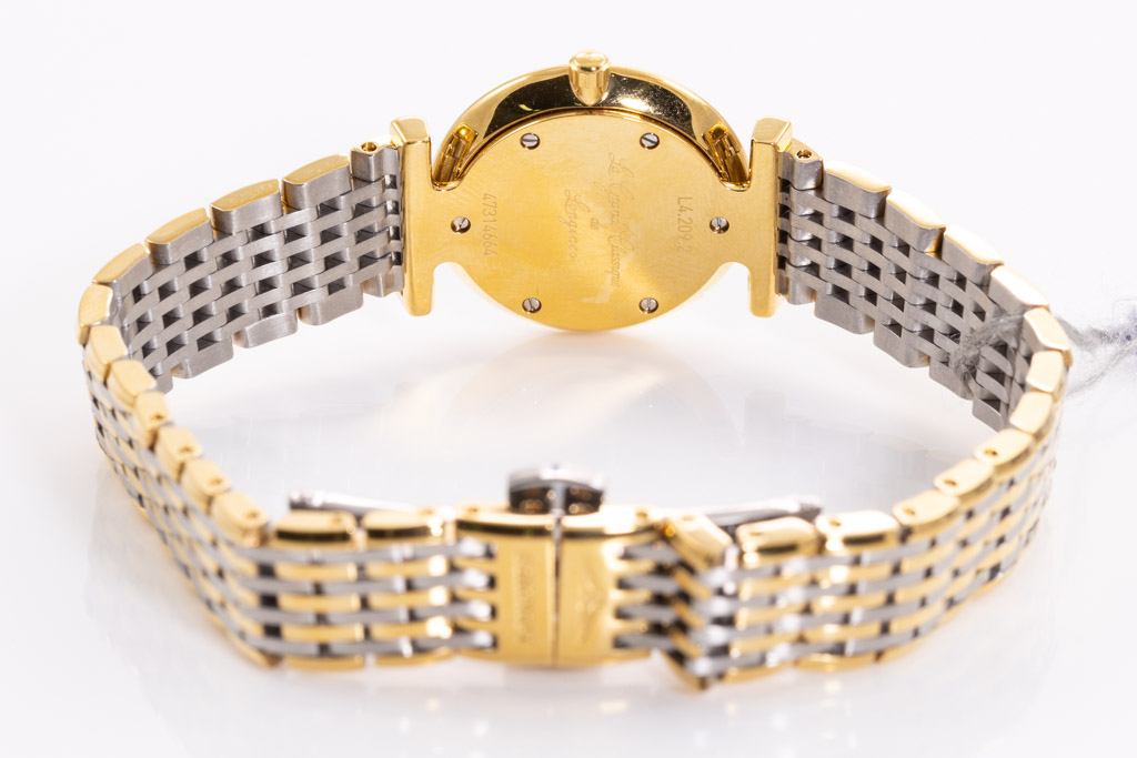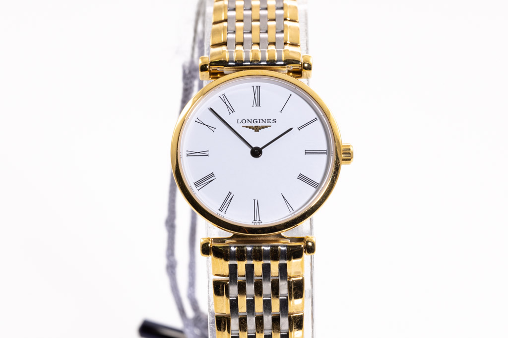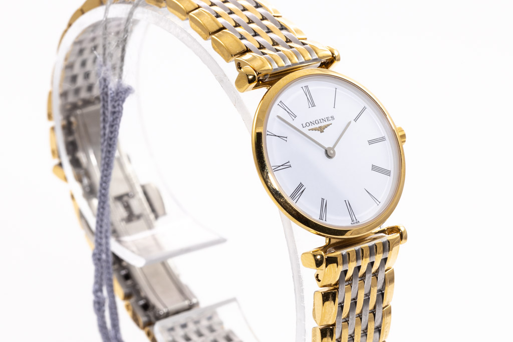 La Grande Classique De Longines stainless steel and yellow PVD coating quartz ladies watch. White dial, case diameter: 24mm, wrist size: 18cm, Swiss made. Ref# L42092117. With Longines two-tone stainless steel bracelet and clasp. With Longines box. Longines 2- year warranty applies. (As new, note: minor scratches on case and bracelet due to being display stock)