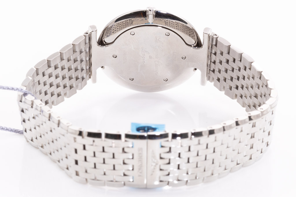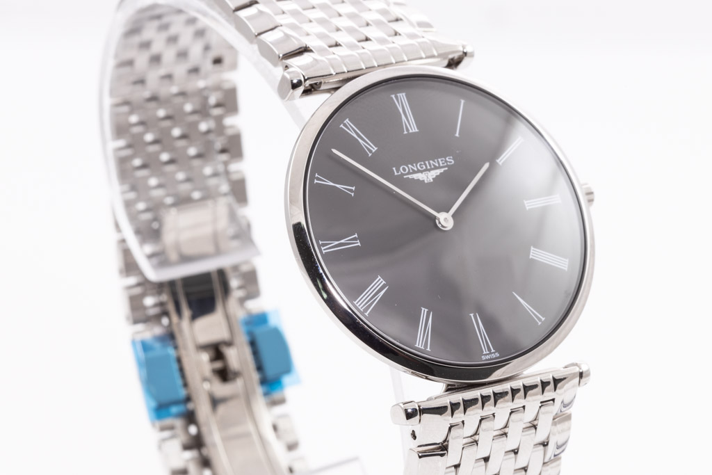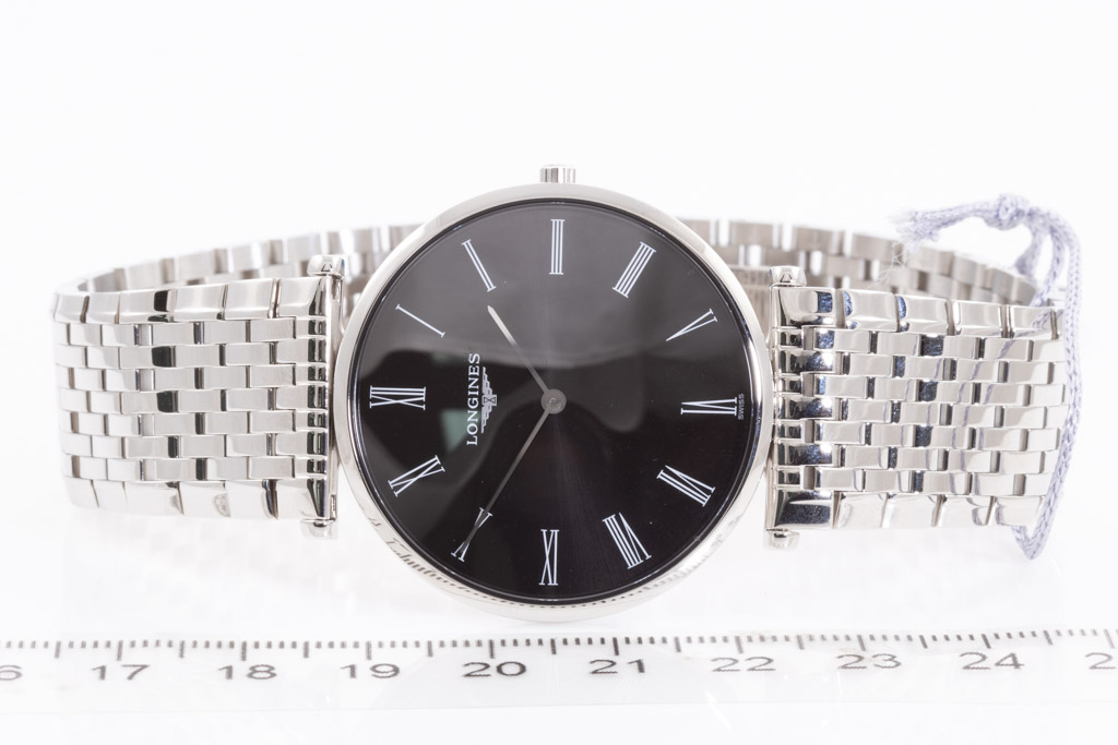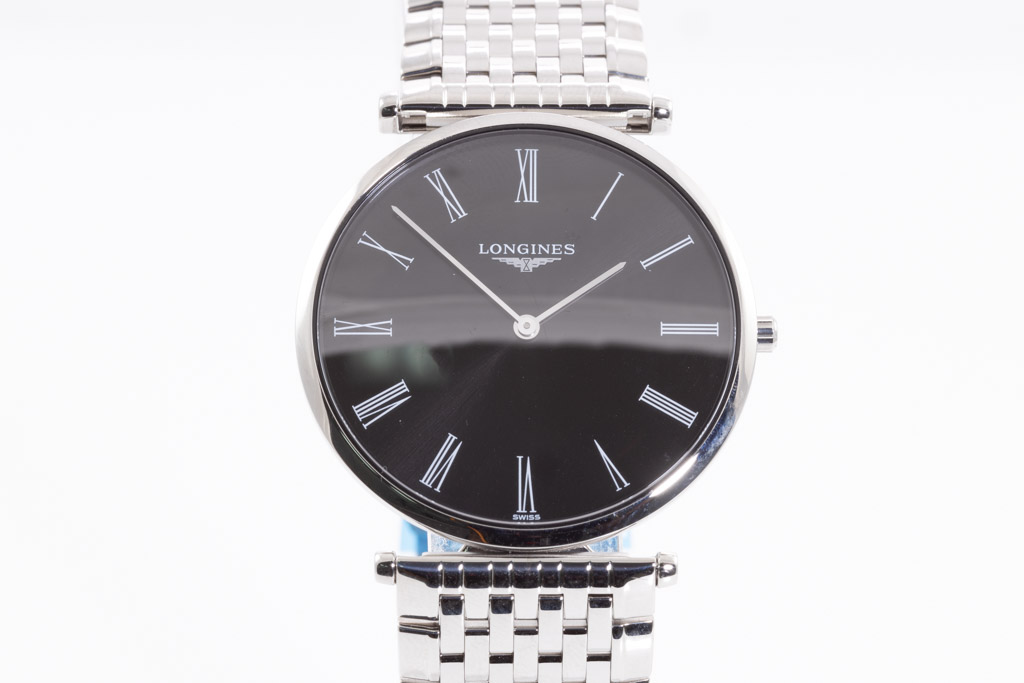 La Grande Classique De Longines stainless steel quartz men's watch. Black dial, case diameter: 36mm, wrist size: 21.5cm, Swiss made. Ref# L47554516. With Longines stainless steel bracelet and clasp. With Longines International Warranty card and Longines box. Longines 2 year warranty applies. (As New, Note: minor scratches on case and bracelet due to being display stock)