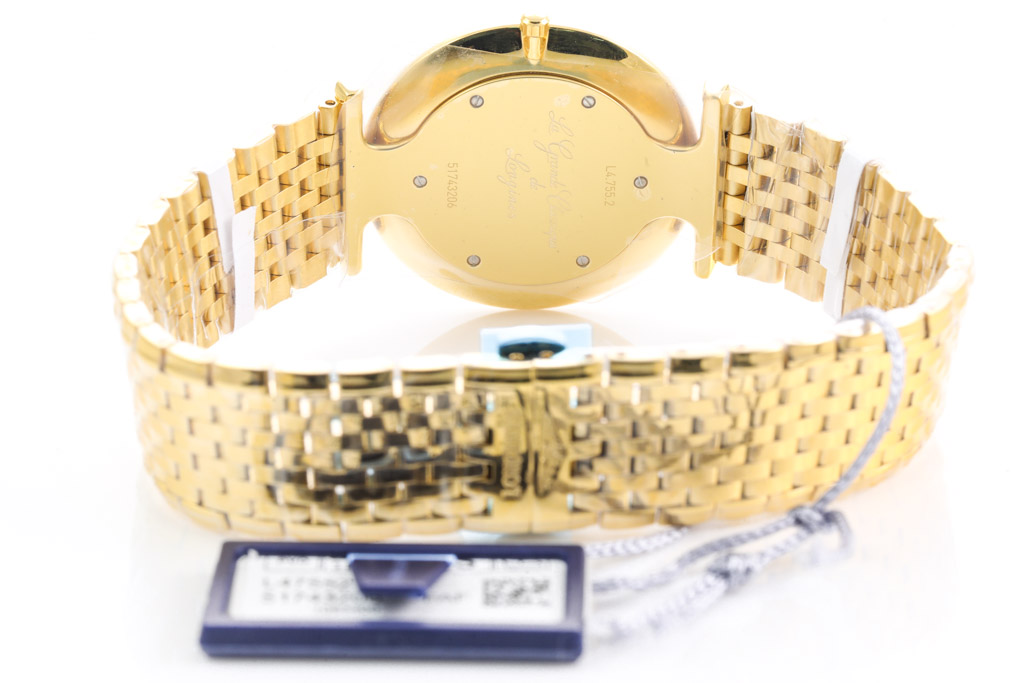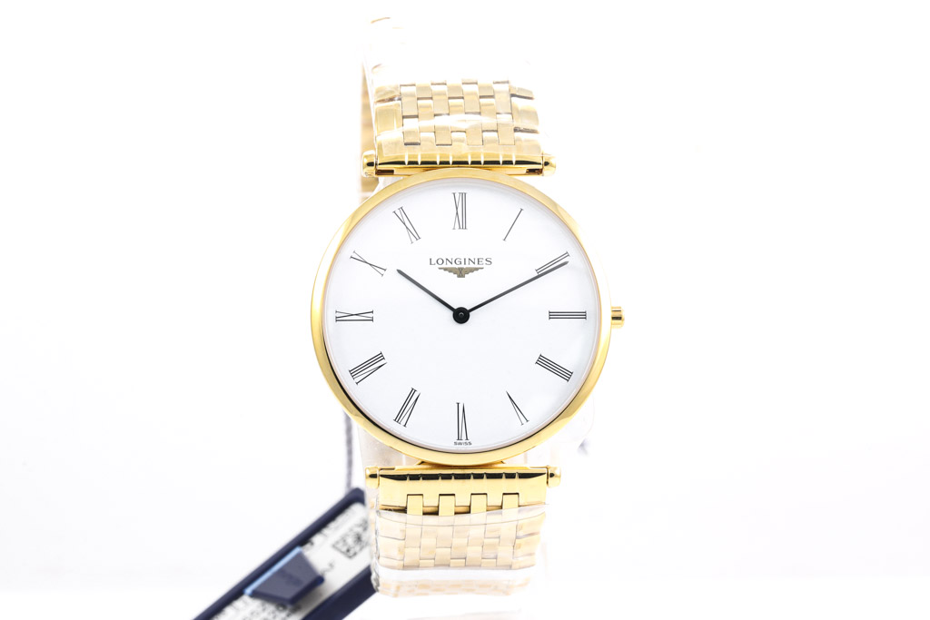 La Grande Classique De Longines yellow gold PVD coated stainless steel quartz mens watch. White dial, case diameter: 36mm, wrist size: 21cm, Swiss made. Ref# L47552118. With Longines yellow gold PVD coated stainless steel bracelet and clasp. With Longines International Warranty card and Longines box. Longines 2 year warranty applies. (As New, Note: minor scratches on case due to being display stock and bracelet in original wrapping)