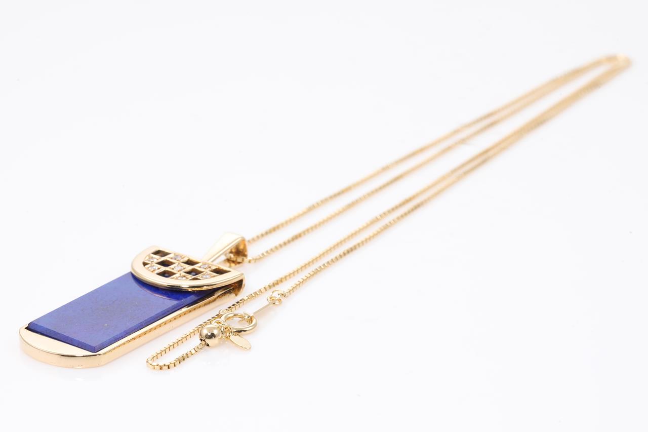 Lapis Lazuli and Diamond Pendant with Lapis Lazuli of 27mm x 12mm and round Diamonds totalling 0.07cts. 18ct yellow gold with adjustable 44cm chain. Weight: 9.6g. (Pre-owned)