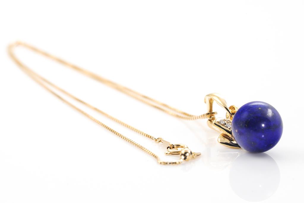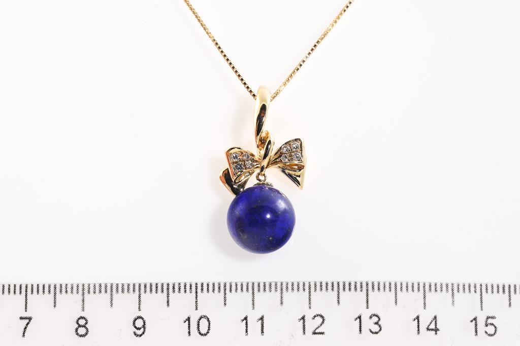 Lapis lazuli and Diamond enhancer bow design pendant with a spherical Lapis Lazuli of 12mm and round Diamonds totalling 0.09cts. 18ct yellow gold with adjustable 44cm chain. Weight: 8.0g. (Pre-owned)