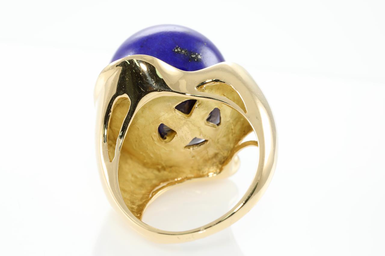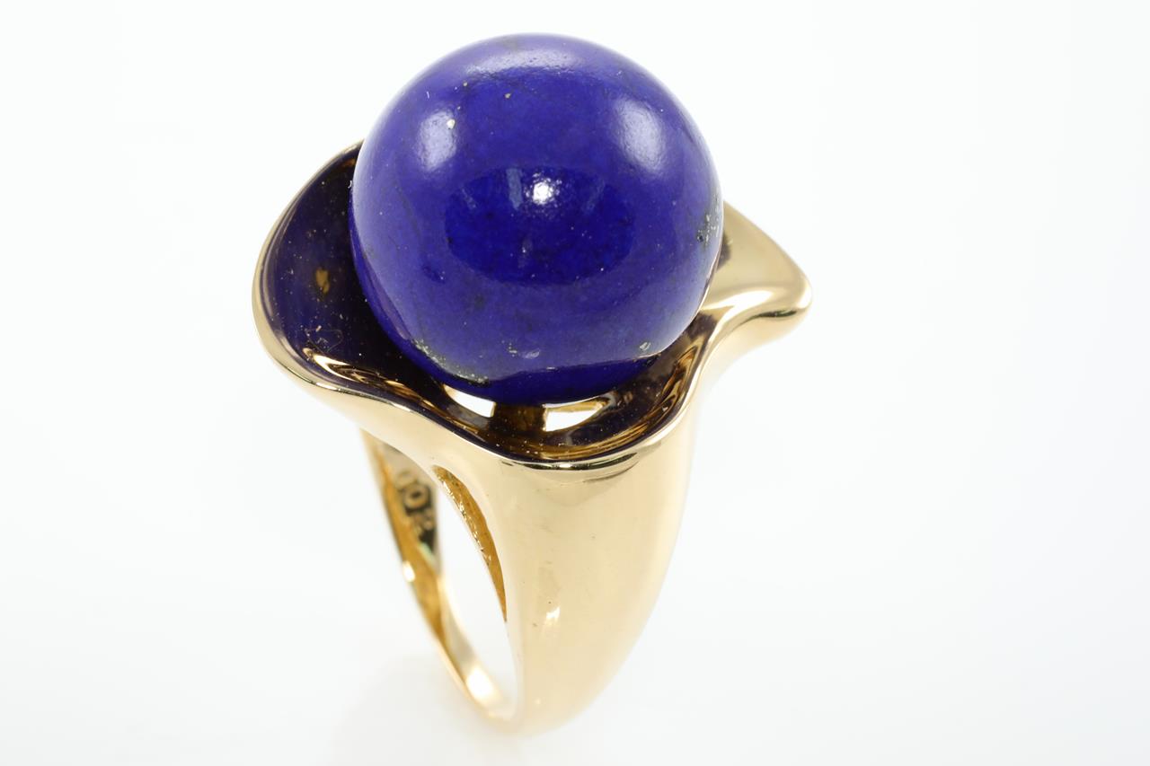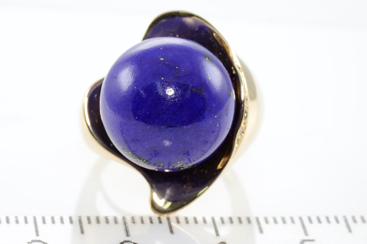 Lapis Lazuli and Diamond ring with round Lapis Lazuli and Diamonds totalling 0.02cts. 18ct yellow gold. Ring size L. Weight: 14.6g (Pre-owned)