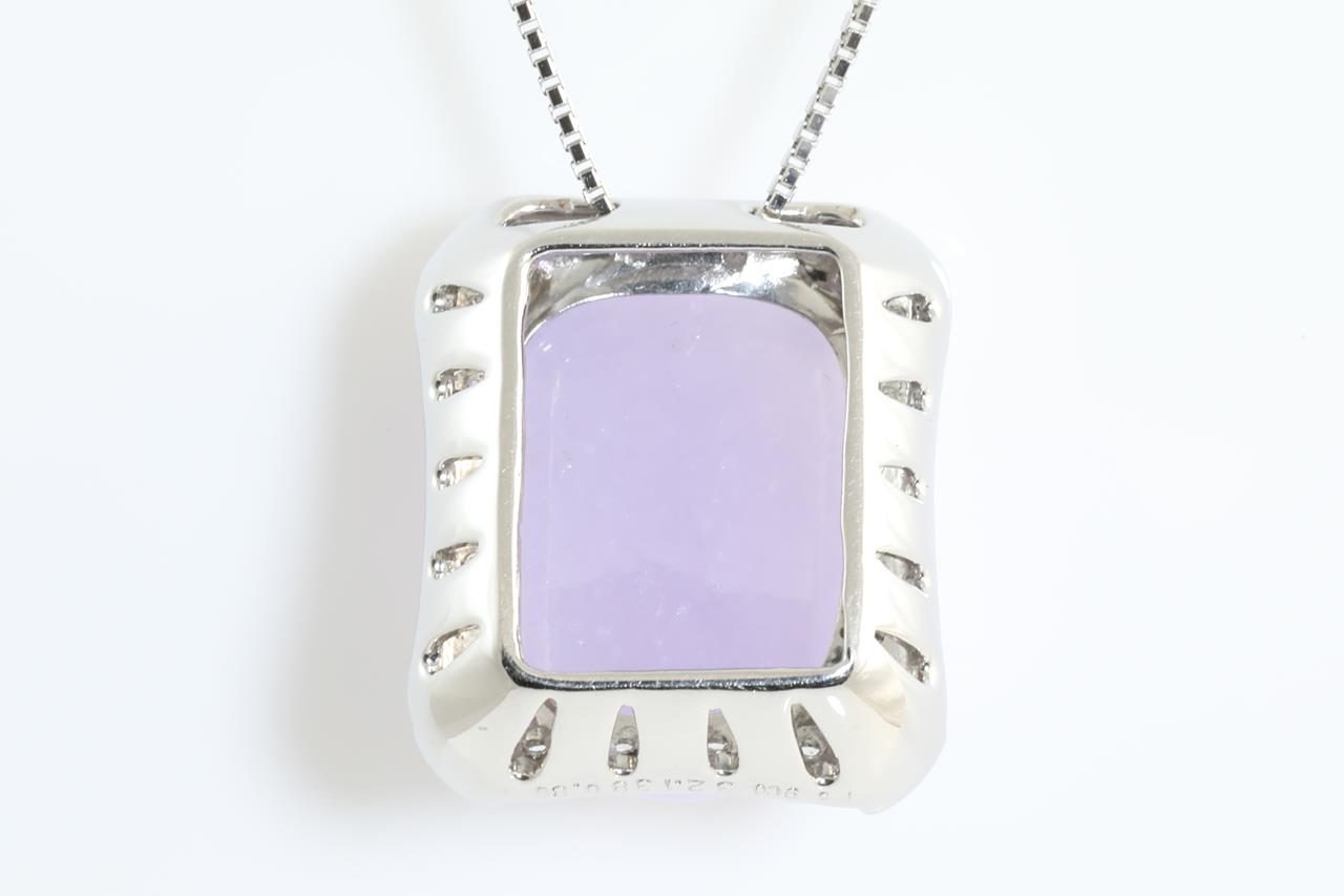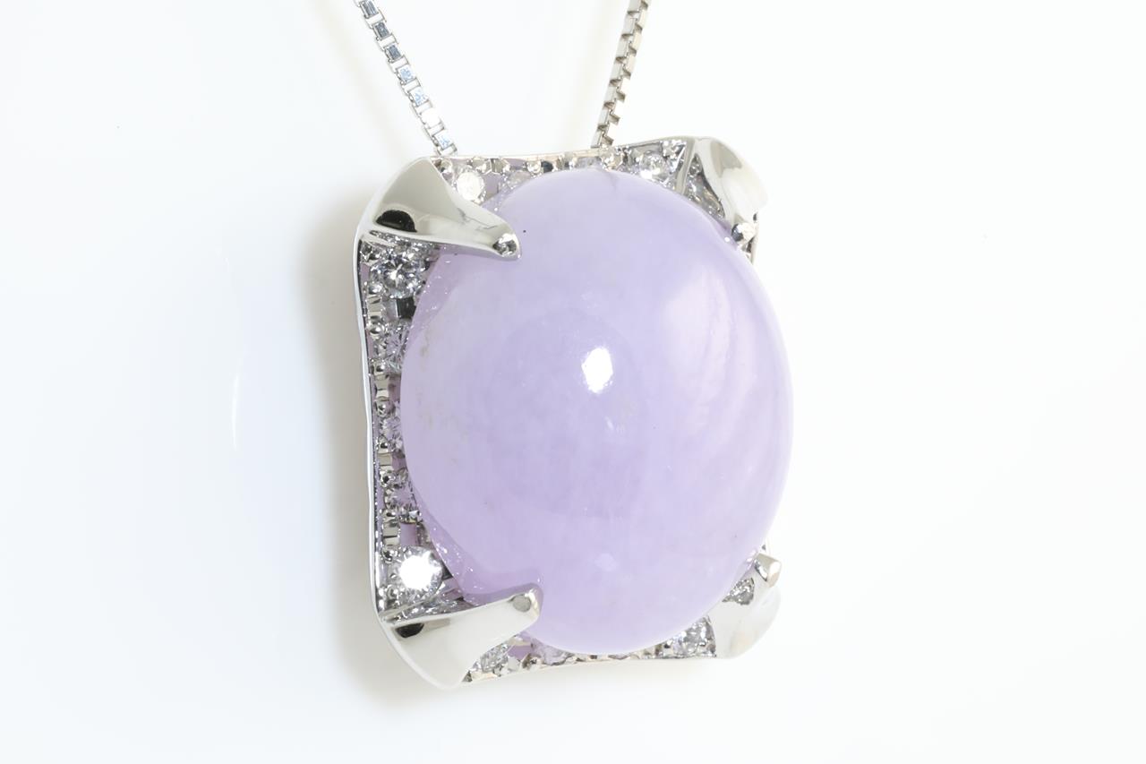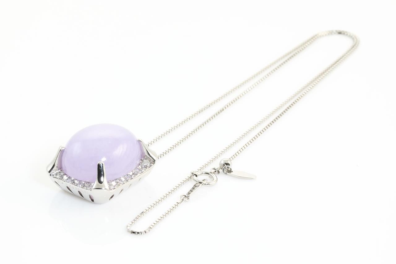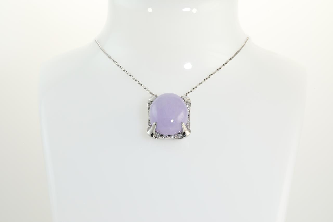 Jade and Diamond pendant with oval cabochon cut natural translucent lavender Jadeite Jade of 32.13ct (with GEM identification report #DB7544) and Diamonds totalling 0.80cts (Estimated grading: G-H SI). Platinum with 18ct white gold 44cm adjustable chain. Weight: 19.8g (Pre-owned)