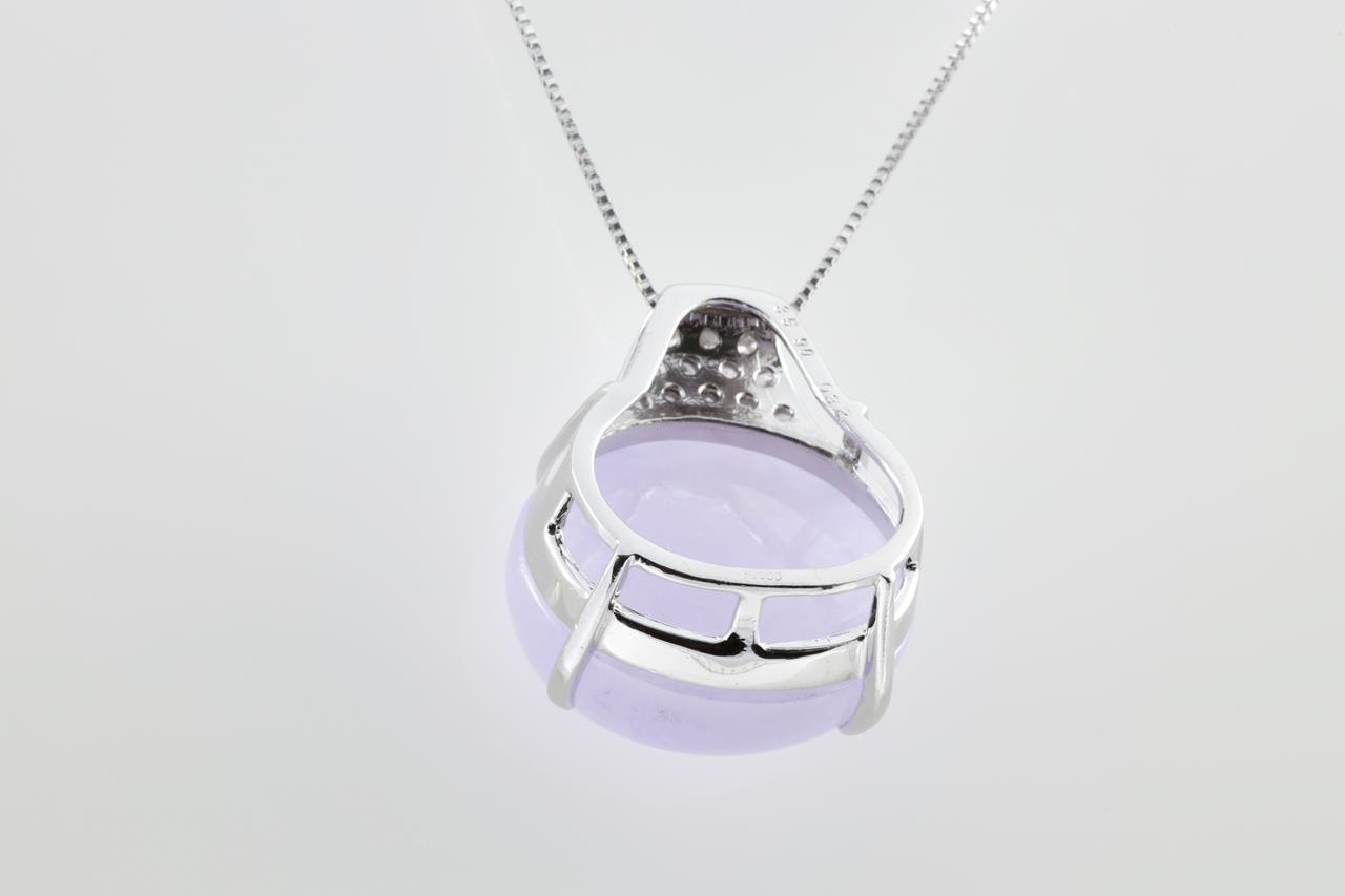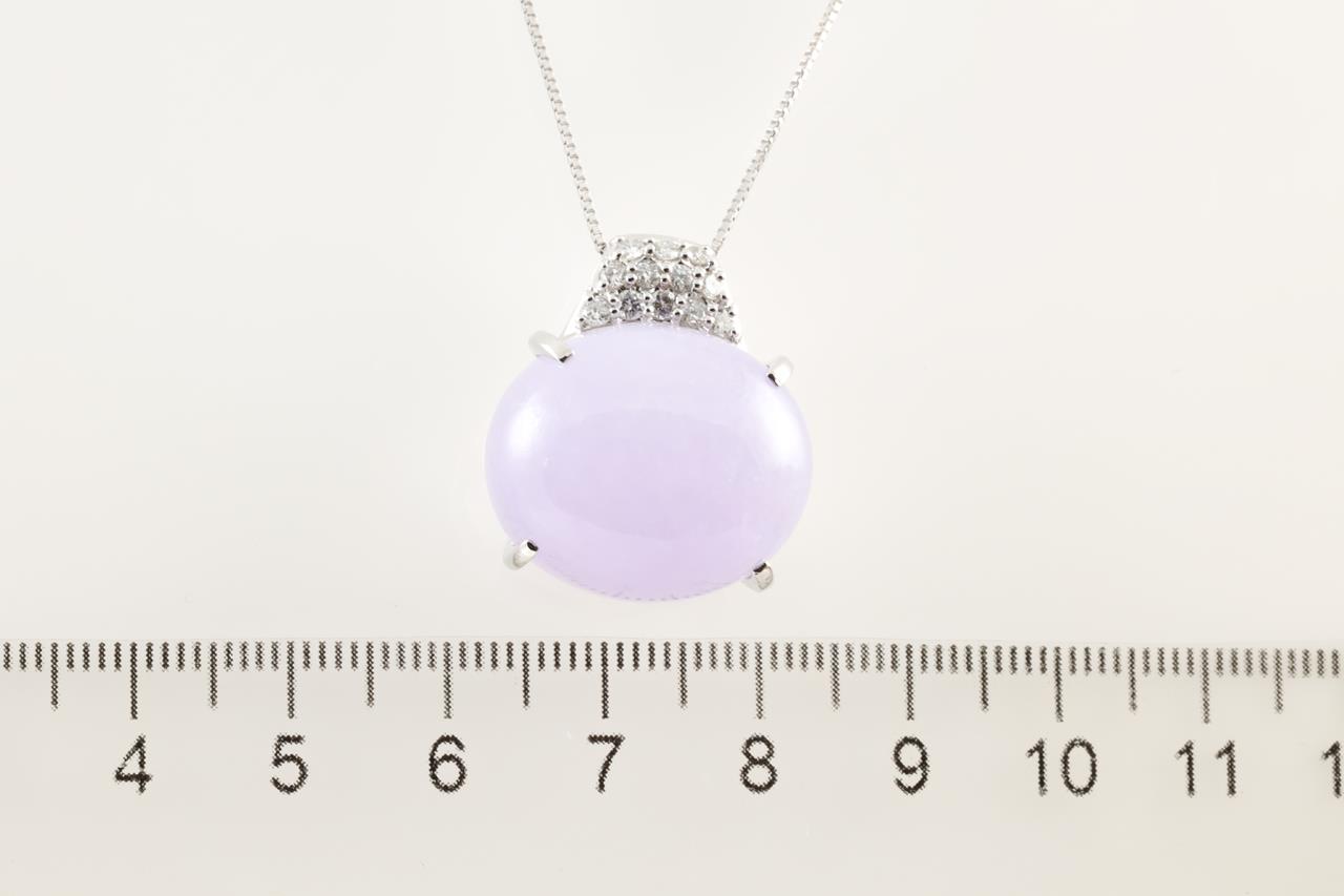 Jade and Diamond pendant with oval cabochon cut natural translucent lavender Jadeite Jade of 35.90ct (with GEM identification report #DB7543) and Diamonds totalling 0.32cts (Estimated grading: H SI). Platinum with 18ct white gold 44cm adjustable chain. Weight: 15.5g (Pre-owned)