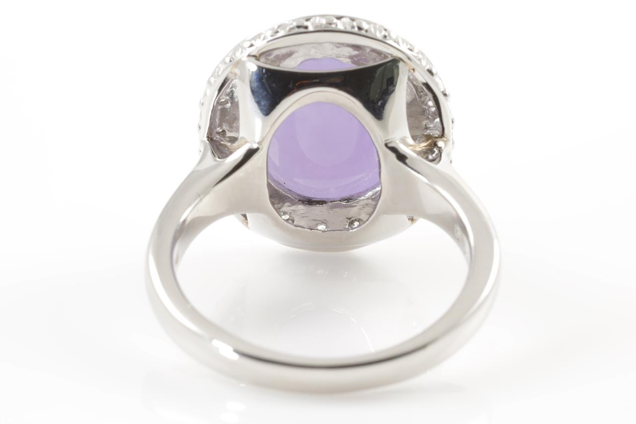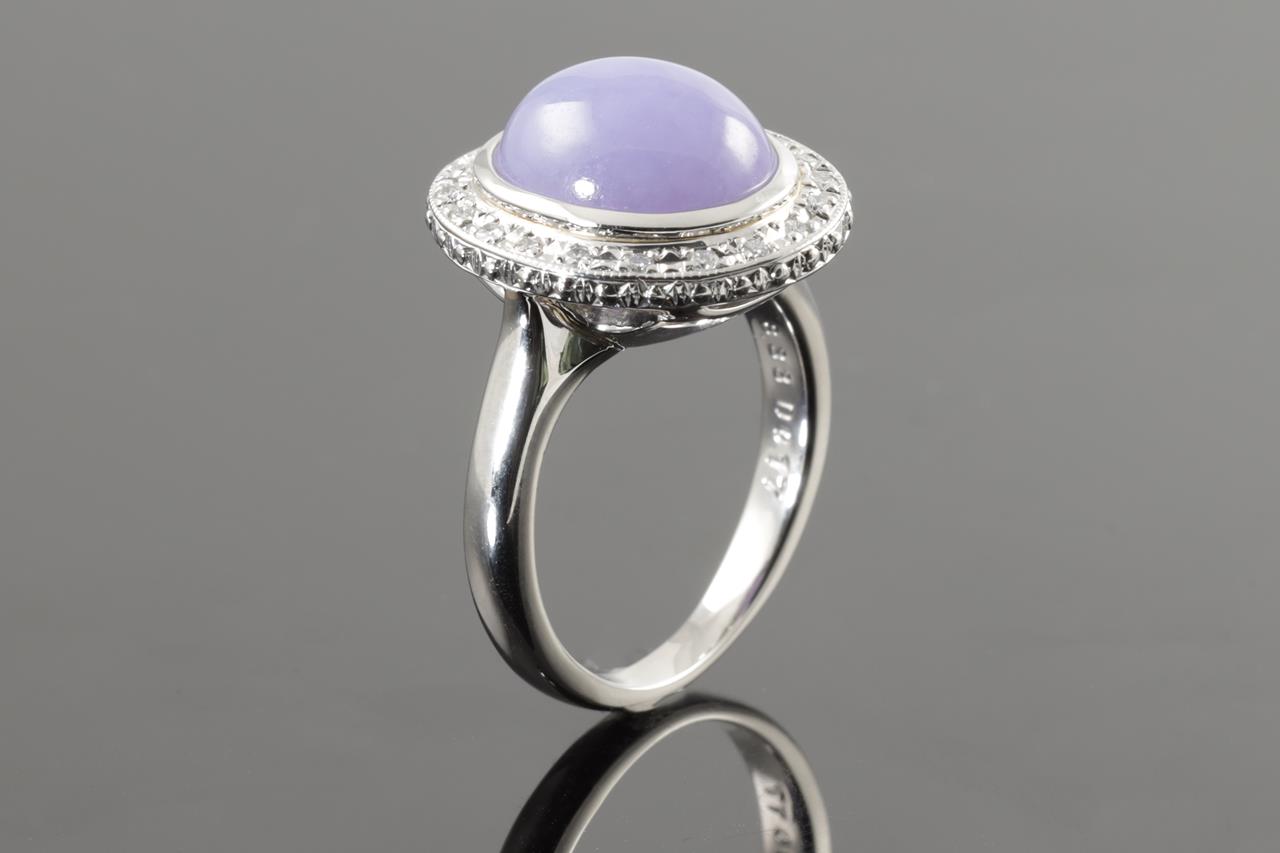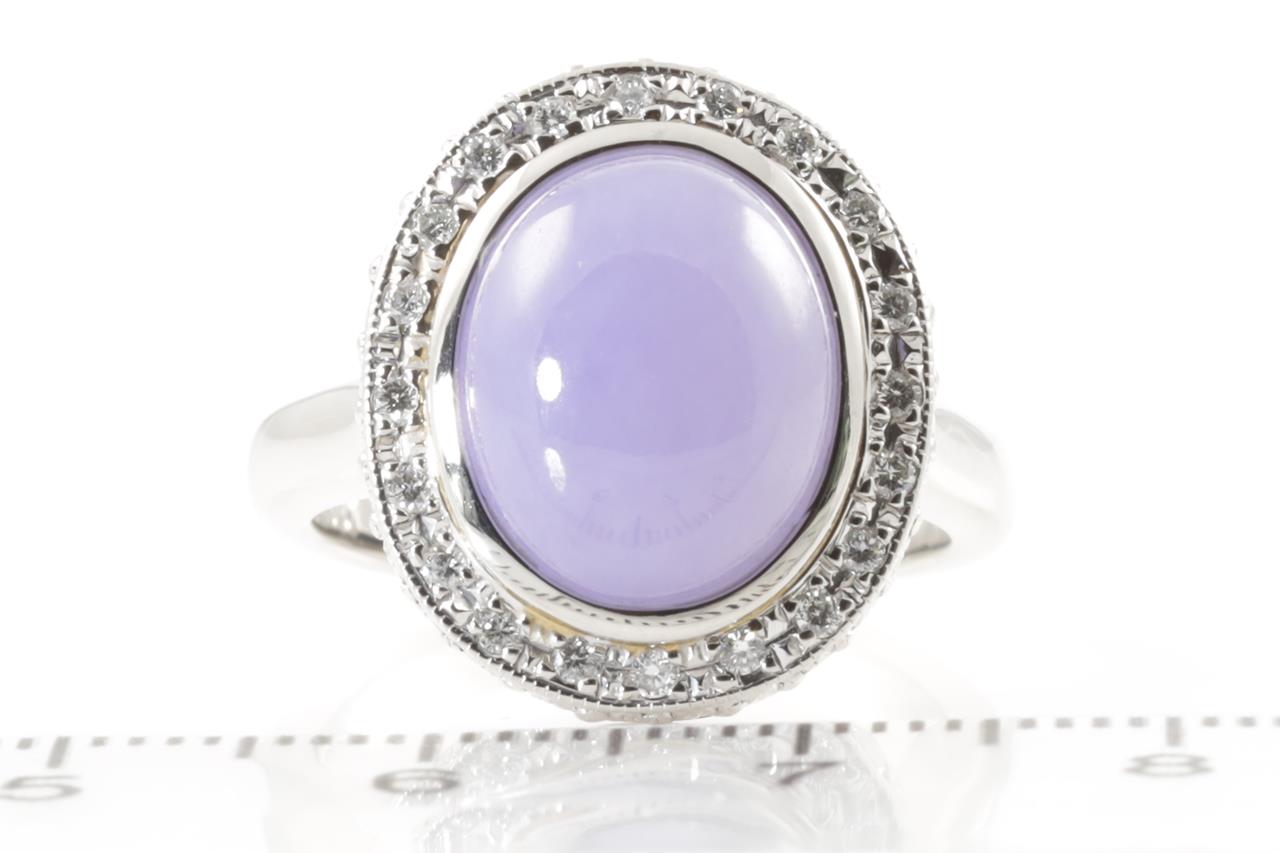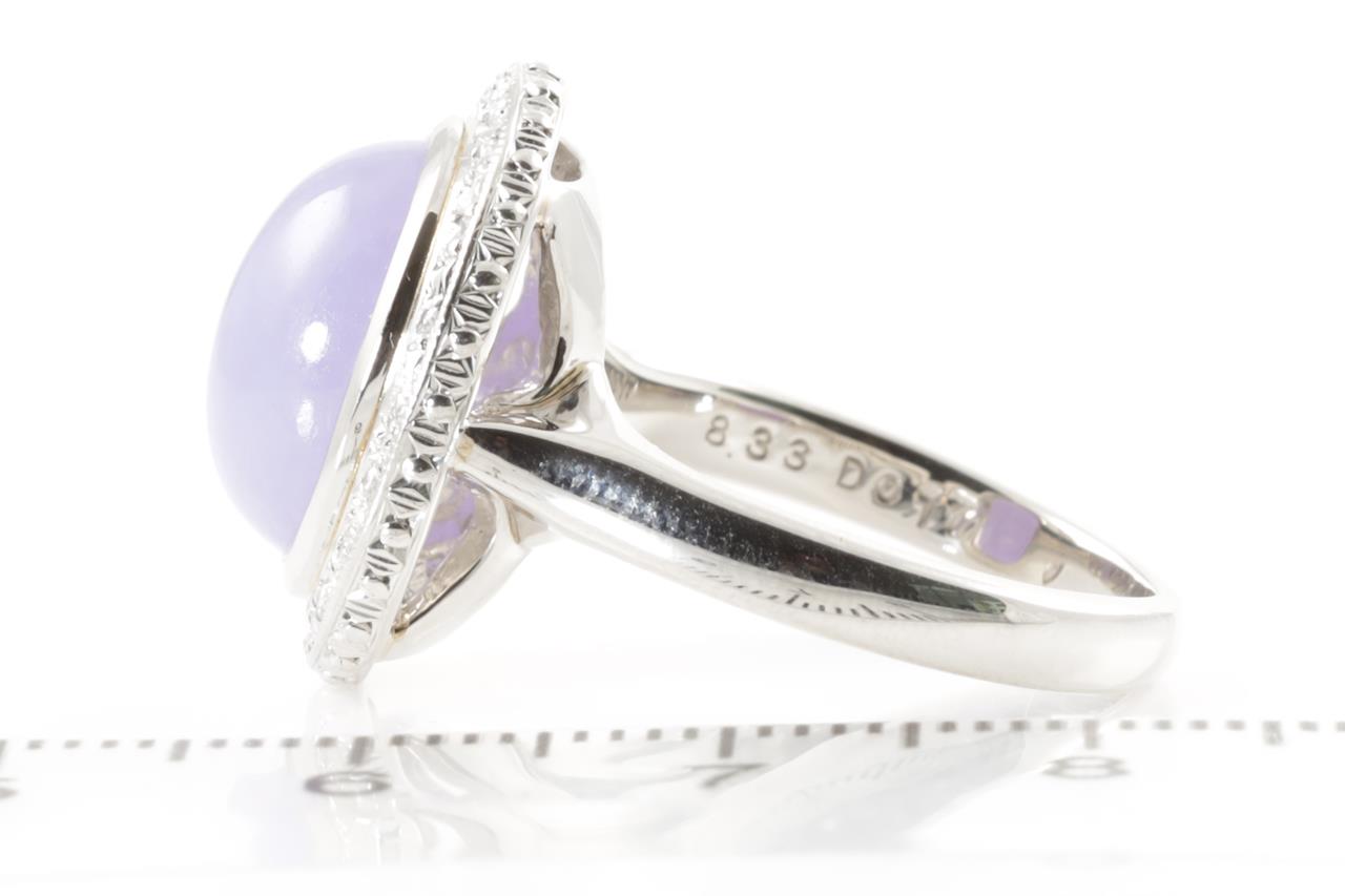 Jade and Diamond ring with an oval cabochon cut translucent natural Type A Lavender Jadeite Jade of 8.33ct and Diamonds totalling 0.17cts. Platinum. Ring size O1/2. Weight: 12.9g. With Gem Identification Report UBD2880. (Pre-owned)