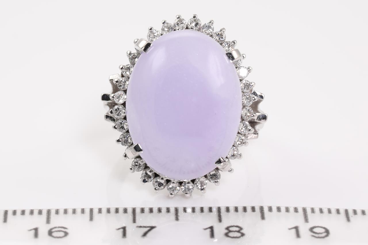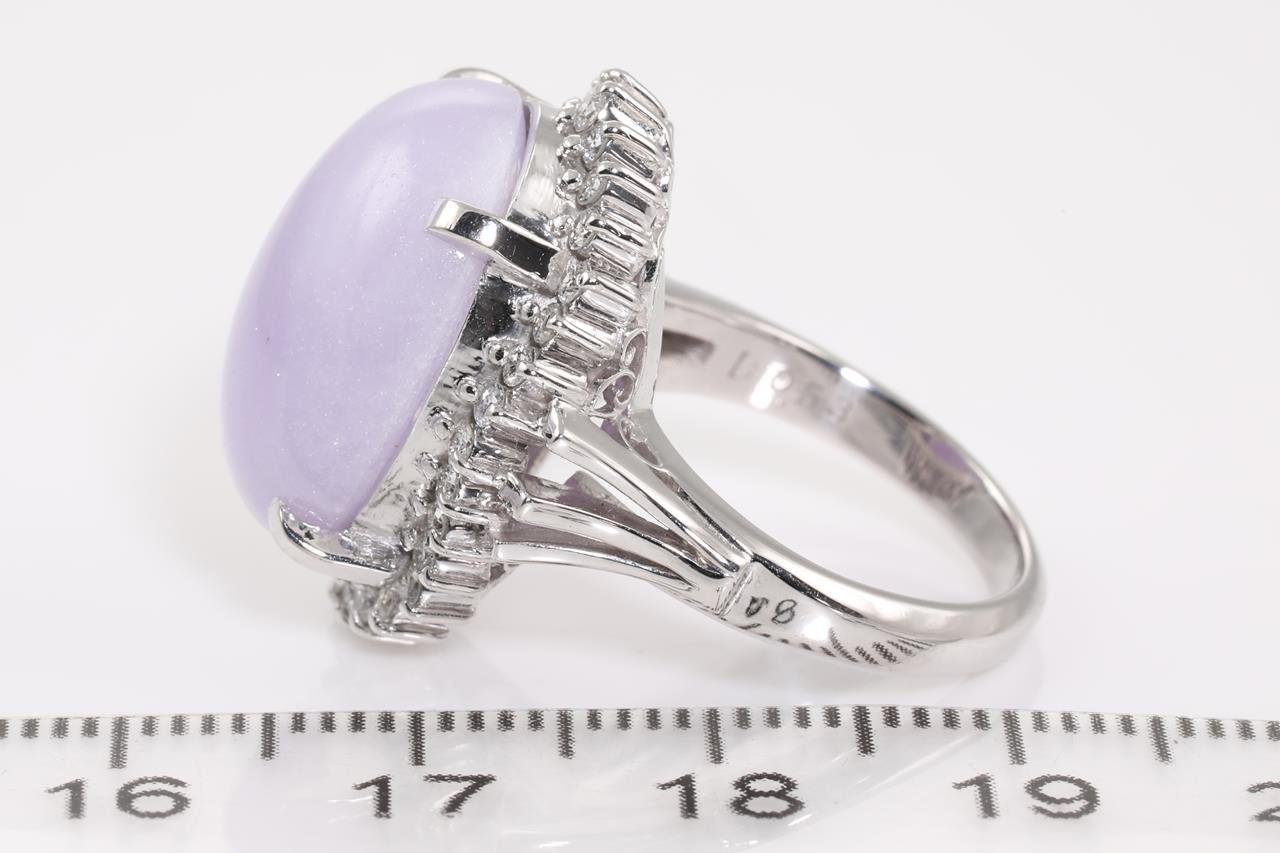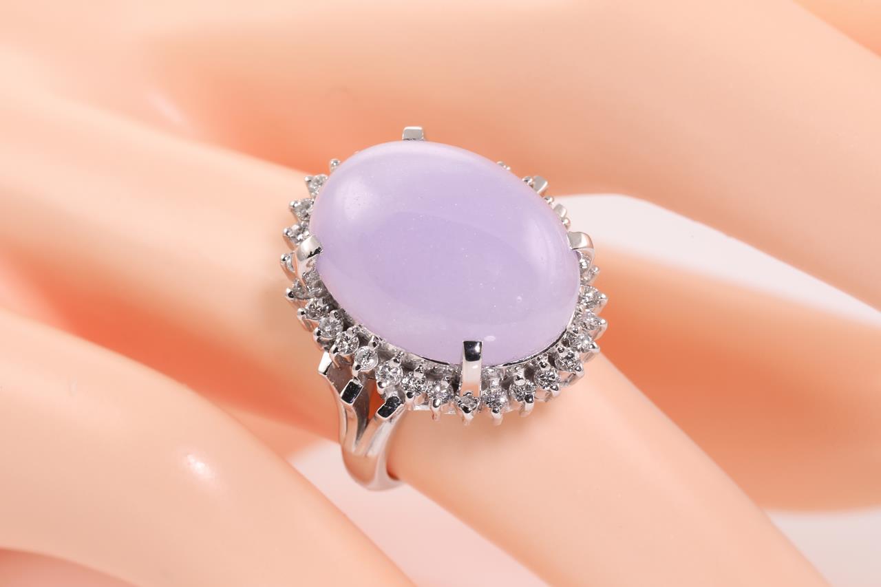 Jade and Diamond ring with an oval cabochon cut Natural Type B Jadeite Lavender Jade of 15.84ct and Diamonds totalling 0.53cts (Estimated grading: H SI). Platinum. Ring size K. Weight: 14g. With Gem Identification report #D18471. (Pre-owned)