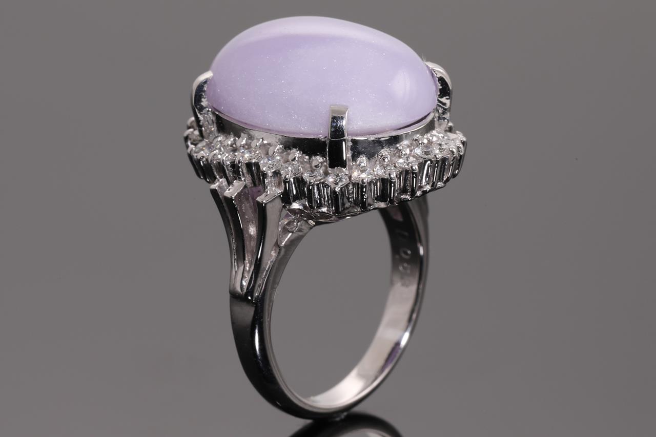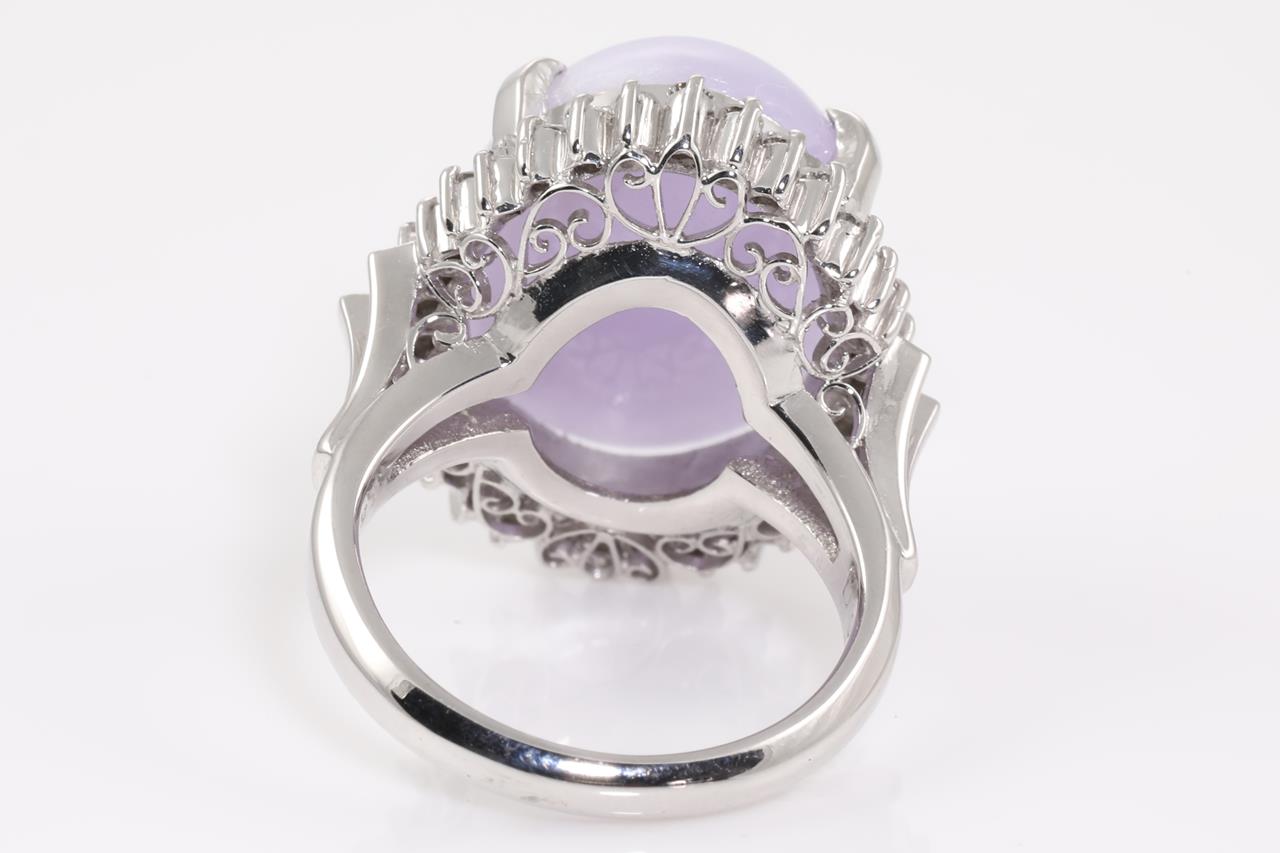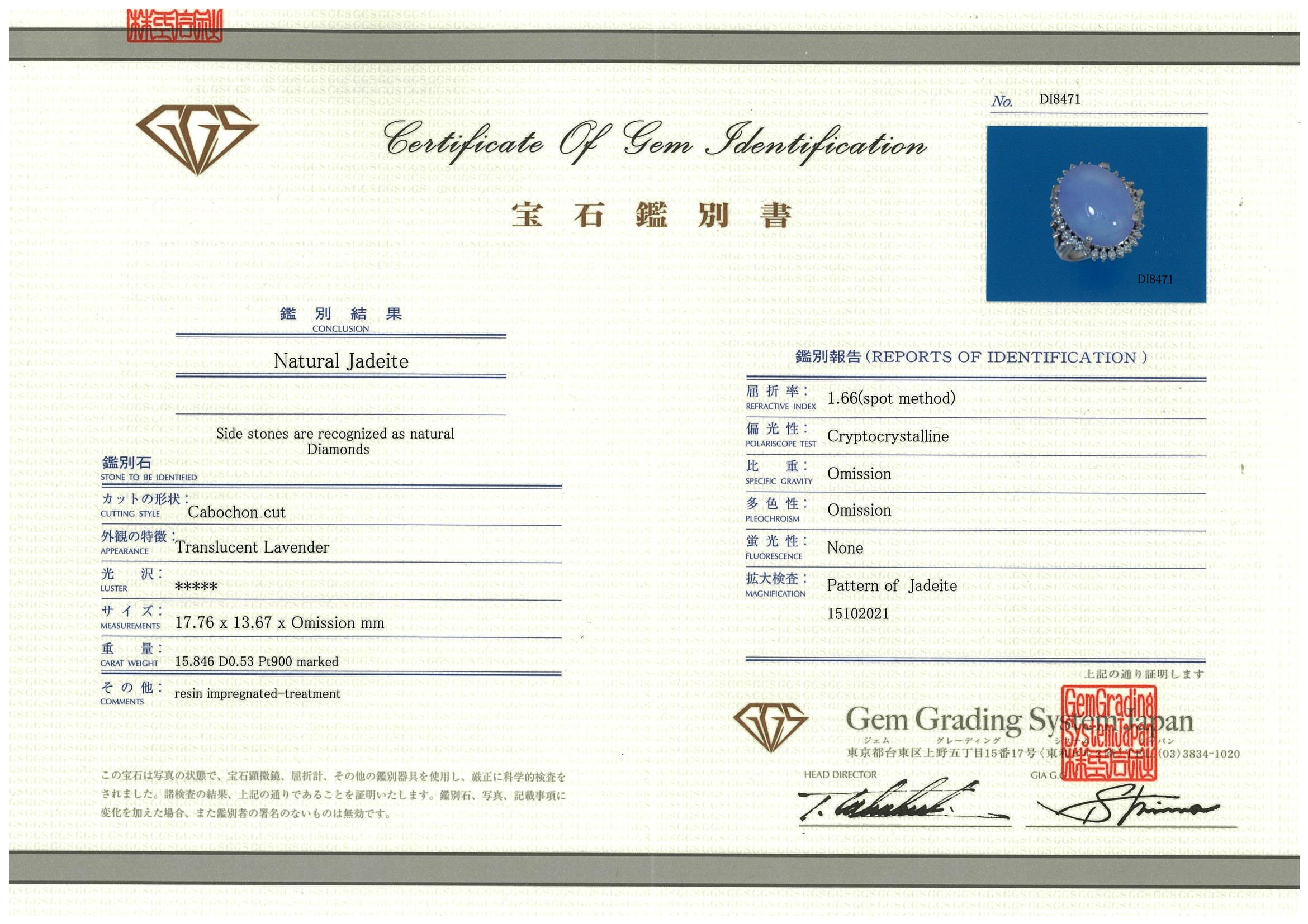 Jade and Diamond ring with an oval cabochon cut Natural Type B Jadeite Lavender Jade of 15.84ct and Diamonds totalling 0.53cts (Estimated grading: H SI). Platinum. Ring size K. Weight: 14g. With Gem Identification report #D18471. (Pre-owned)