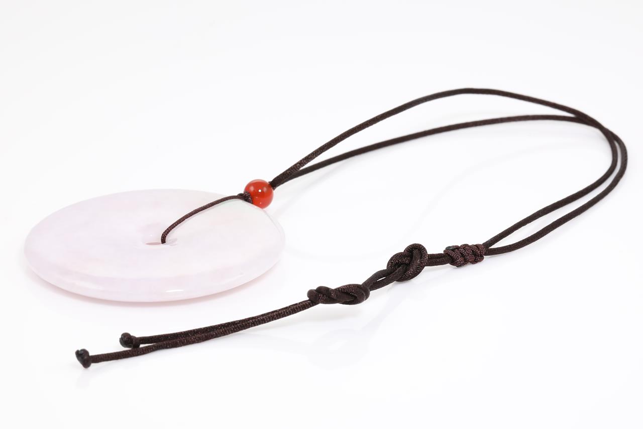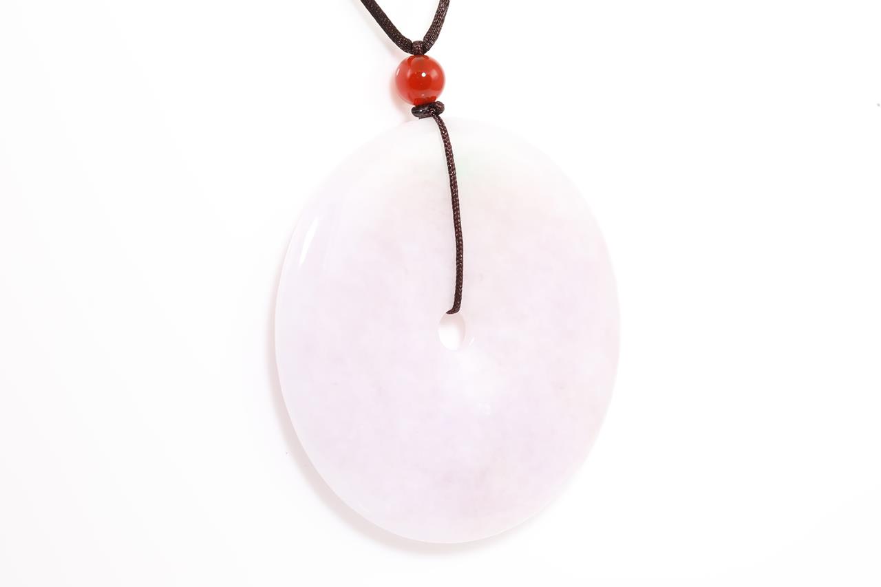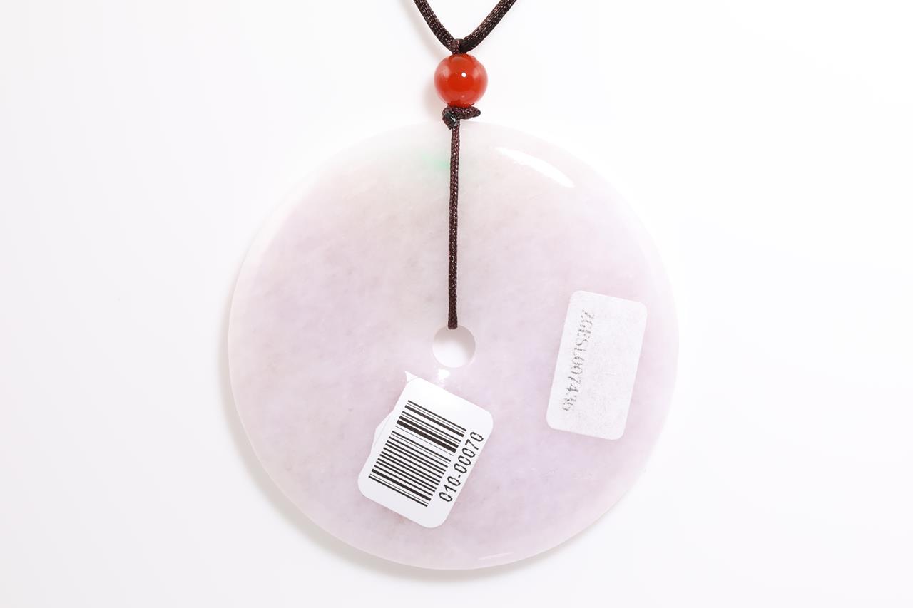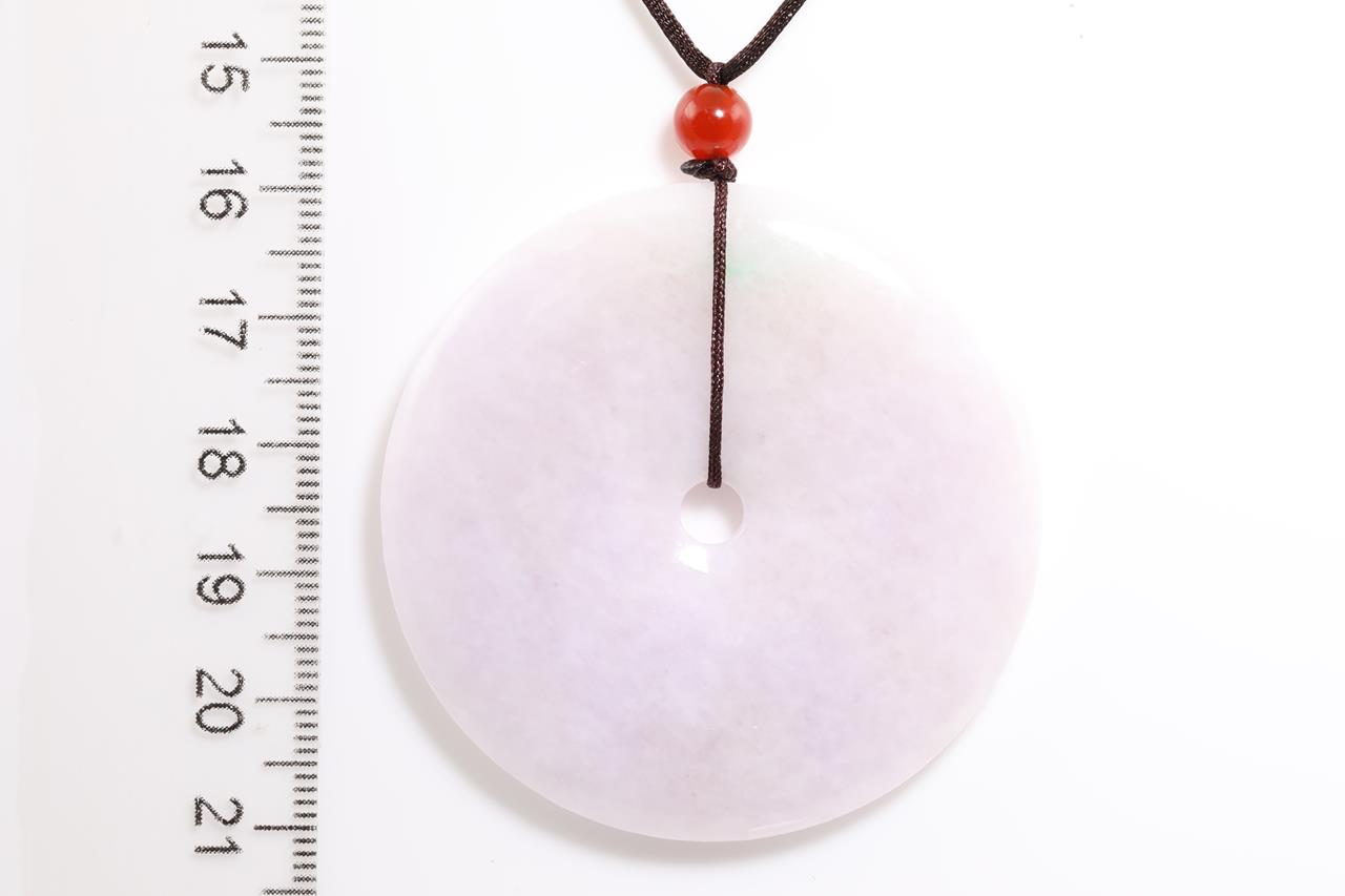 Jade Pendant with a Lavender with green tone disc shape Jade - Type A, on cord. Diameter: 5cm. Length 36cm. (As New)