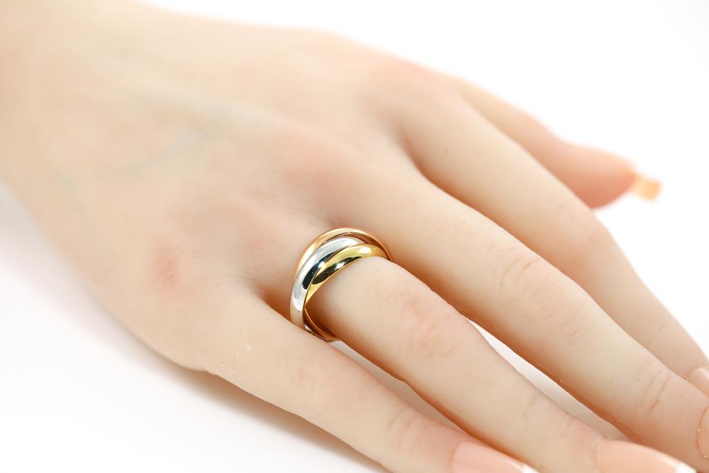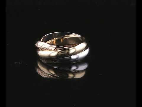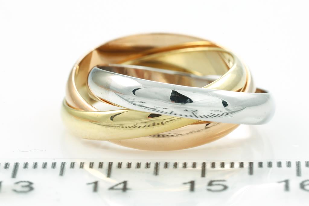 Le Must De Cartier Trinity ring. 18ct yellow, rose & white gold. Cartier stamped size 54, N1/2 - ring resizing is not recommended. Weight 8.5g. (Pre-owned)