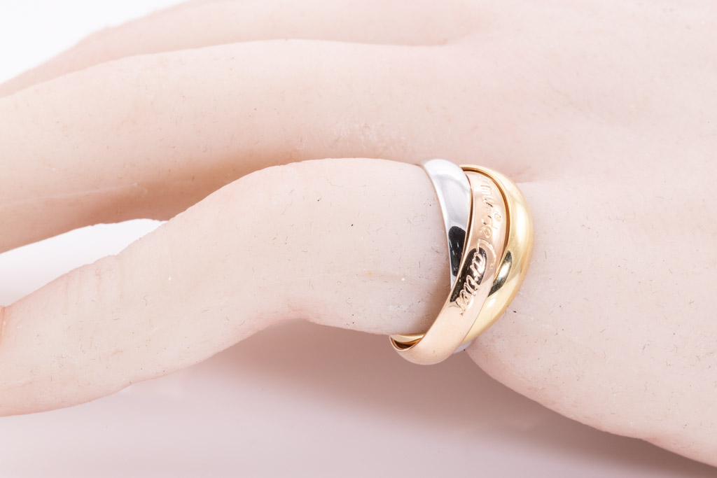 Le Must De Cartier Trinity ring. 18ct yellow, rose & white gold. Cartier stamped size 48, ring size H - ring resizing is not recommended. Weight 6.9g. With Cartier box. (Pre-owned)