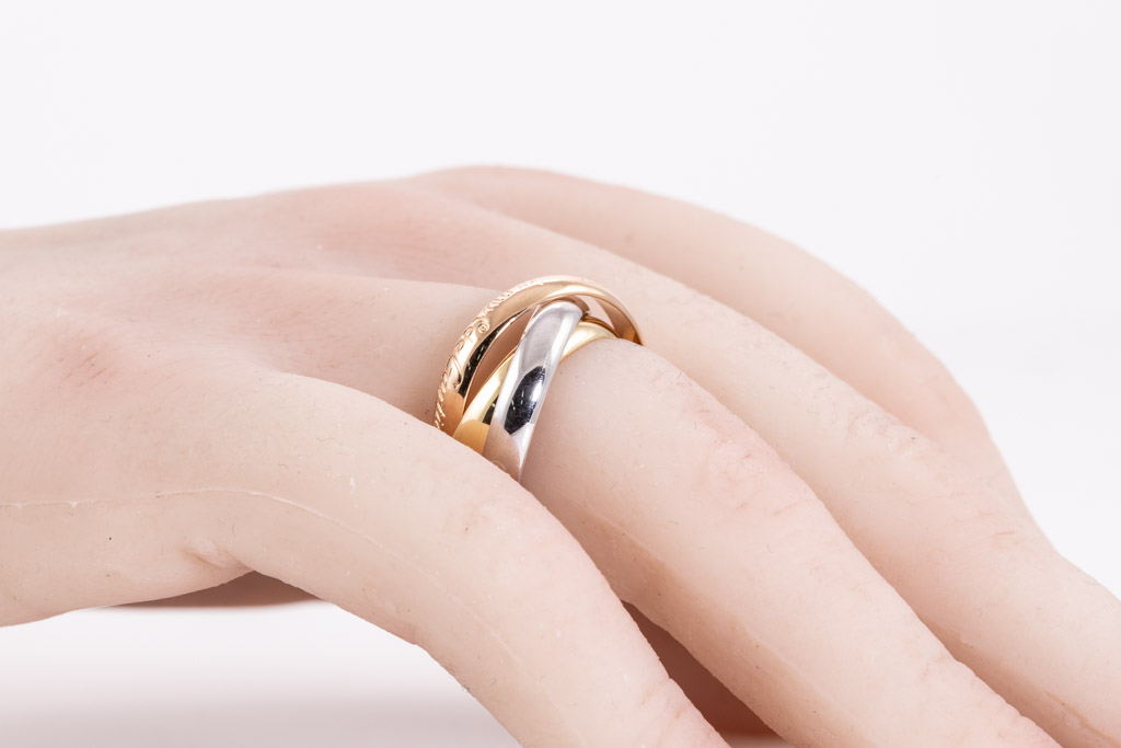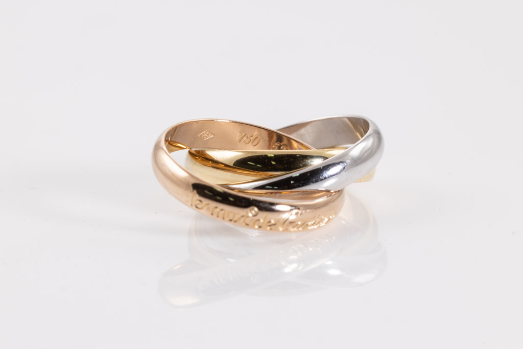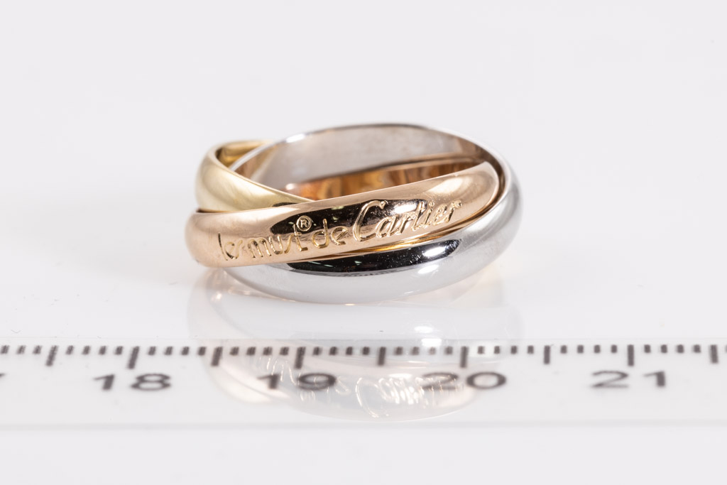 Le Must De Cartier Trinity ring. 18ct yellow, rose & white gold. Cartier stamped size 52, L - ring resizing is not recommended. Weight 8.0g. (Pre-owned)