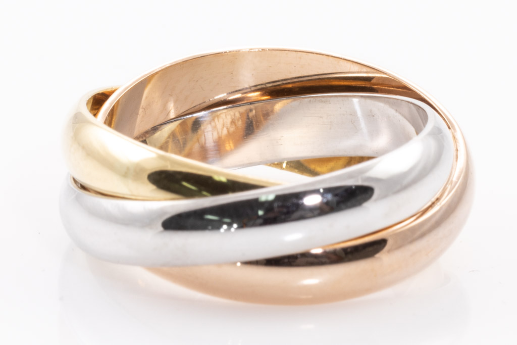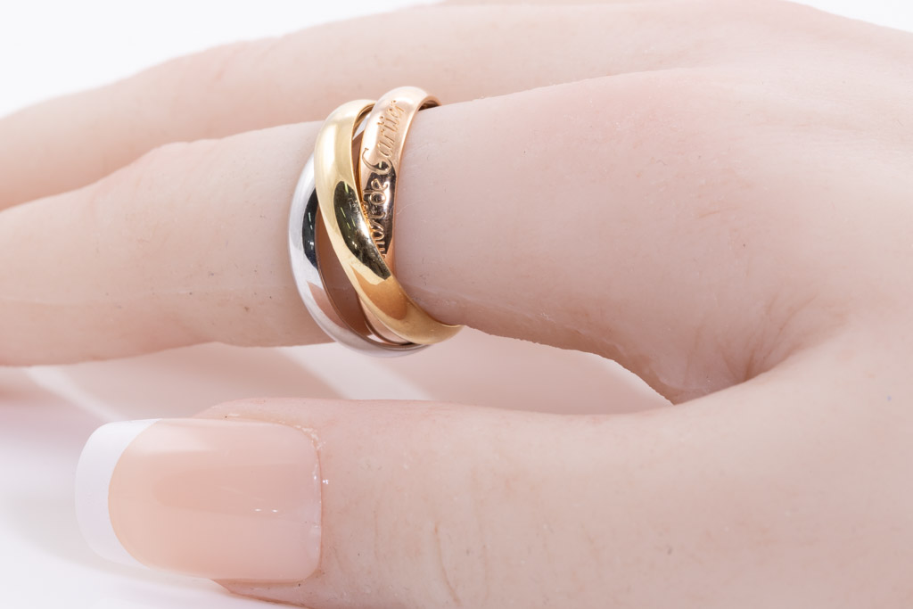 Le Must De Cartier Trinity ring. 18ct yellow, rose & white gold. Cartier stamped size 52, L - ring resizing is not recommended. Weight 8.1g. With Cartier box. (Pre-owned)