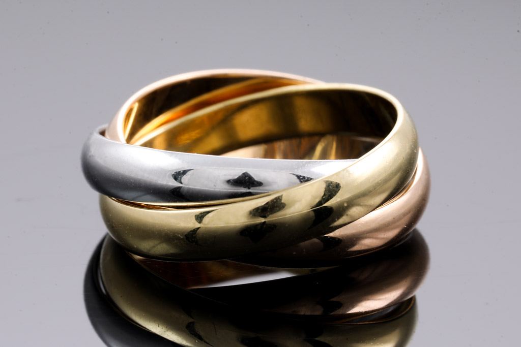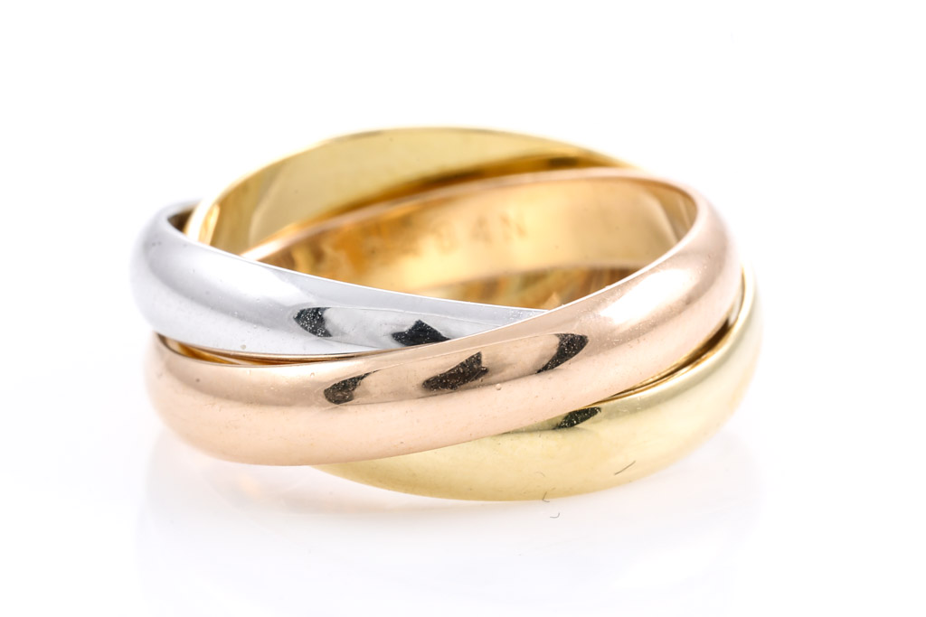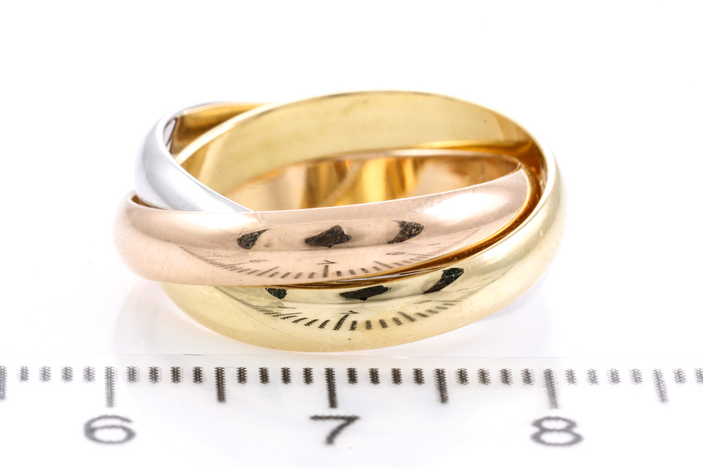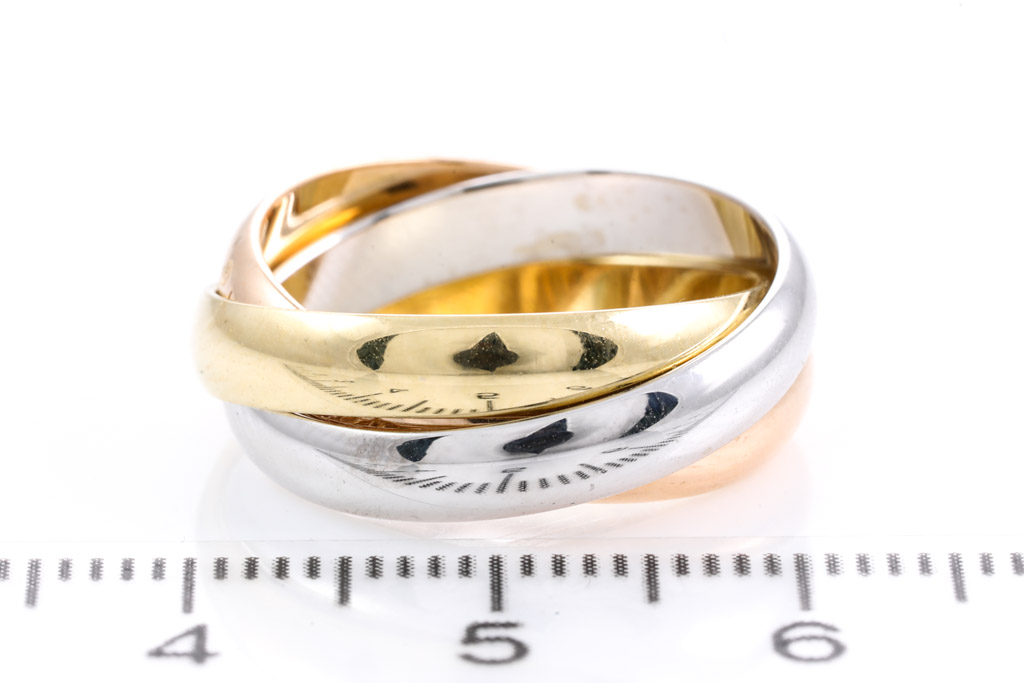 Le Must De Cartier Trinity ring. 18ct yellow, rose & white gold. Cartier stamped size 52, K1/2 - ring resizing is not recommended. Weight 8.0g. (Pre-owned)