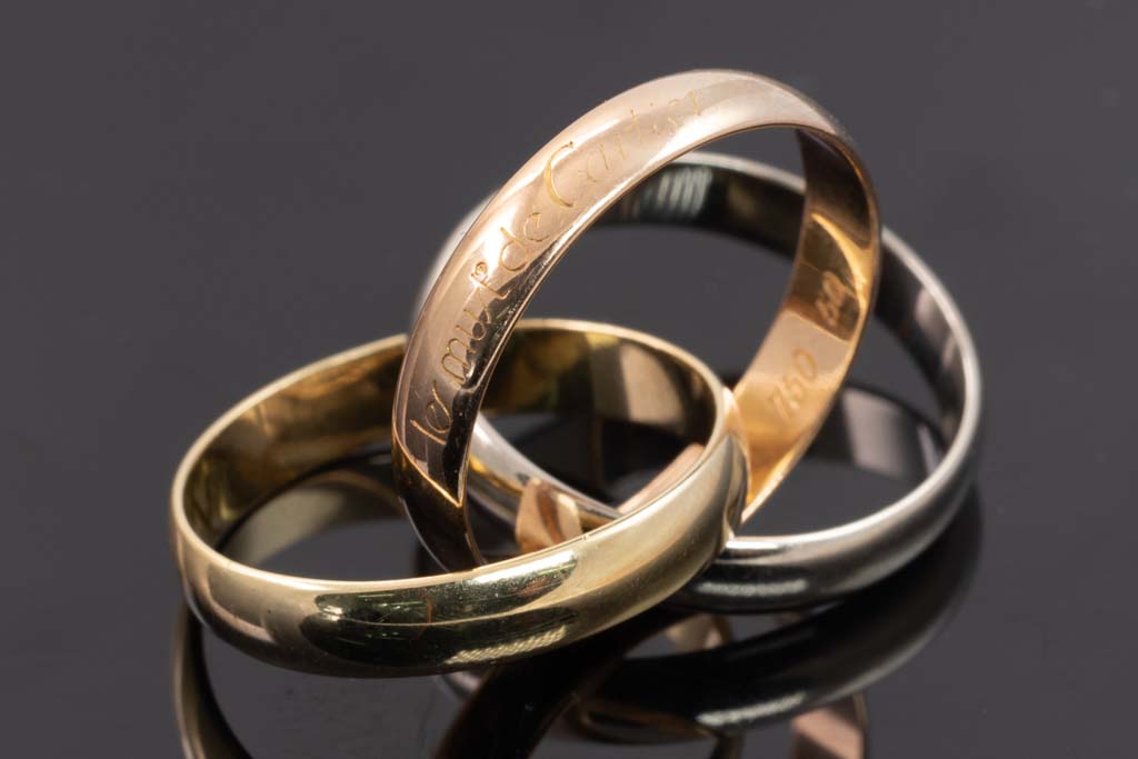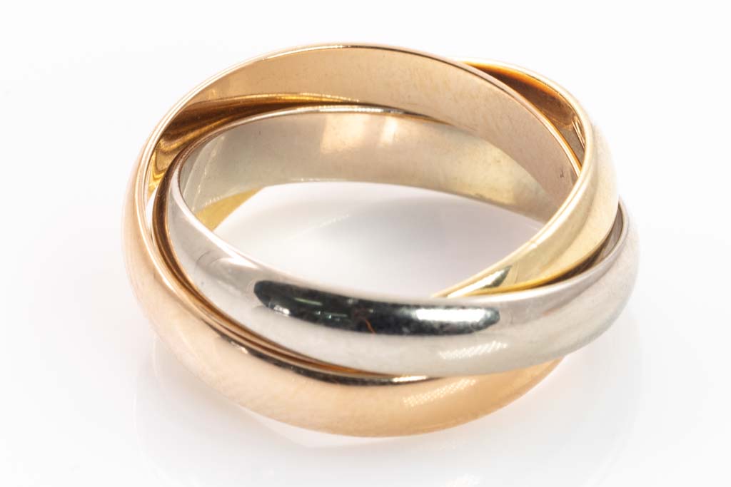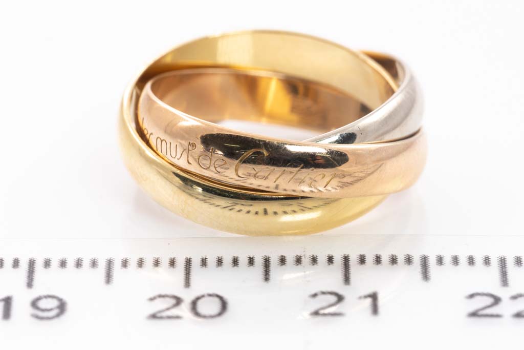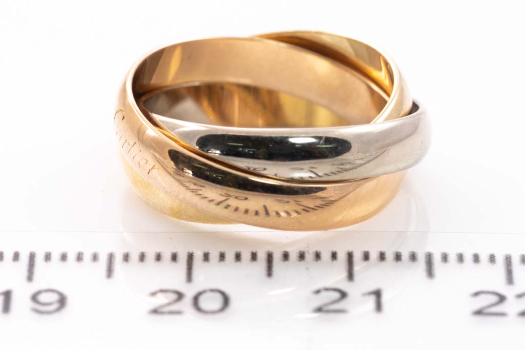 Le Must De Cartier Trinity ring. 18ct yellow, rose & white gold. Cartier stamped size 50, K - ring resizing is not recommended. Weight 6.6g. With Cartier box. (Pre-owned)