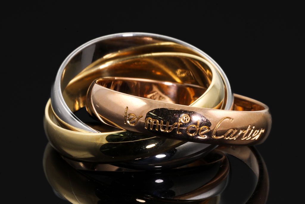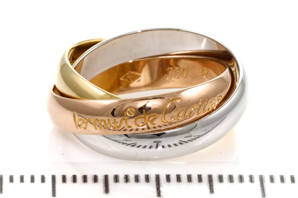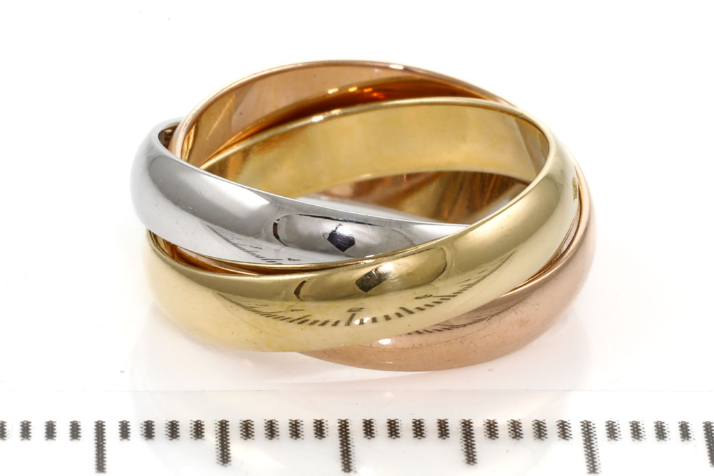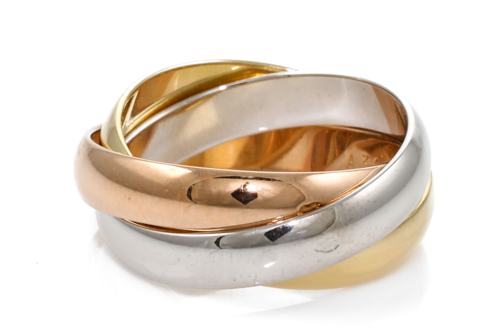Le Must De Cartier Trinity ring. 18ct yellow, rose & white gold. Cartier stamped size 48, ring size I - ring resizing is not recommended. Weight 6.8g. With Cartier box. (Pre-owned)