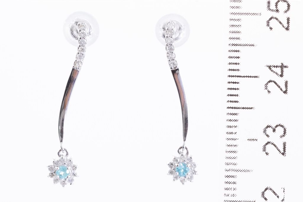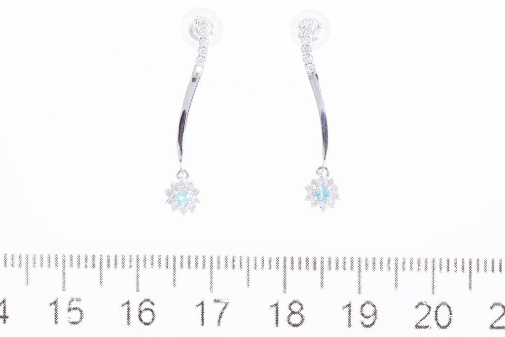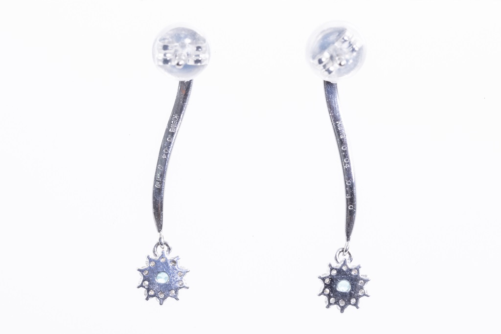 Tourmaline and Diamond Earrings with 2 round light blue Tourmaline totalling 0.08cts and round Diamonds totalling 0.20cts. 18ct white gold with 18ct white gold & silicon backs. Weight: 1.6g. (Pre-owned)