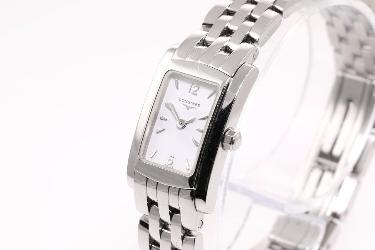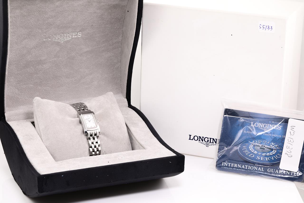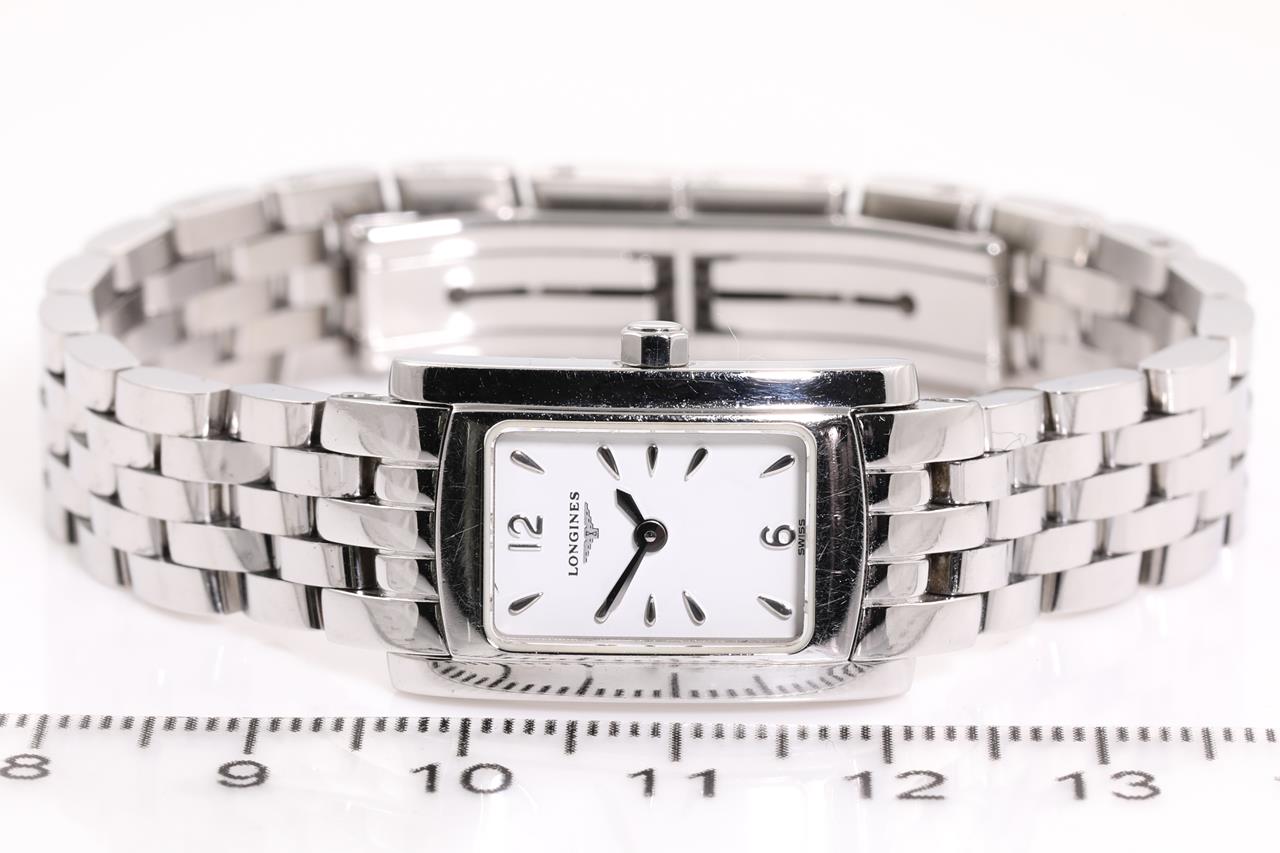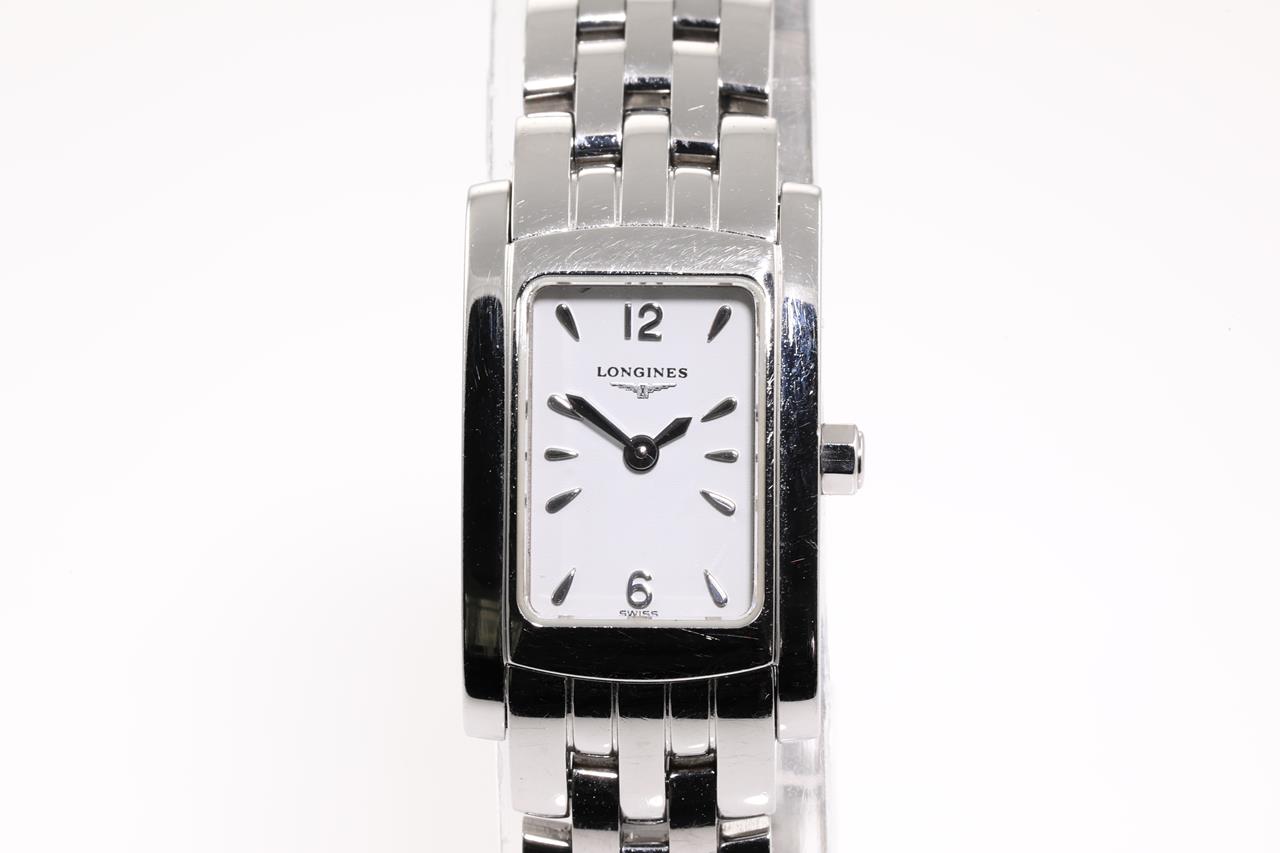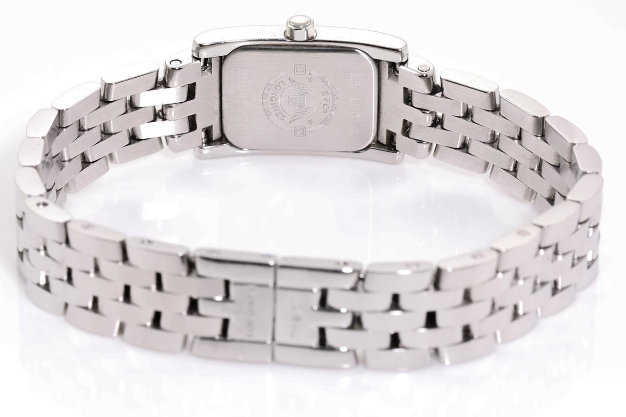 Longines Dolce Vita stainless steel quartz ladies watch. White dial, case diameter: 20mm x 16mm, wrist size: 16cm, Swiss made. Ref# L5.158.4. With Longines stainless steel bracelet and clasp. With Certificate of Authenticity, Longines International warranty card dated March 9, 2000 and Longines box. 3 month FSA warranty. (Pre-owned)