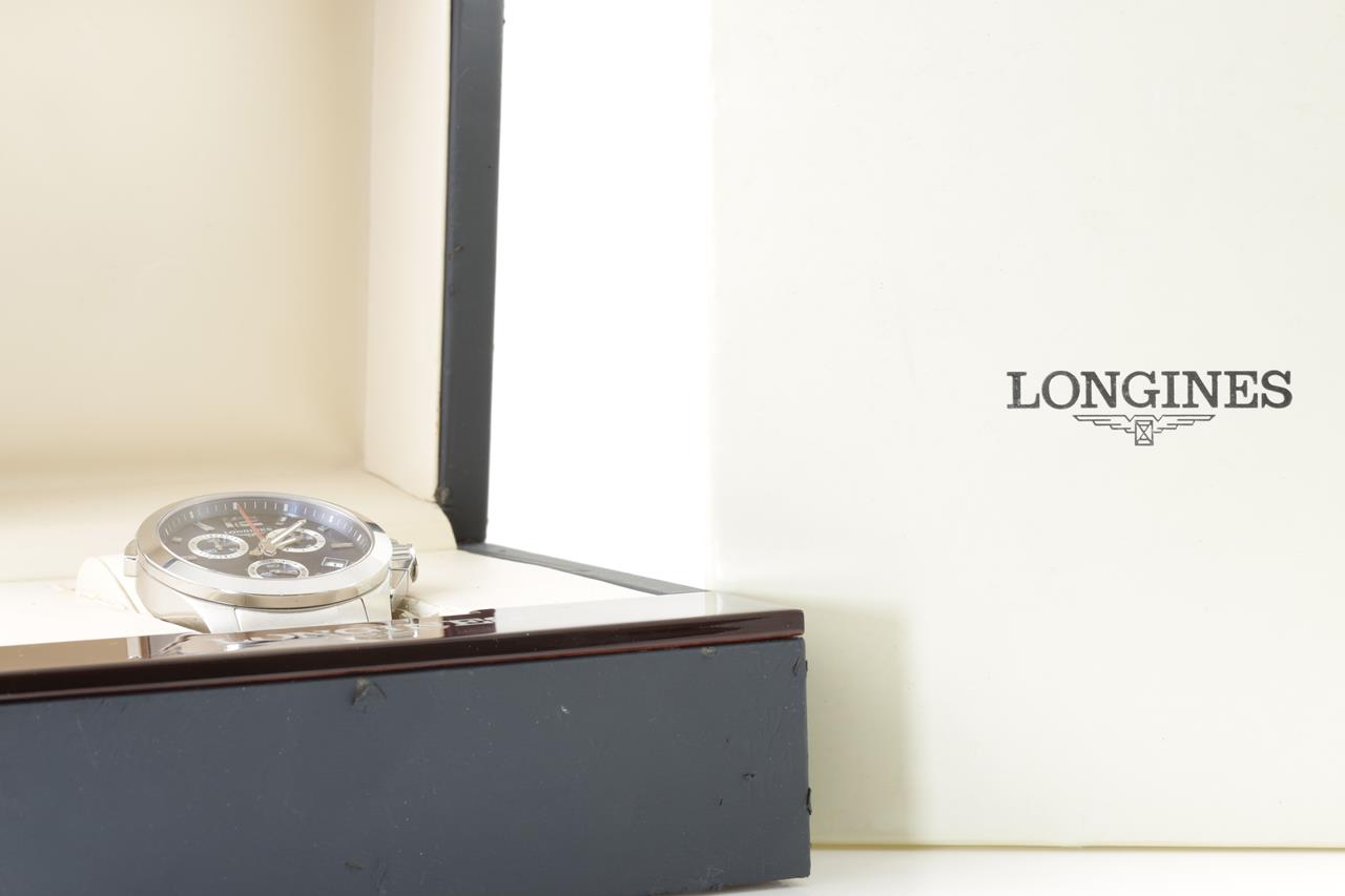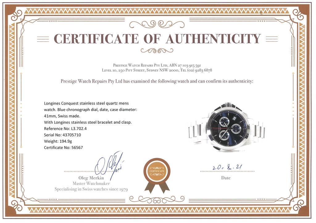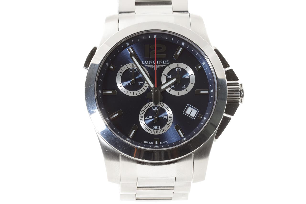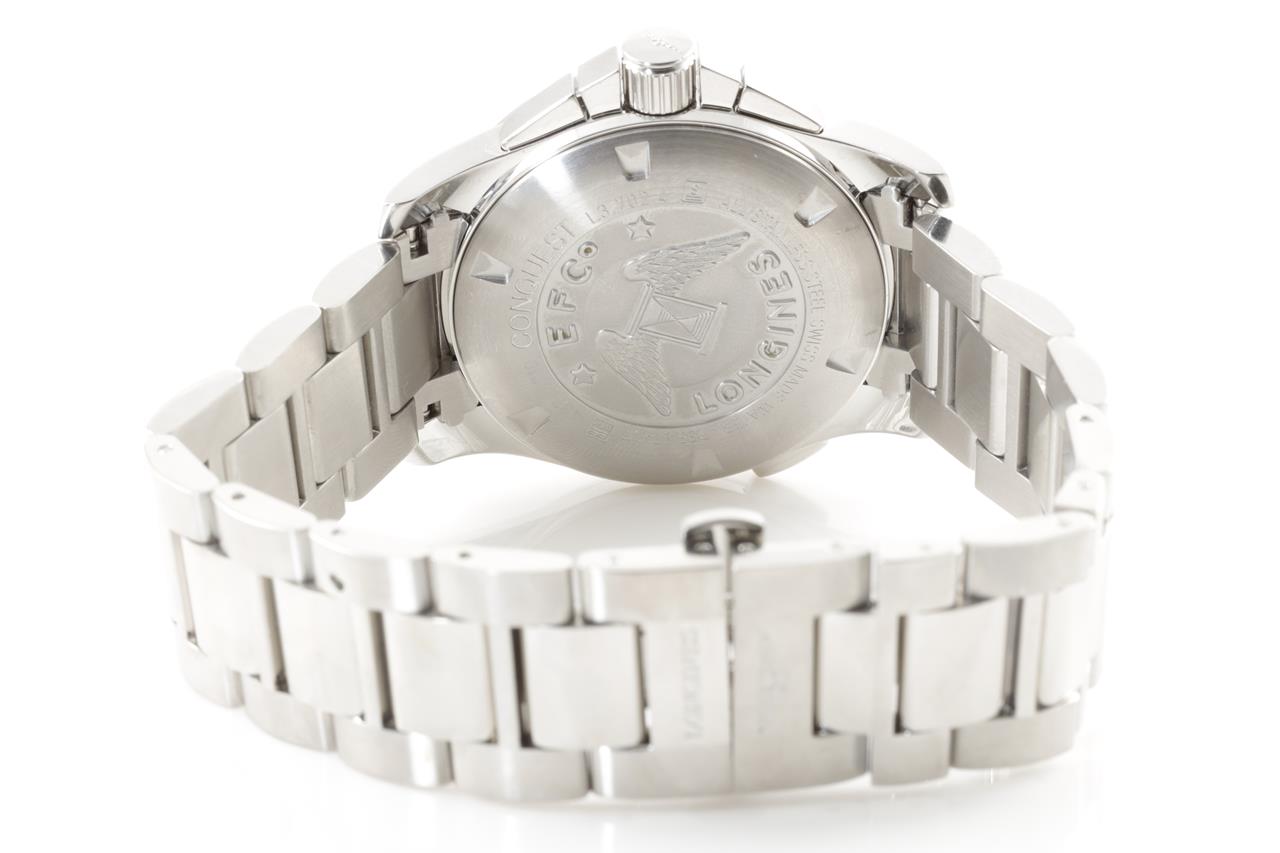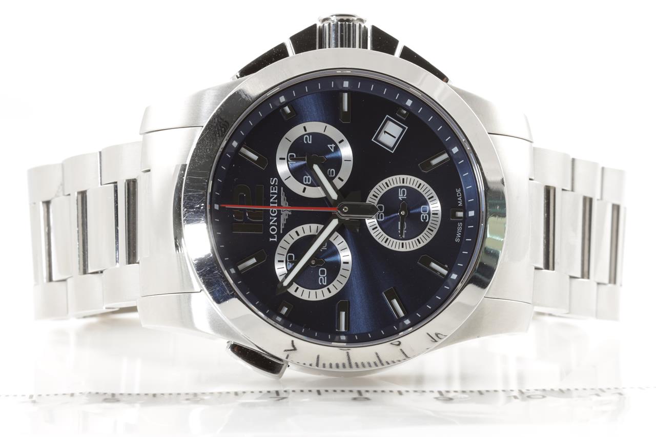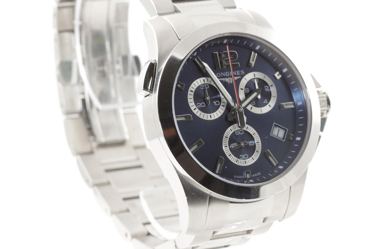 Longines Conquest stainless steel quartz mens watch. Blue chronograph dial, date, case diameter: 41mm, wrist size: 21cm, Swiss made. Ref# L3.702.4. With Longines stainless steel bracelet and clasp. With certificate of authenticity, Longines international guarantee card dated 23/10/2015 and Longines box. 3 month FSA warranty. (Pre-owned)