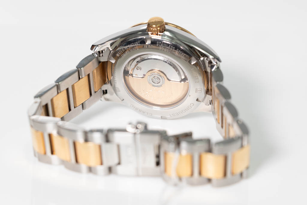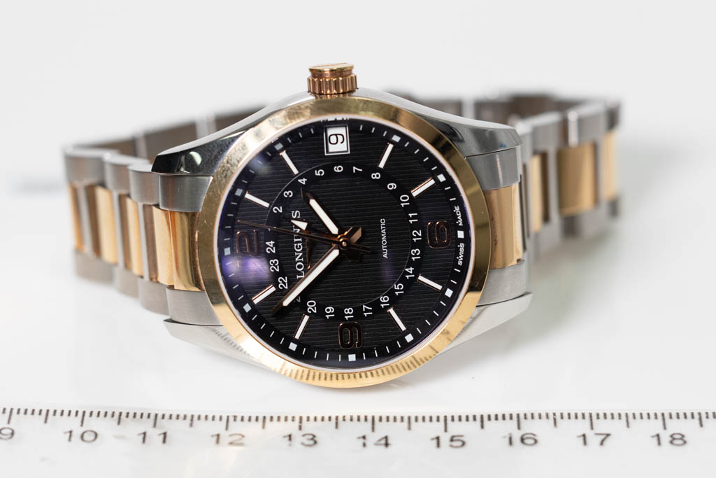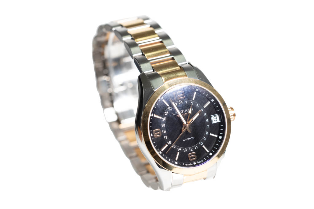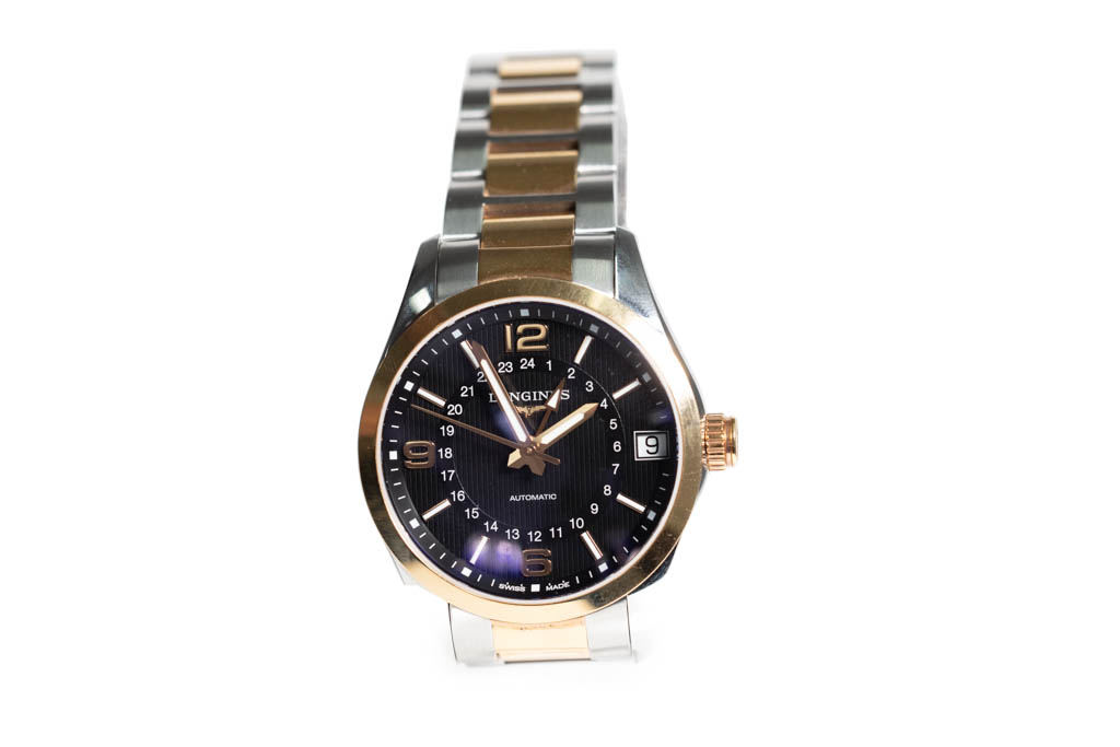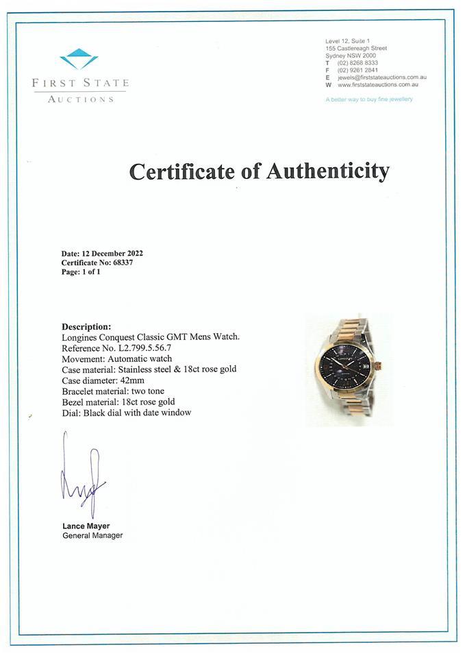 Longines Conquest Classic GMT stainless steel & 18ct rose gold automatic mens watch. Black dial, date, case diameter: 42mm wrist size: 20cm, Swiss made. Ref# L2.799.5.56.7. With Longines two-tone bracelet and clasp. With FSA Certificate of Authenticity, Longines Instructions for use booklet and Longines box. 3 month FSA warranty. (As New, Note: scratches on case and bracelet due to being display stock)