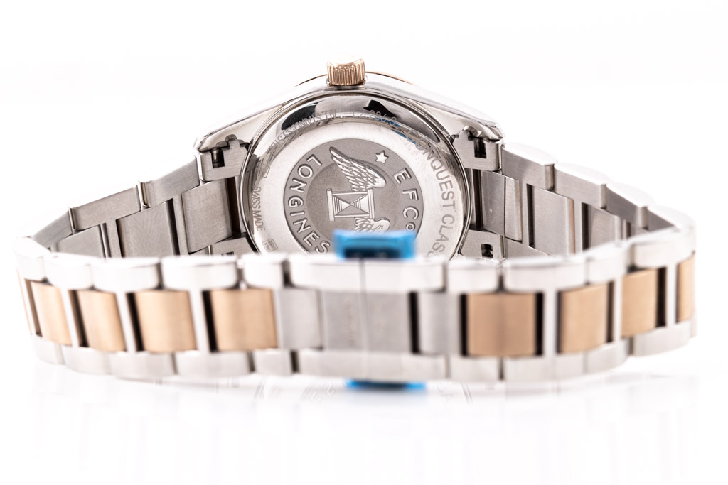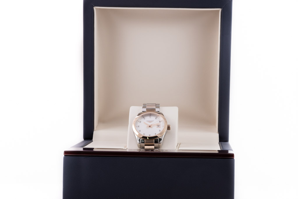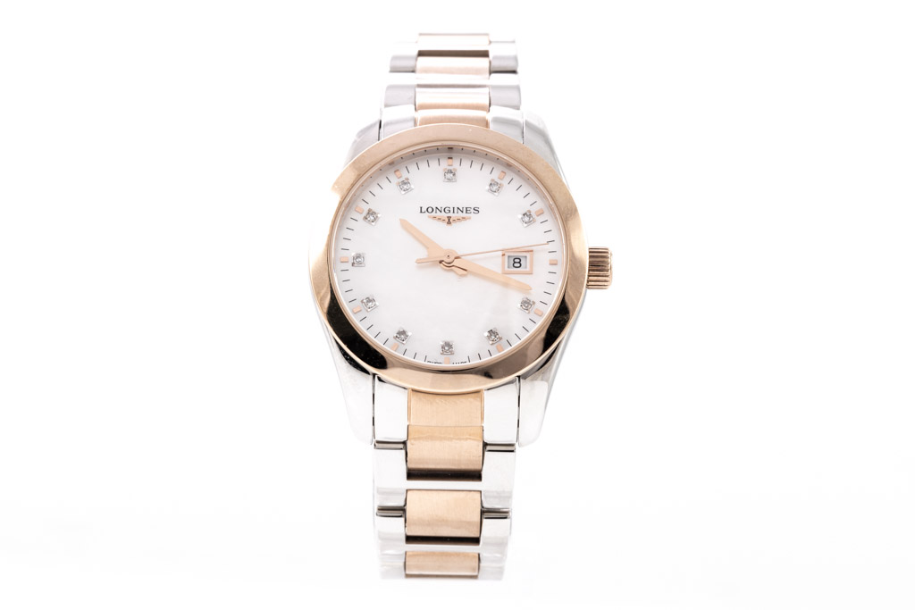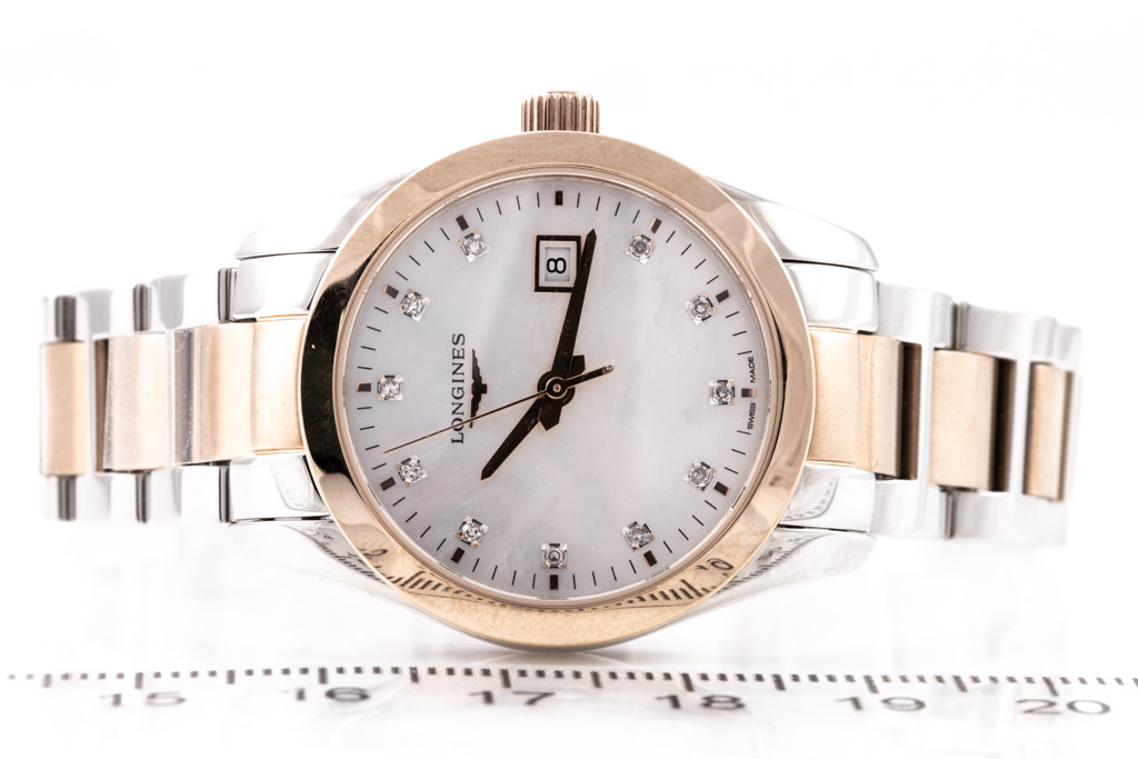 Longines Conquest Classic rose gold PVD coating and stainless steel quartz ladies watch. Mother of Pearl dial, date, Diamond indicators, case diameter: 29.5mm, wrist size: 18cm, Swiss made. Ref#L22863877. With Longines two tone bracelet and clasp. With Longines International Warranty card - to be registered online, details will be provided. With Longines Diamond Certificate card and Longines box. (As New, Note: minor scratches on case and bracelet due to display stock)