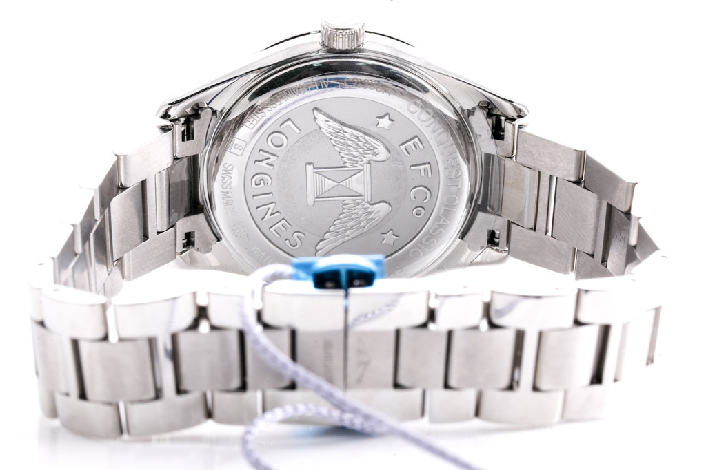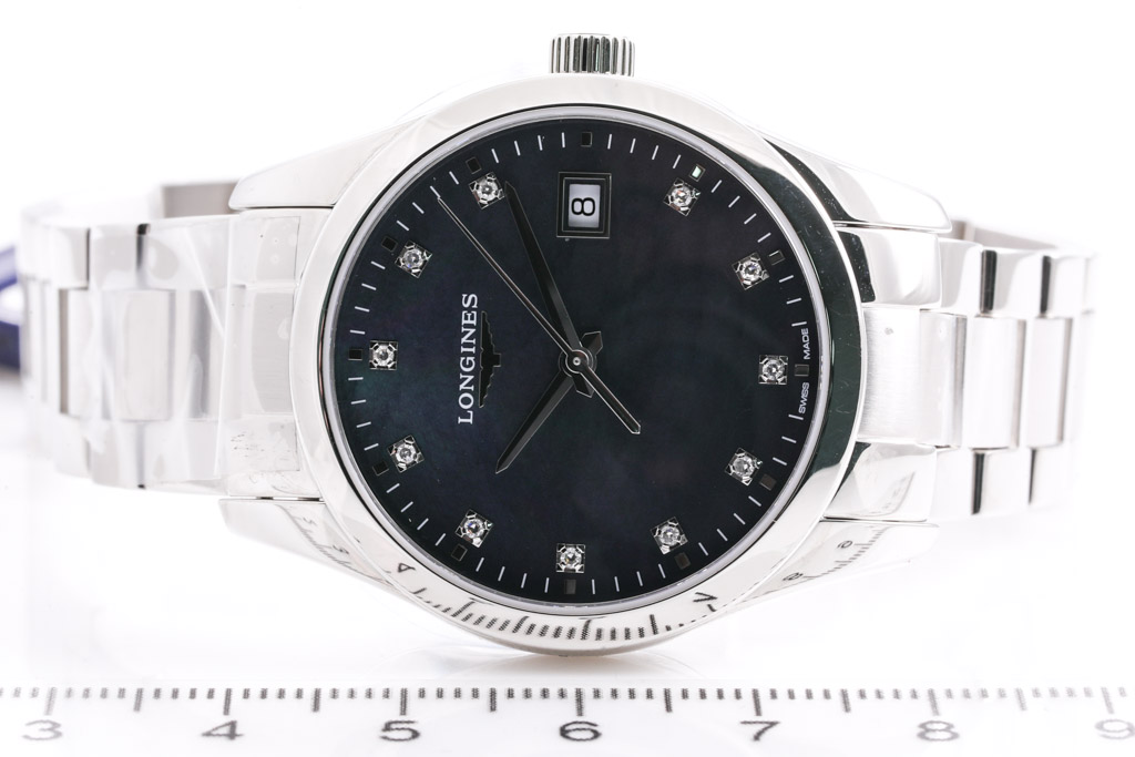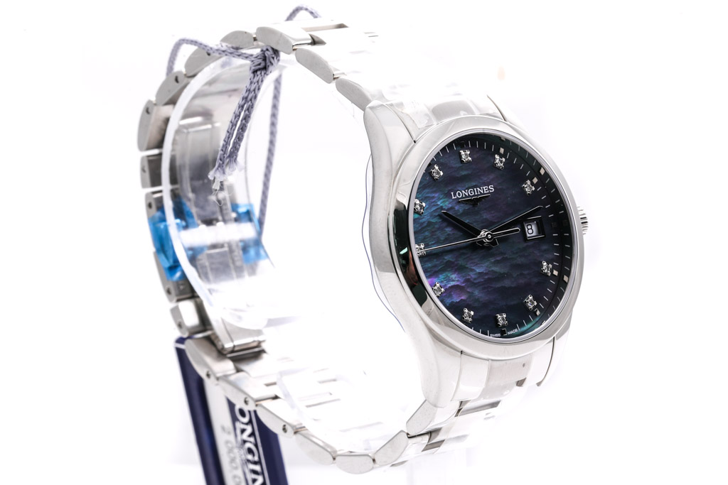 Longines Conquest Classic stainless steel quartz watch. Mother of Pearl dial, Diamond indicators, date, case diameter: 34mm, wrist size: 18cm, Swiss made. Ref# L23864886. With Longines stainless steel bracelet and clasp. With Longines International Warranty card - to be registered online and details will be provided. With Longines Diamond Certificate card and Longines box. (As New, Note: minor scratches on case and bracelet due to being display stock)