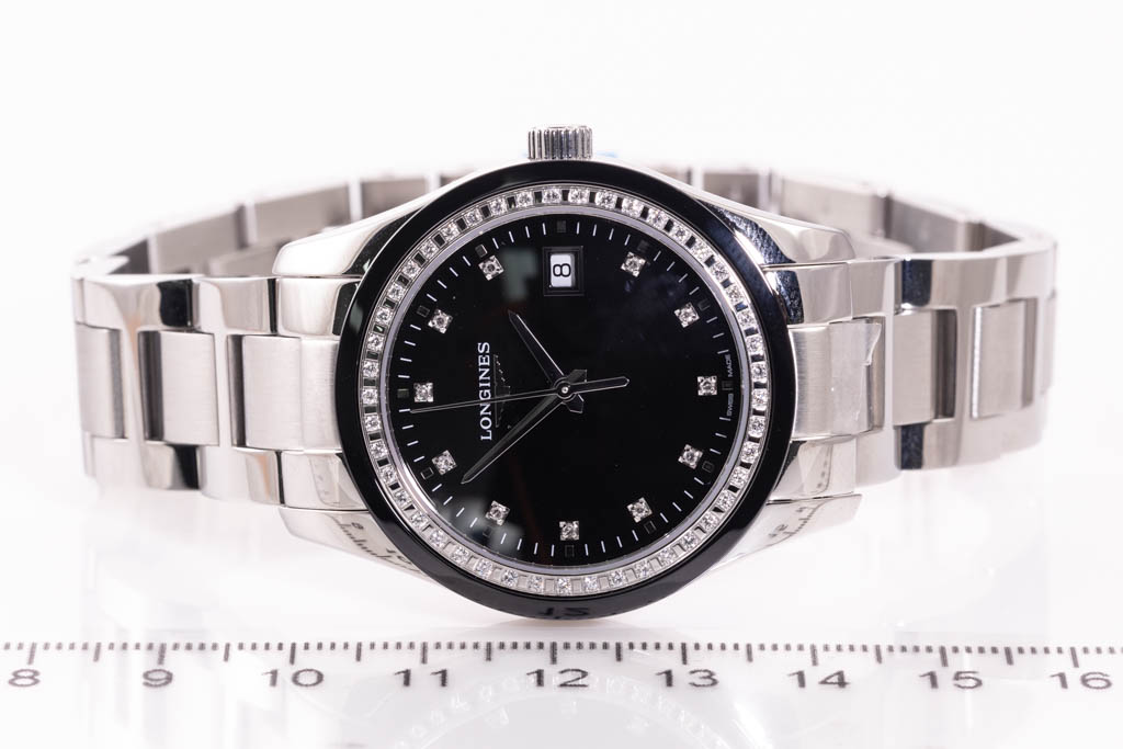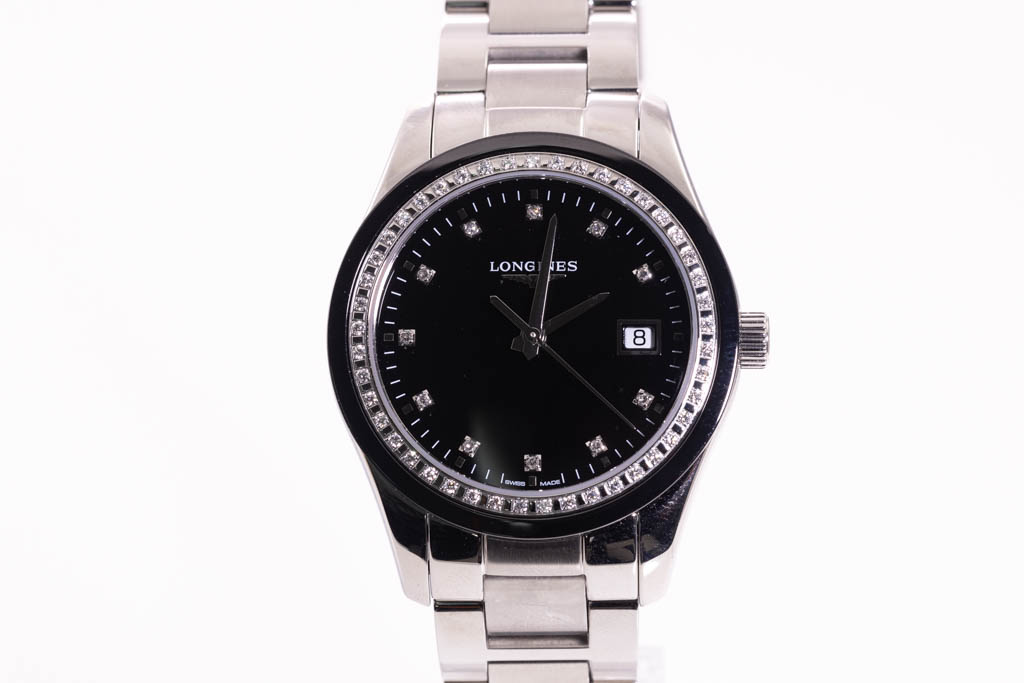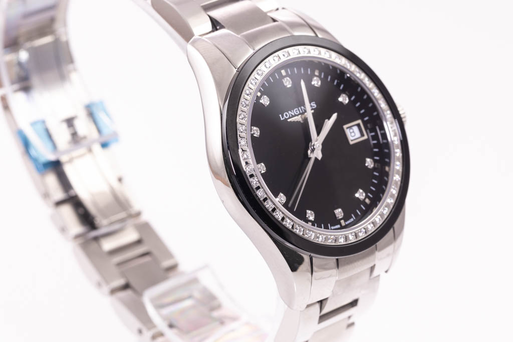 Longines Conquest Classic stainless steel quartz watch. Mother of Pearl dial, Diamond indicators, Diamond set bezel, date, case diameter: 36mm, wrist size: 20cm, Swiss made. Ref# L2.387.0.57.6. With Longines stainless steel bracelet and clasp. With Longines Diamond Certificate card and Longines box. 3 month FSA warranty. (As New, Note: minor scratches on case due to being display stock and bracelet in original wrapping)