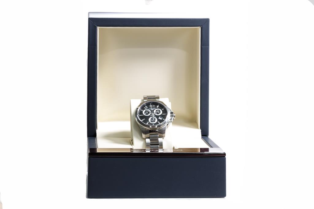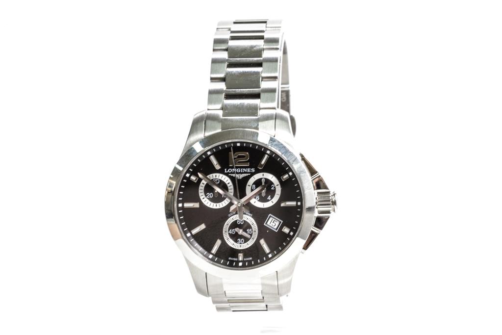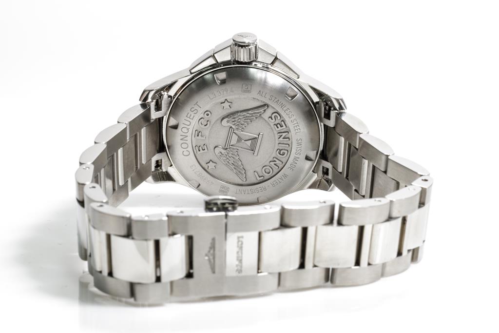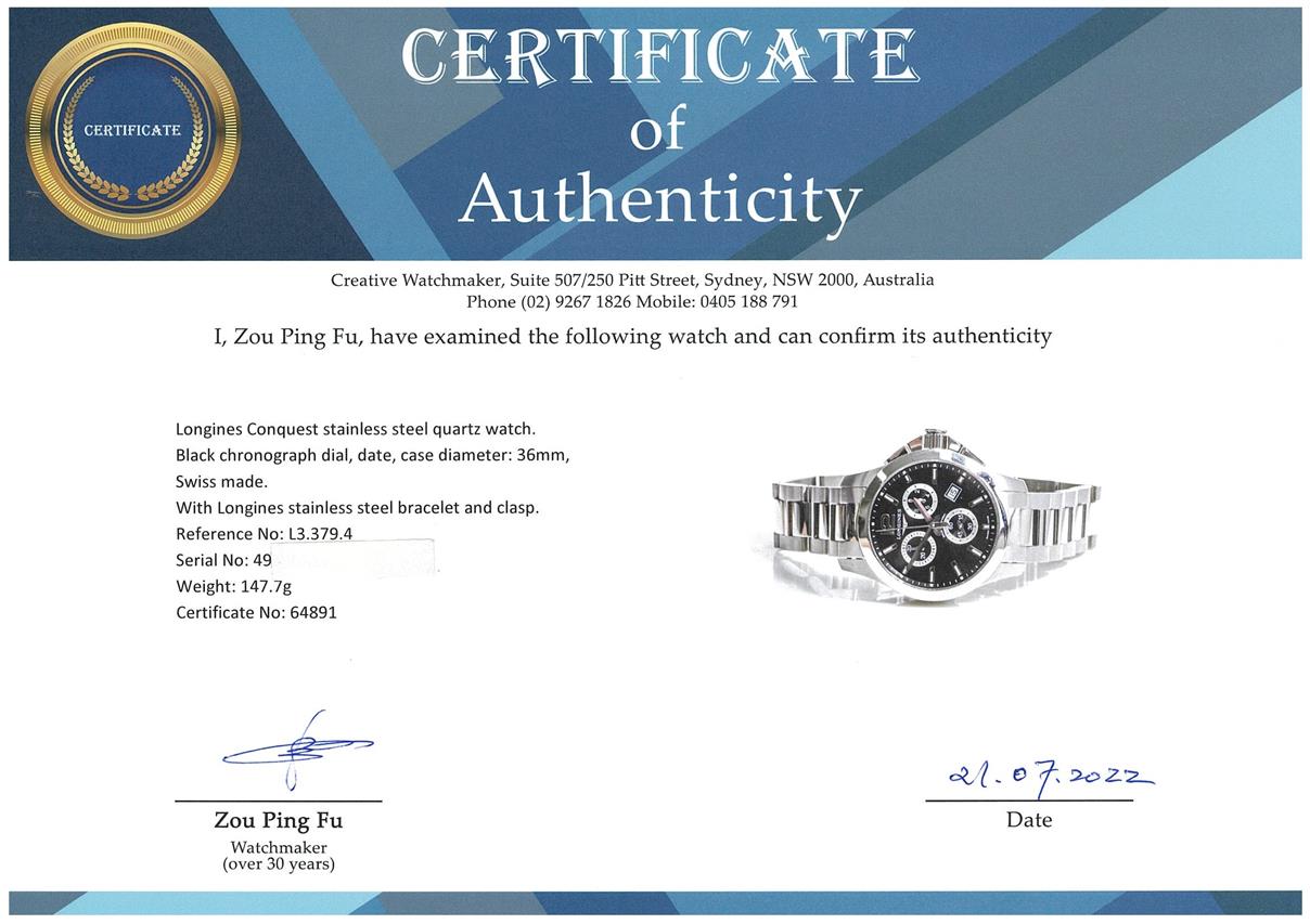 Longines Conquest stainless steel quartz watch. Black chronograph dial, date, case diameter: 36mm, wrist size: 20cm, Swiss made. Ref# L3.379.4. With Longines stainless steel bracelet and clasp. With Certificate of authenticity, Longines International Warranty Card and Longines box. 3 month FSA warranty. (Pre-owned)