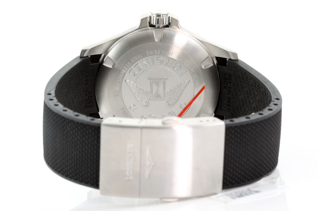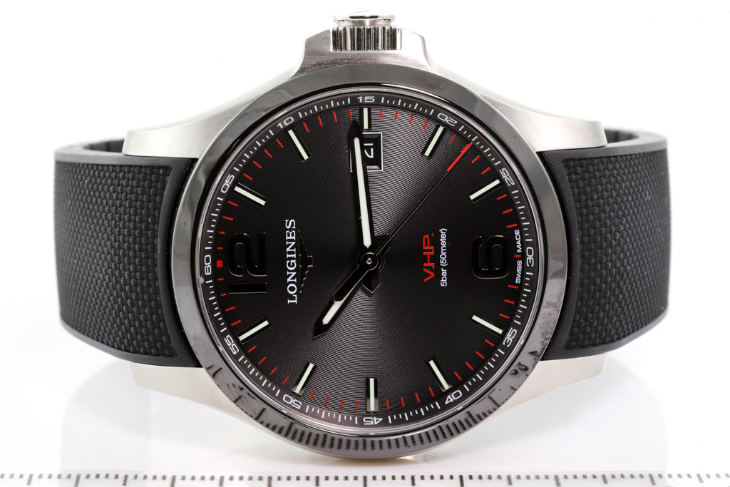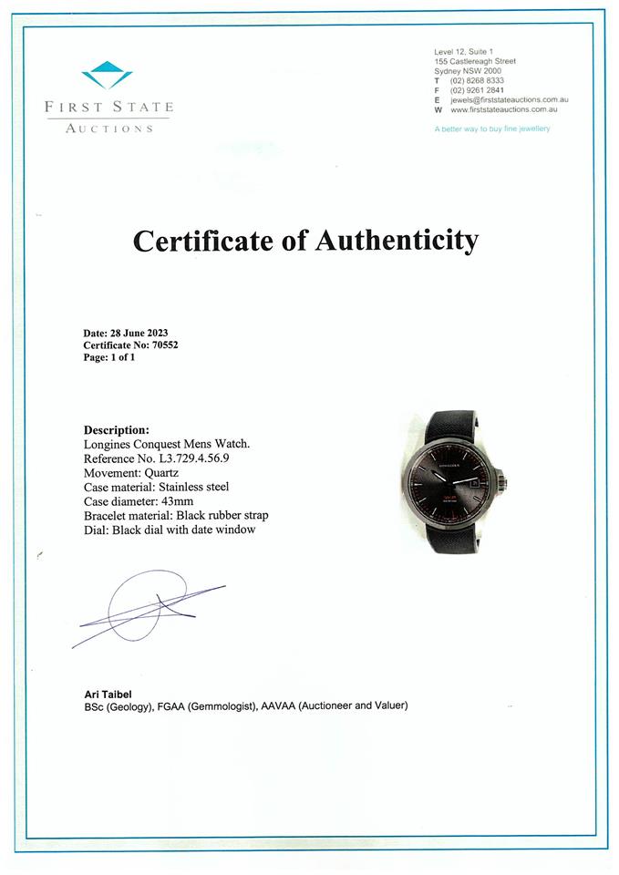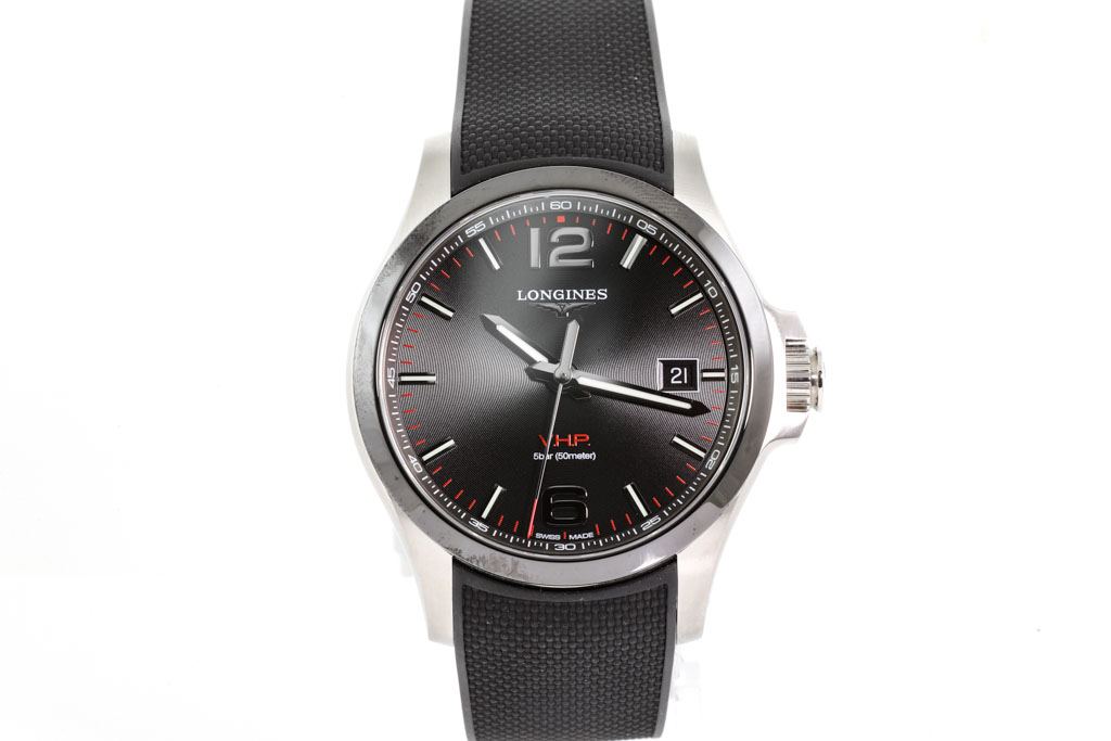 Longines Conquest stainless steel quartz mens watch. Black dial, date, case diameter: 43mm, wrist size: 21cm, Swiss made. Ref# L3.729.4.56.9. With Longines black rubber strap and clasp. With FSA Certificate of Authenticity and Longines box. 3 month FSA warranty. (As New, Note: minor scratches on case due to being display stock)