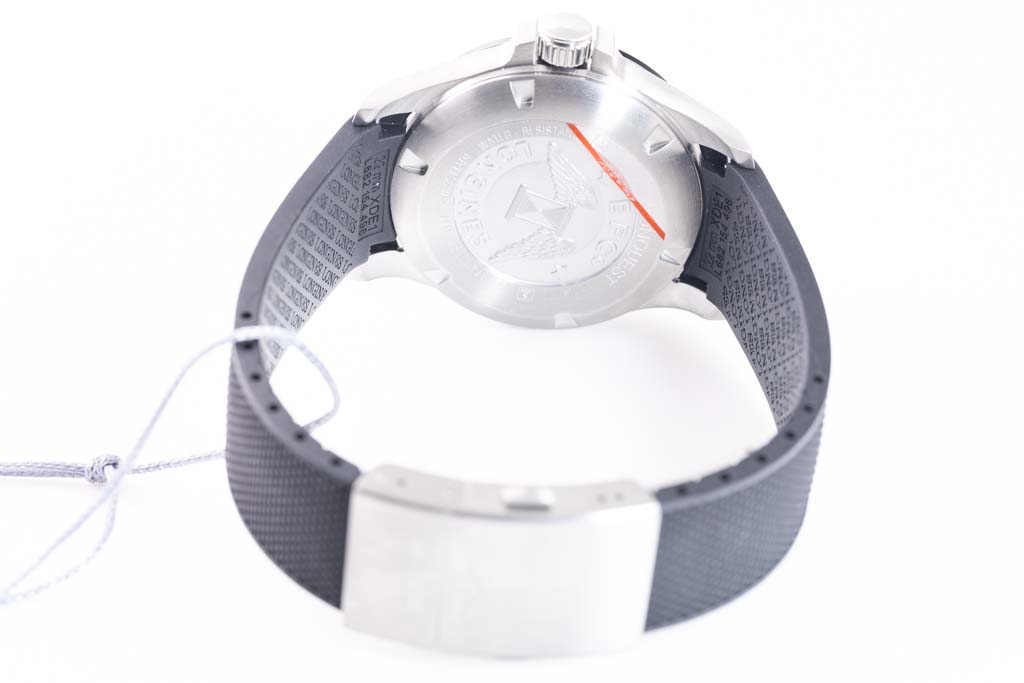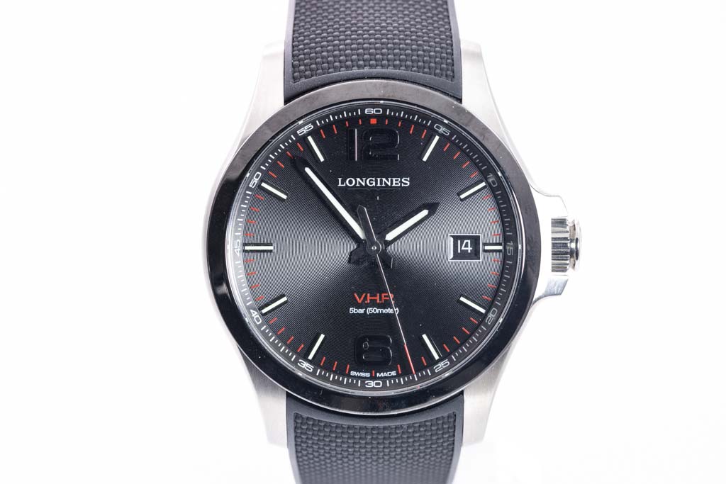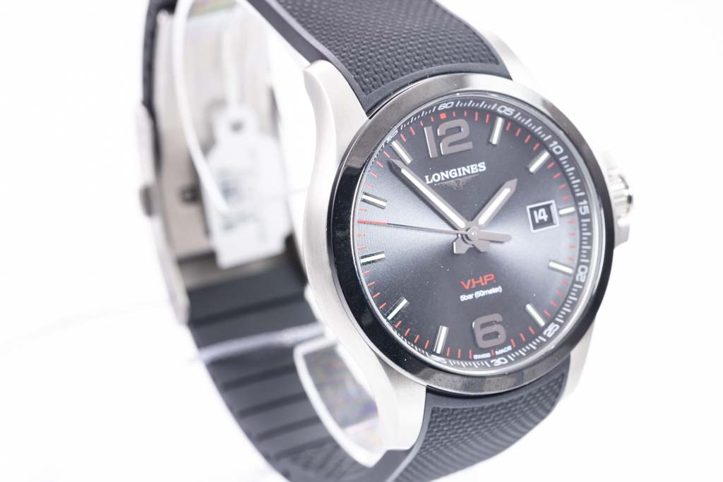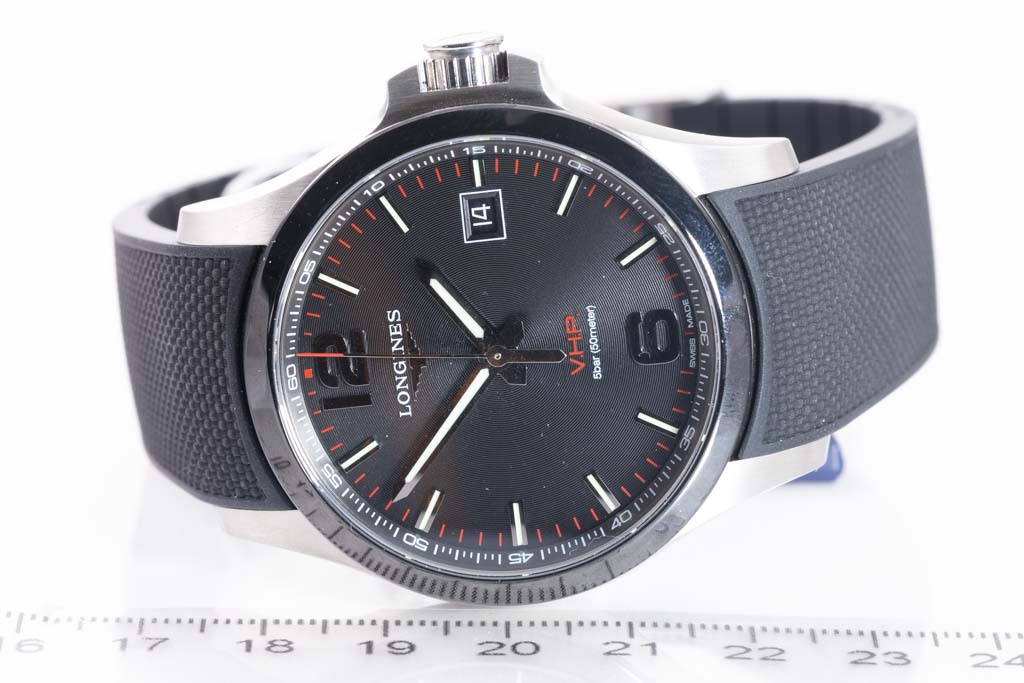 Longines Conquest stainless steel quartz mens watch. Black dial, date, case diameter: 43mm, wrist size: 21cm, Swiss made. Ref# L3.729.4.56.9. With Longines black rubber strap and stainless steel clasp. With FSA Certificate of Authenticity and Longines box. 3 month FSA warranty. (As New)