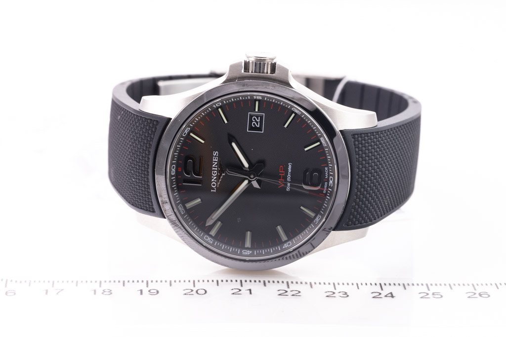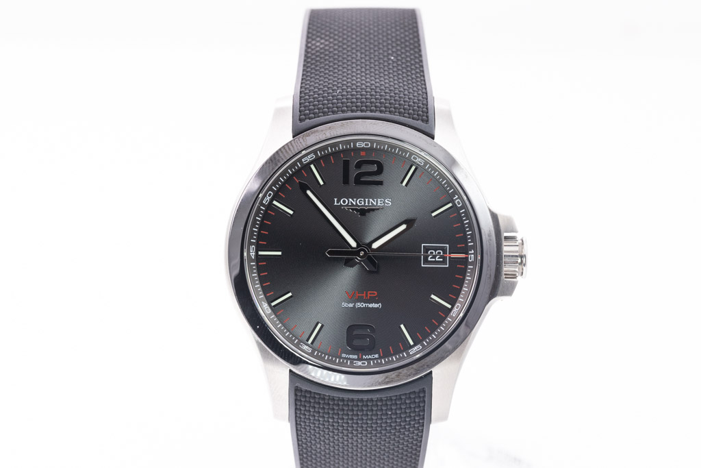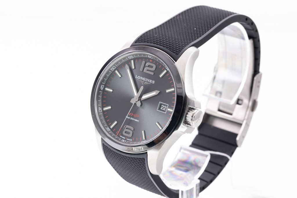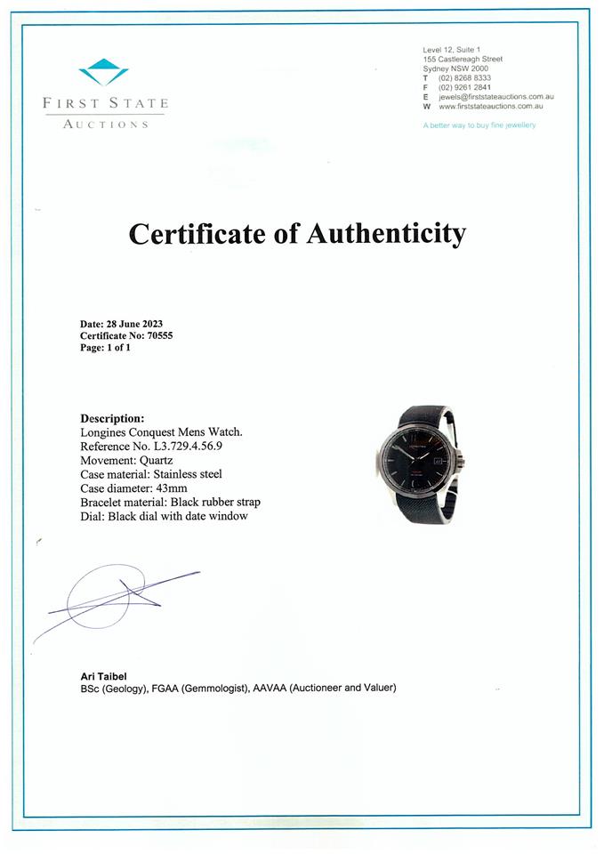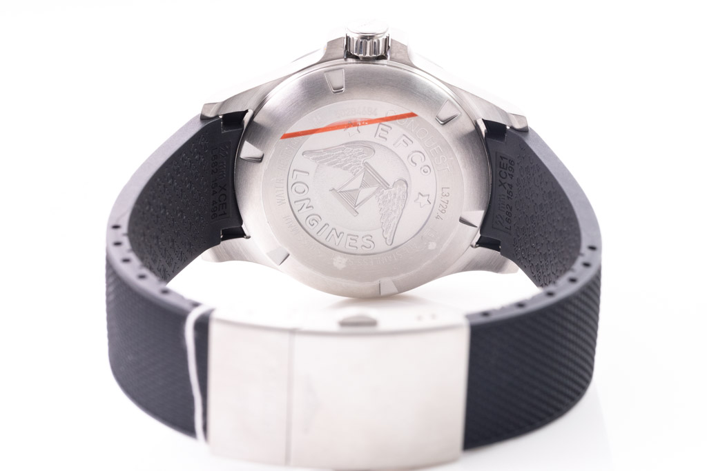 Longines Conquest stainless steel quartz mens watch. Black dial, date, stainless steel case, case diameter: 43mm, wrist size: 21cm, Swiss made. Ref# L3.729.4.56.9. With Longines black rubber strap and stainless steel clasp. With FSA Certificate of Authenticity and Longines box. 3 month FSA warranty. (As New, Note: minor scratches on case due to being display stock)