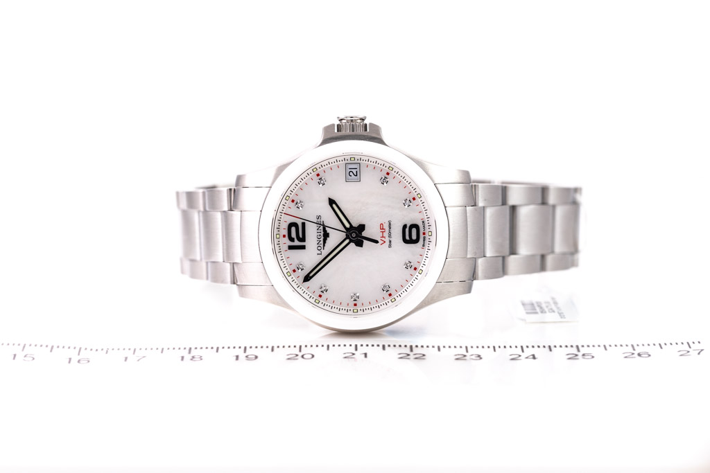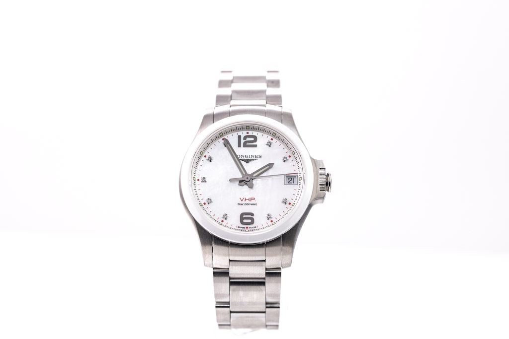 Longines Conquest V.H.P. stainless steel quartz ladies watch. Mother of Pearl dial, Diamond indicators, date, case diameter 36mm, wrist size: 19cm, Swiss made. Ref# L3.319.4.87.6. With Longines stainless steel bracelet and clasp. With Longines Diamond Certificate card and Longines box. 3 month FSA warranty. (As New, Note: minor scratches on case and bracelet due to being display stock)