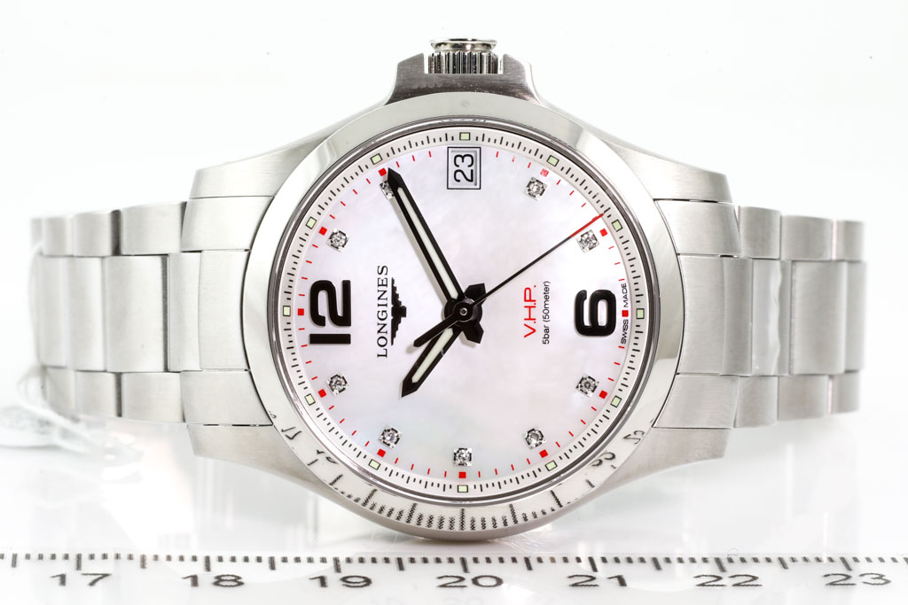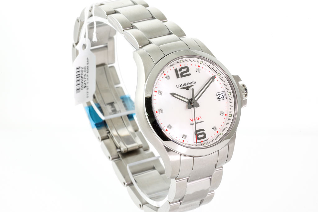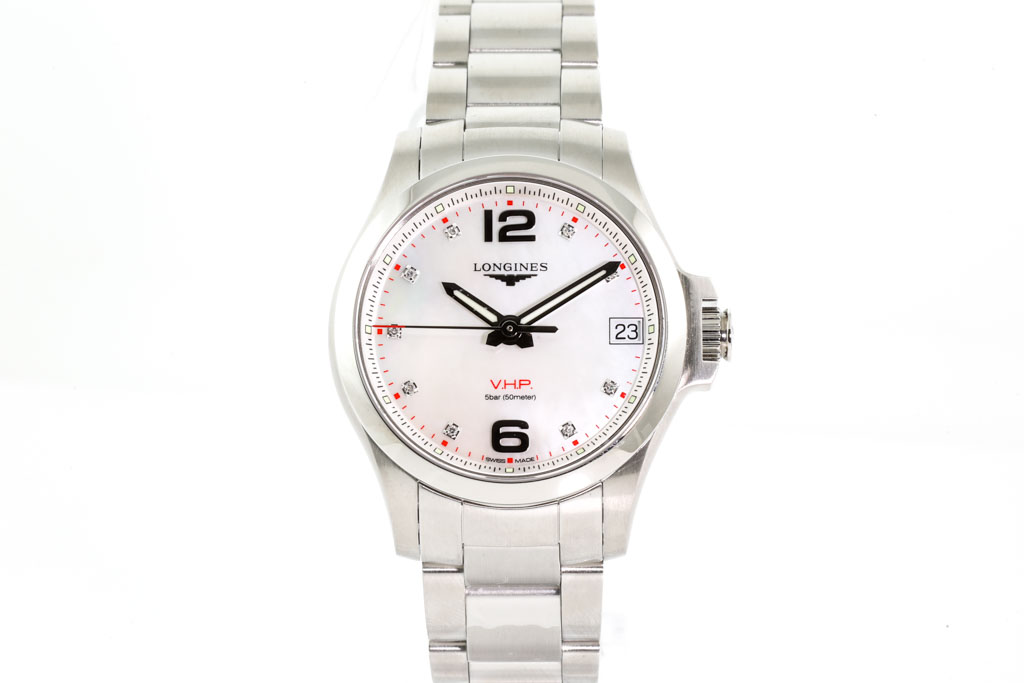 Longines Conquest V.H.P stainless steel quartz mens watch. Mother of Pearl dial, Diamond indicators, date, case diameter: 36mm, wrist size: 19cm, Swiss made. Ref# L3.316.4.87.6. With Longines stainless steel bracelet and clasp. With Longines Diamond Certificate card and Longines box. 3 month FSA warranty. (As New, Note: minor scratches on bracelet and case due to being display stock)