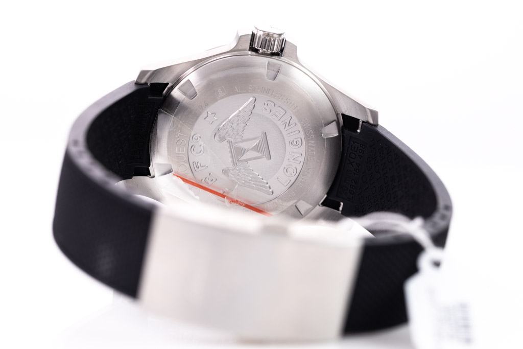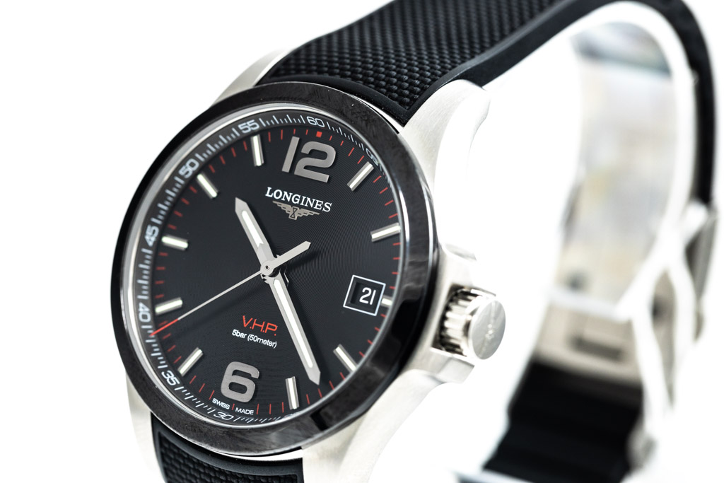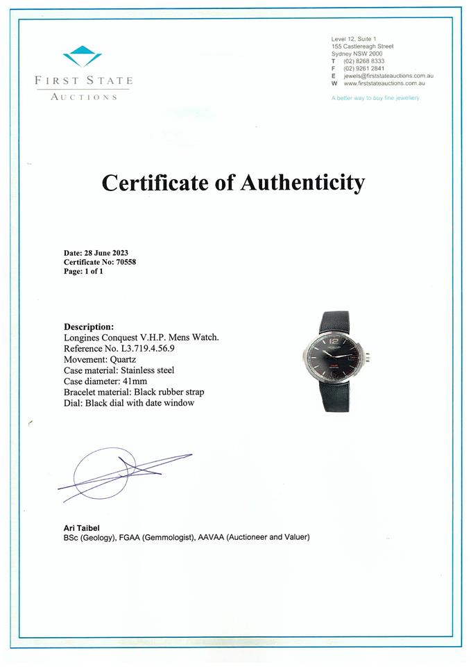 Longines Conquest V.H.P. stainless steel quartz mens watch. Black dial, date, case diameter: 41mm, wrist size: 21cm, Swiss made. Ref# L3.719.4.56.9. With Longines black rubber strap and stainless steel clasp. With FSA Certificate of Authenticity and Longines box. 3 month FSA warranty. (As New, Note: minor scratches on case due to being display stock)