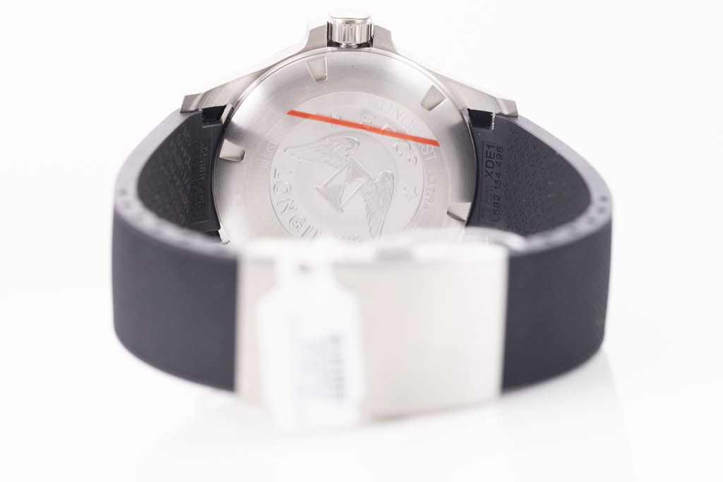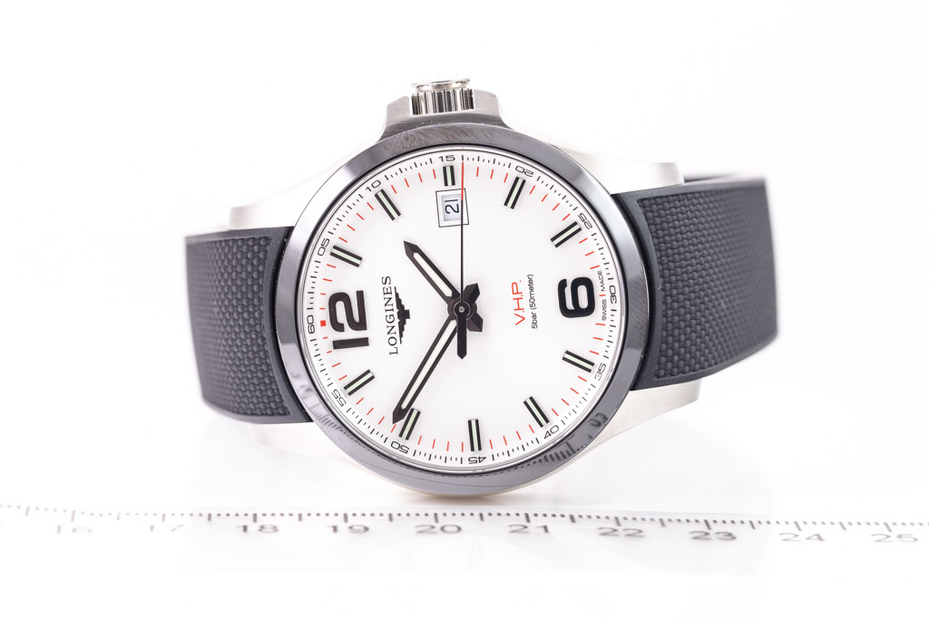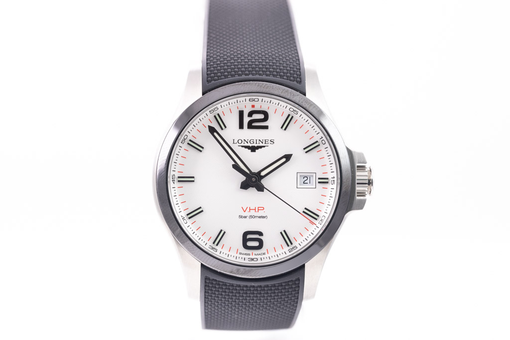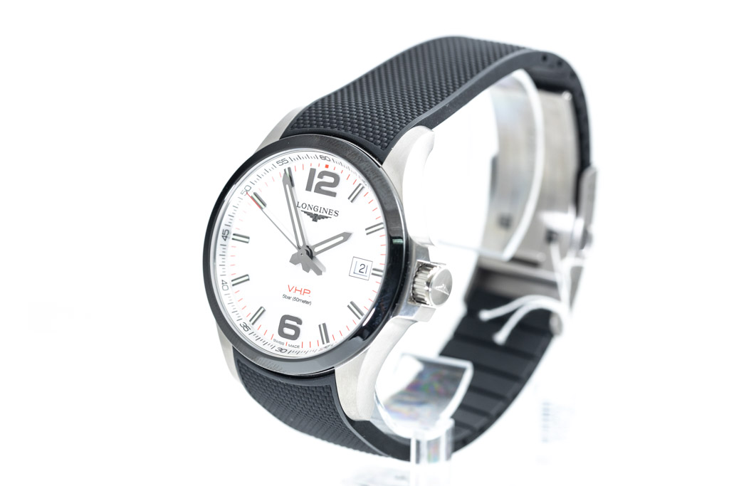 Longines Conquest V.H.P. Perpetual quartz mens watch. Silver dial, date, stainless steel case, case diameter: 43mm, wrist size: 20.5cm, Swiss made. Ref# L3.729.4.76.9. With Longines black rubber strap and stainless steel clasp. With FSA Certificate of Authenticity and Longines box. 3 month FSA warranty. (As New, Note: minor scratches on case due to being display stock)