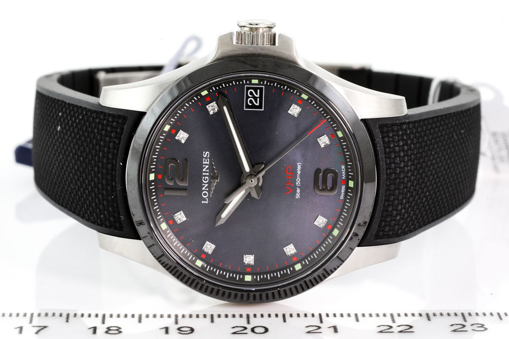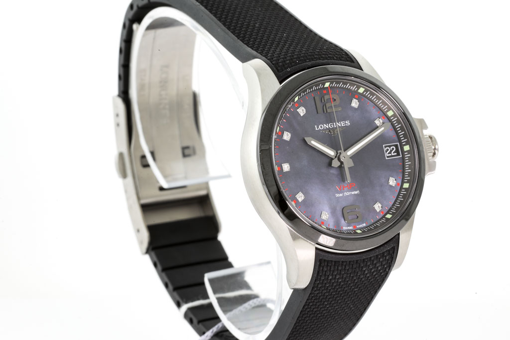 Longines Conquest V.H.P. stainless steel quartz watch. Mother of Pearl dial, Diamond indicators, date, case diameter 36mm, wrist size: 20.5cm, Swiss made. Ref# L3.319.4.88.9. With Longines black rubber strap and clasp. With Longines Diamond Certificate card and Longines box. 3 month FSA warranty. (As New, Note: minor scratches on case due to being display stock)