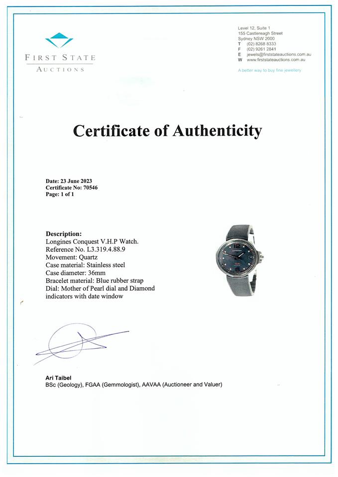 Longines Conquest V.H.P. stainless steel quartz watch. Mother of Pearl dial, Diamond indicators, date, case diameter: 36mm, wrist size: 20.5cm, Swiss made. Ref# L3.319.4.88.9. With Longines rubber strap and clasp. With FSA Certificate of Authenticity and Longines box. 3 month FSA warranty. (As New, Note: minor scratches on case due to being display stock)