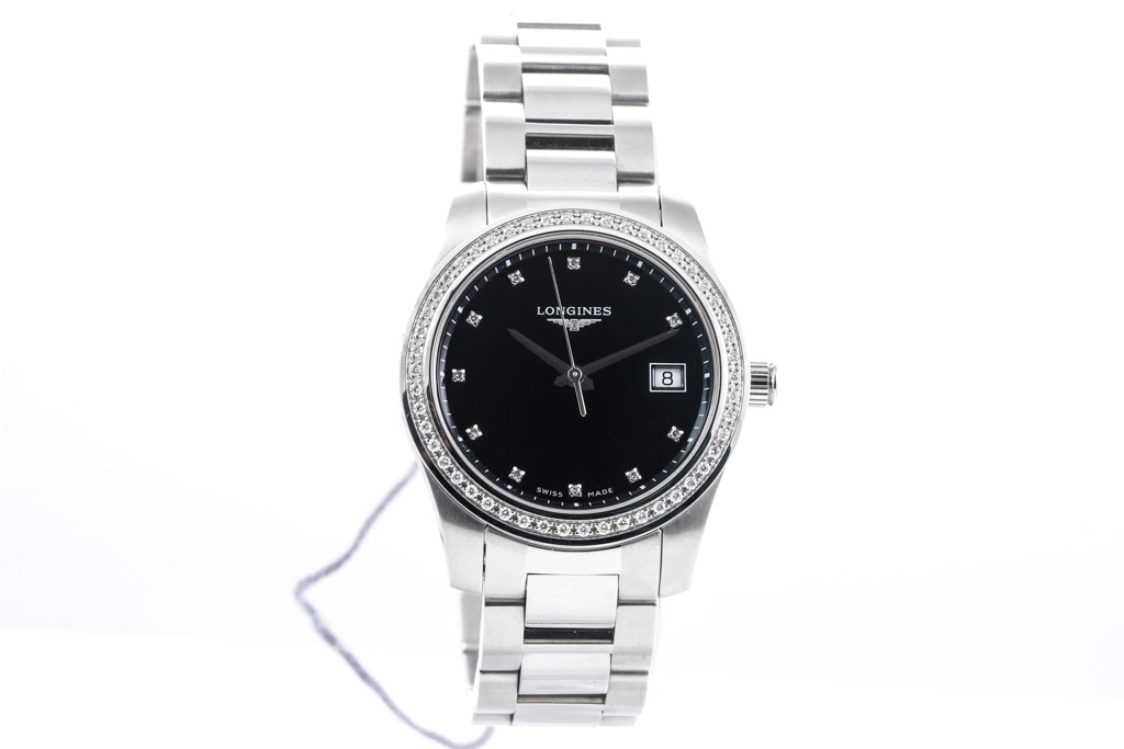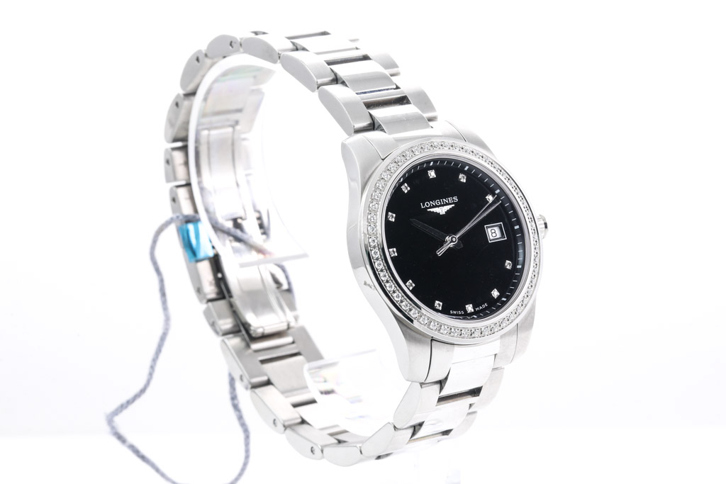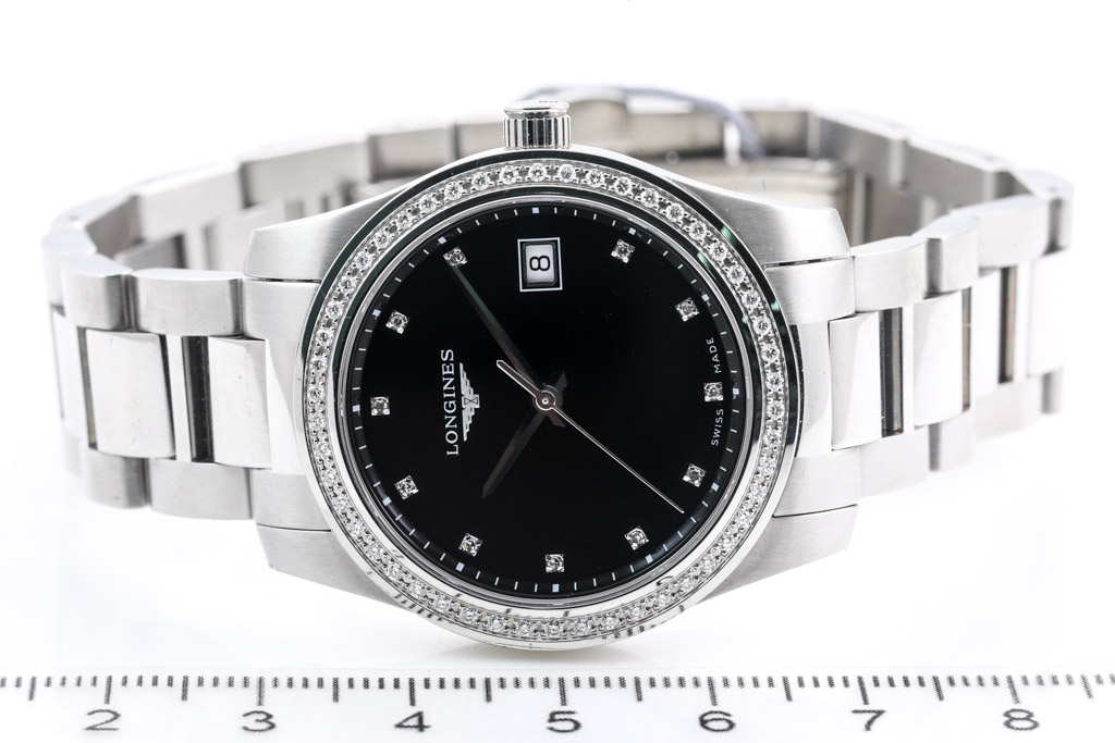 Longines Conquest stainless steel automatic watch. Black dial, date, Diamond indicators, Diamond set bezel, case diameter: 34mm, wrist size: 20cm, Swiss made. Ref# L34000576. With Longines stainless steel bracelet and clasp. With Longines International Warranty card, Longines Diamond Certificate card and Longines box. Longines 2 year warranty applies. (As New, Note: minor scratches on case and bracelet due to being display stock)